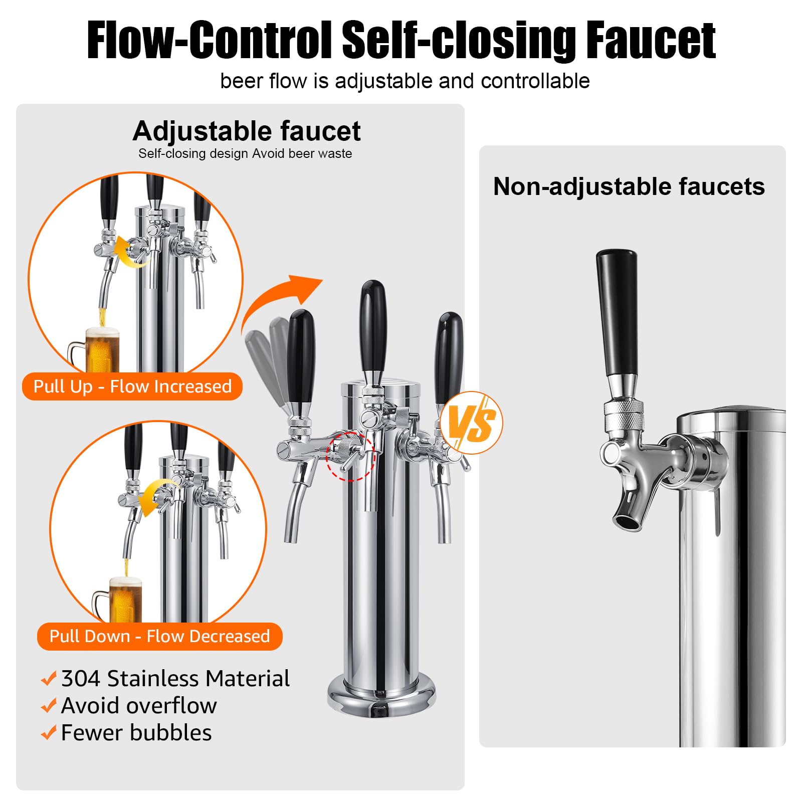 Adjustable Flow & Self-closing Beer Faucets: Equipped with self-closing adjustable taps, the beer flow can be precisely regulated by moving the control lever up or down, preventing over-pouring and minimizing waste. This design is particularly beneficial for craft beers or high-foam beverages, offering better control compared to traditional non-adjustable beer faucets tower.