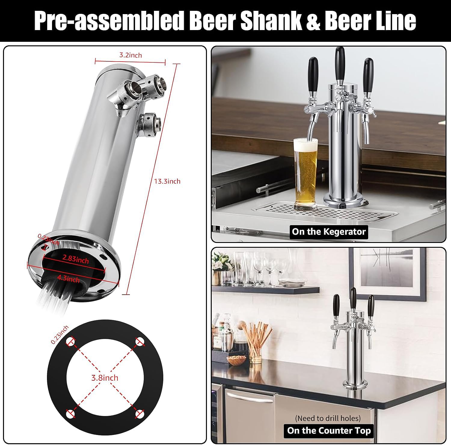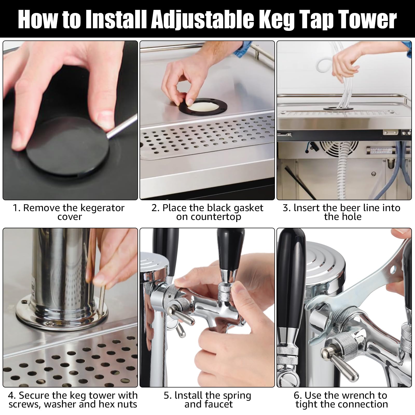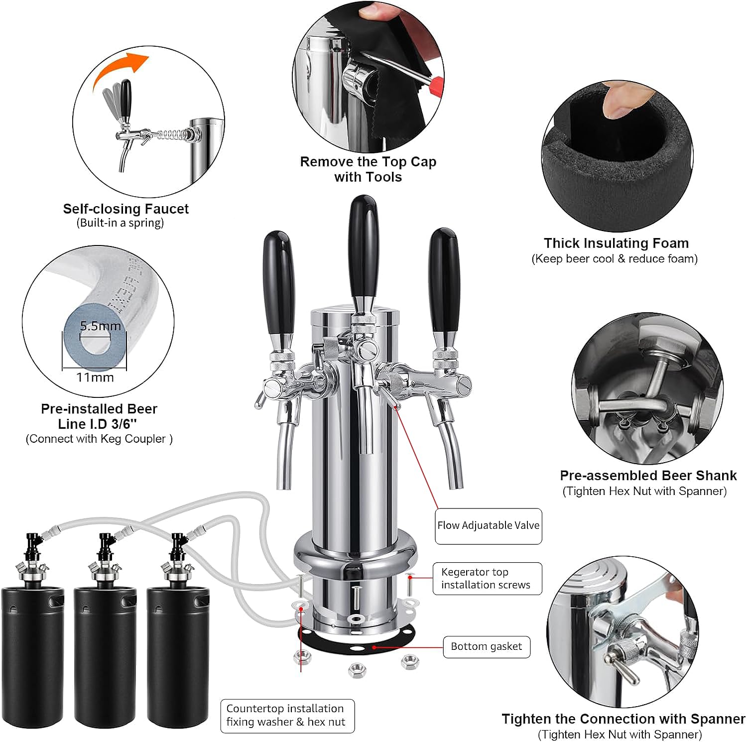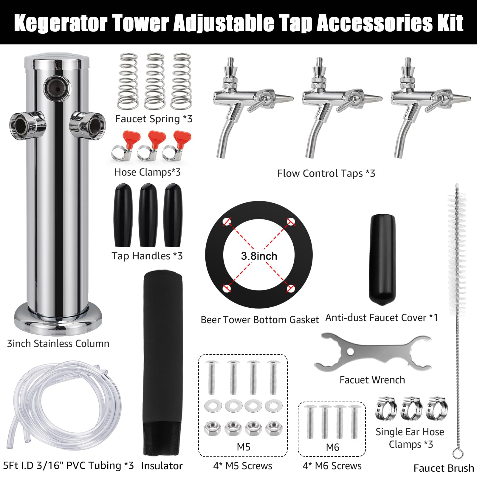 Triple Tap Kegerator Tower Kit: This beer tap tower includes a complete set of kegerator parts: 1* 3'' stainless steel tower, 3* 5ft ID 3/16'' pre-assembled beer lines, 3* flow control beer faucets, faucet covers, a faucet brush, 3* tap handles, screws,washers,nuts,gasket,6* hose clamps and a faucet wrench. Following mounting steps, beer keg tower is easy to be set up on the kegerator or countertop in just minutes. Each component is robustly constructed to prevent leaks and ensure durability.