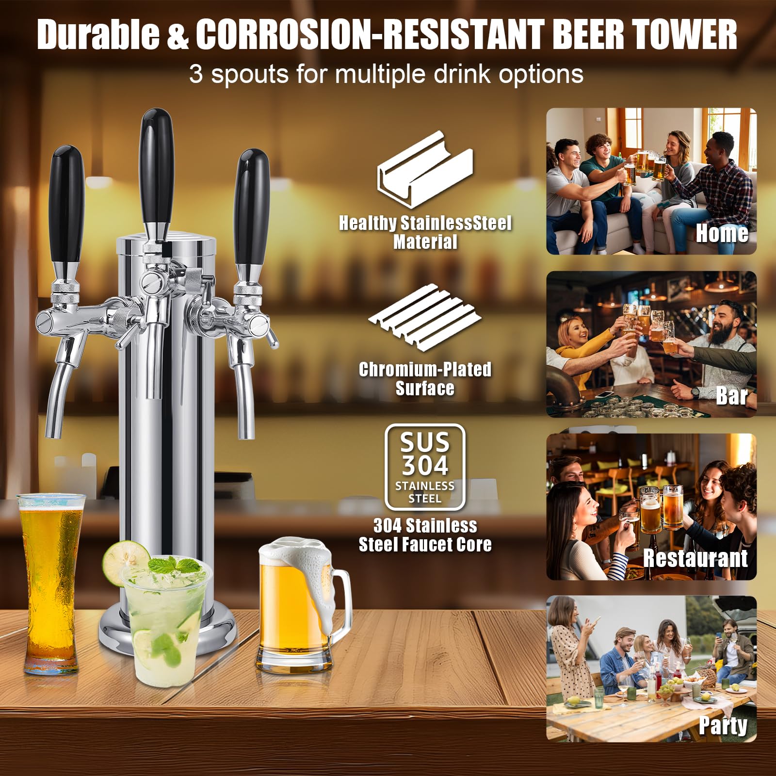 Premuim Material: The kegerator tower features a chrome-plated brass body with a polished surface and stainless steel core beer faucets. These materials are rust-proof and ensure direct beer contact safety, enhancing the longevity of the product.