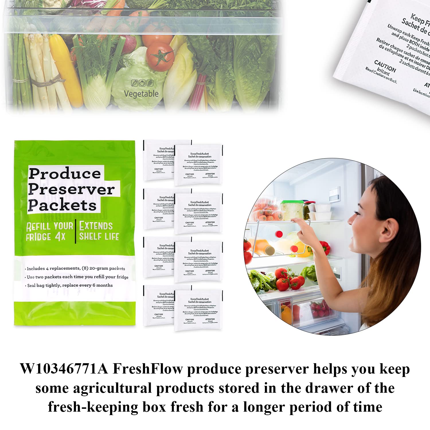 PREMIUM QUALITY & EASY INSTALLATION - Our W10346771A keep fresh packet replacement is made of 100% safe and environmentally friendly material well-tested by the manufacturer, with higher efficiency, and the best quality to meet OEM standards and pamper your health. Easy to use. Just throw the produce preserver packets in your refrigerator produce drawer to extend the life of your produce. Replace 2 pouches every 6 months for optimal freshness