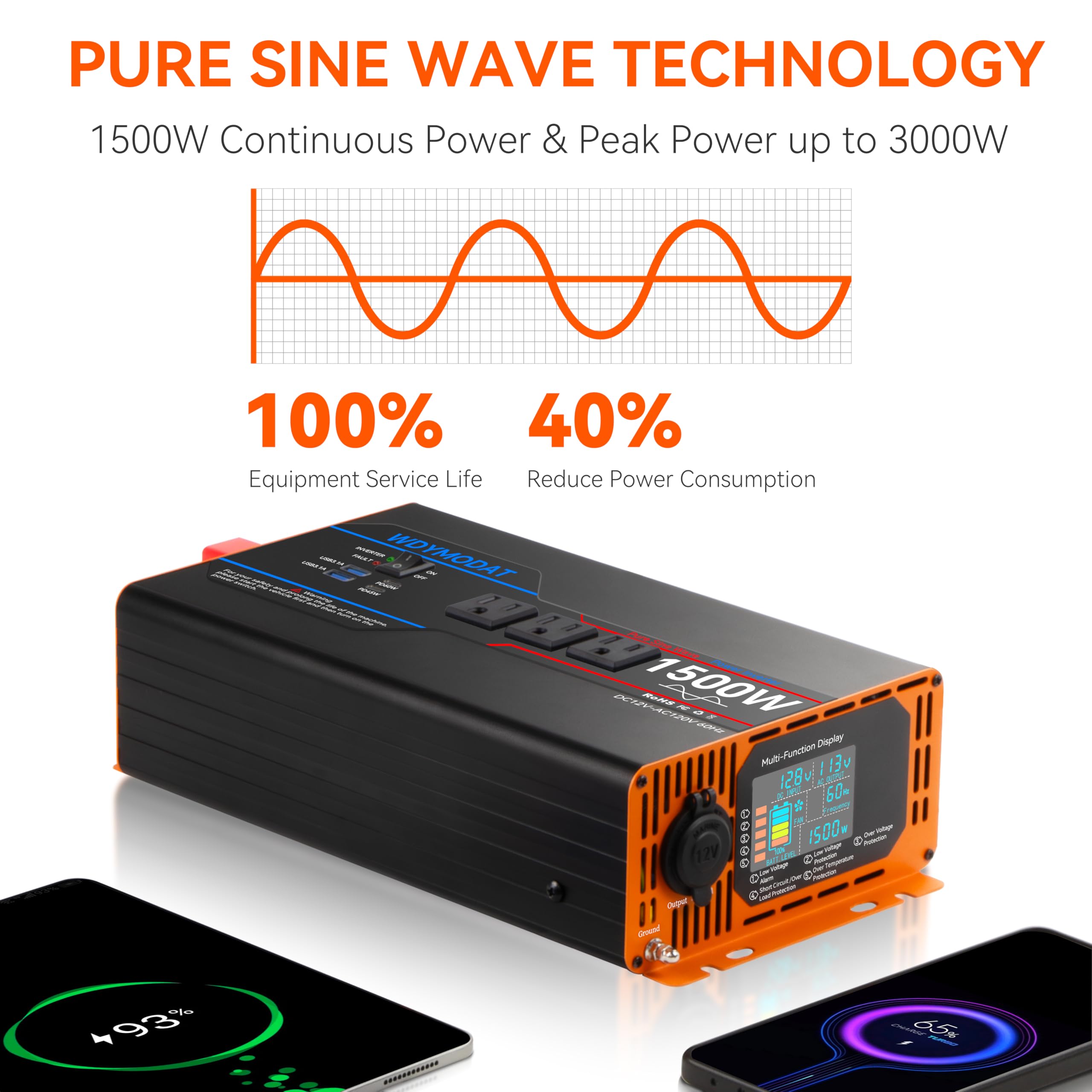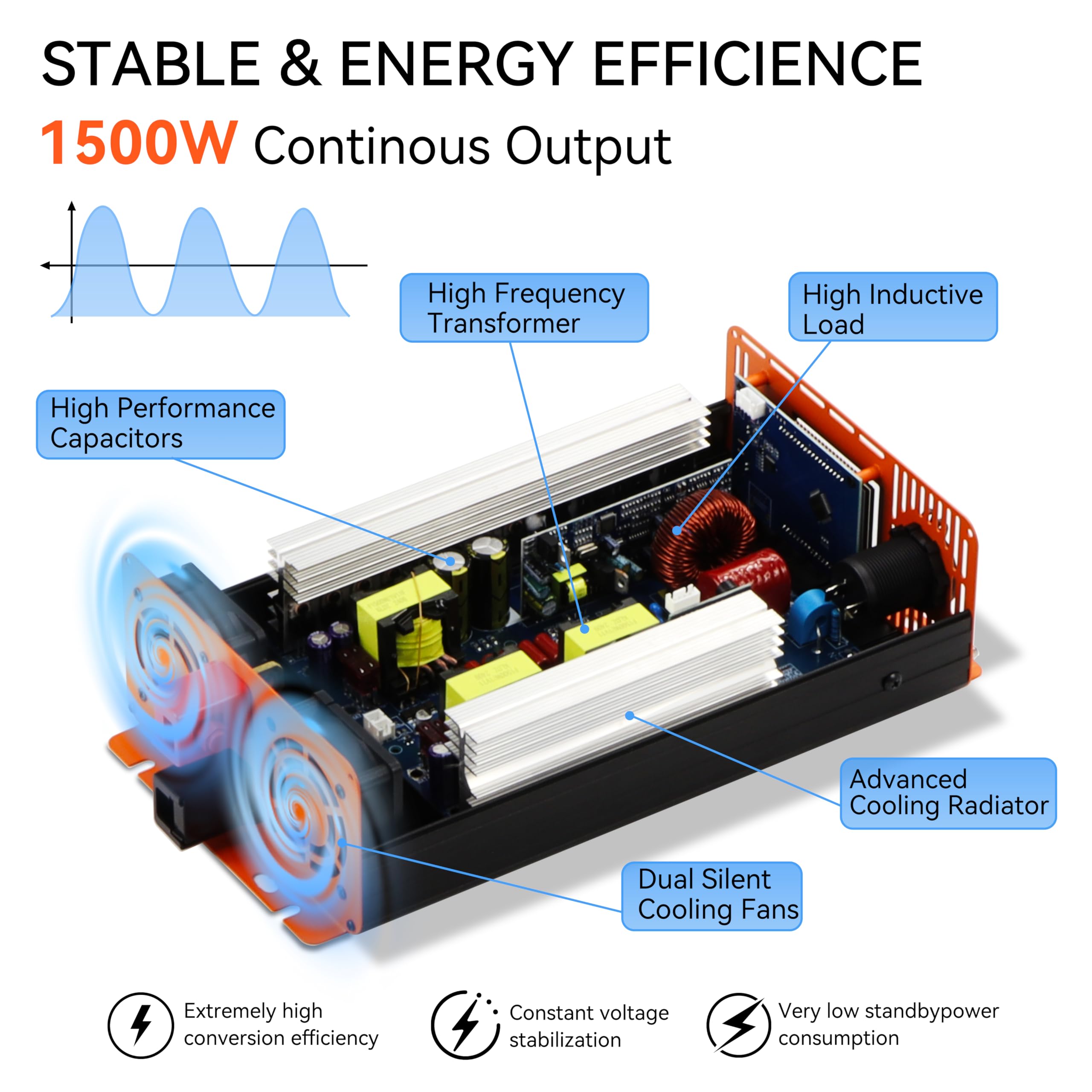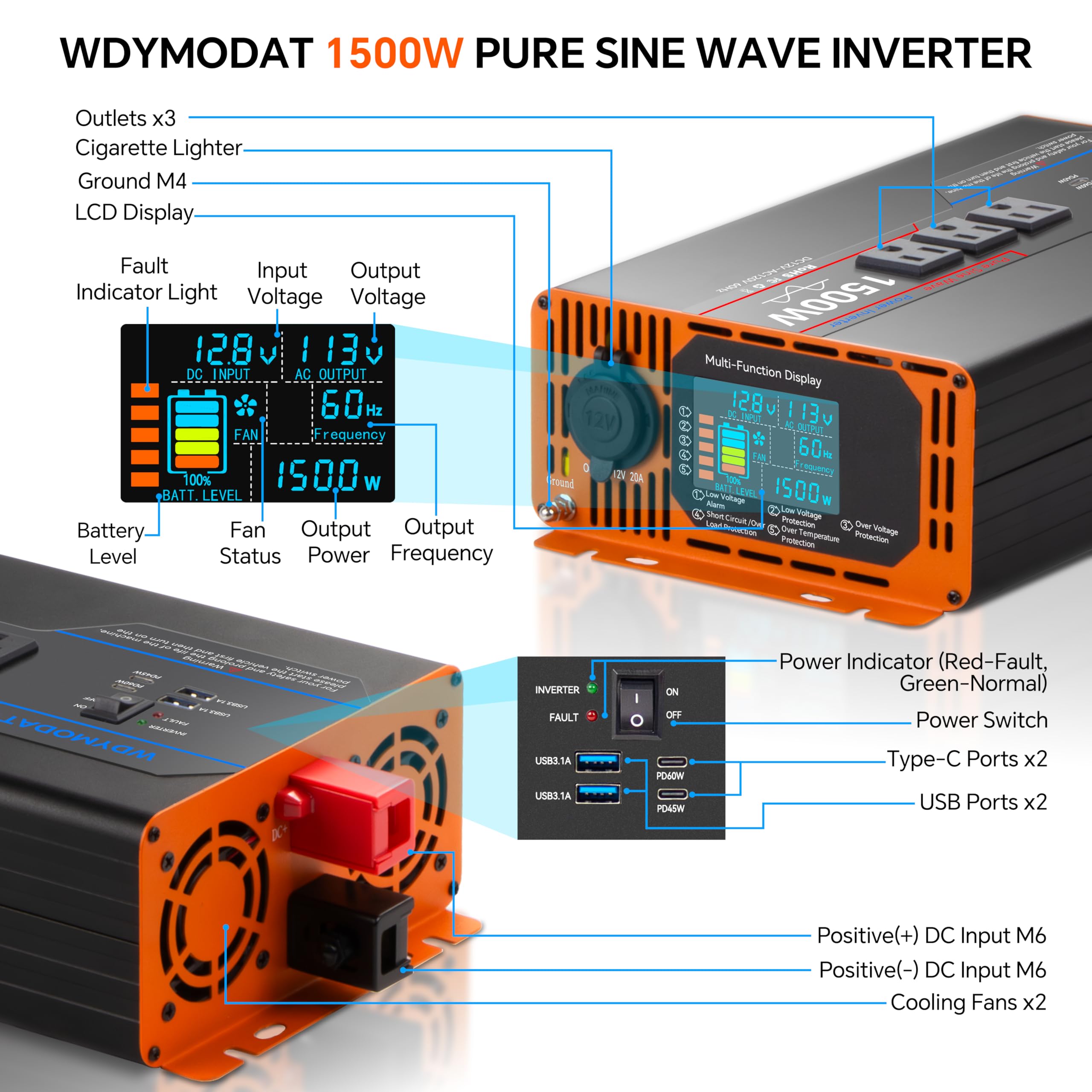 【WDYMODAT Pure Sine Wave Power Inverter】This inverter can efficiently convert 12V DC to 120V AC with 1500W continuous power and start instant output up to 3000W peak power output power. Adopting advanced pure sine wave technology, conversion efficiency ≥91%, with extremely high conversion efficiency and low energy consumption.