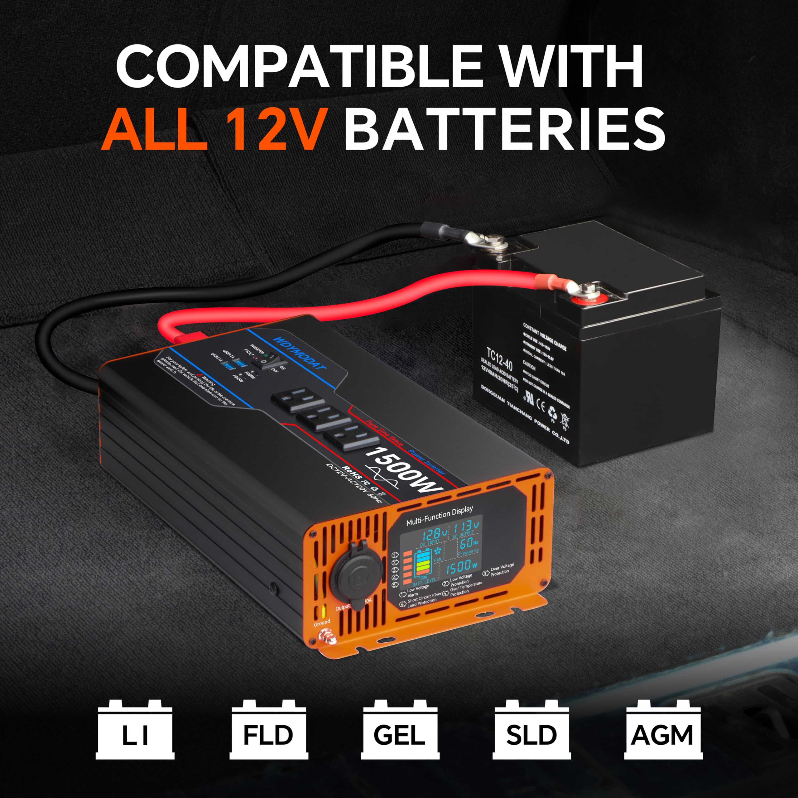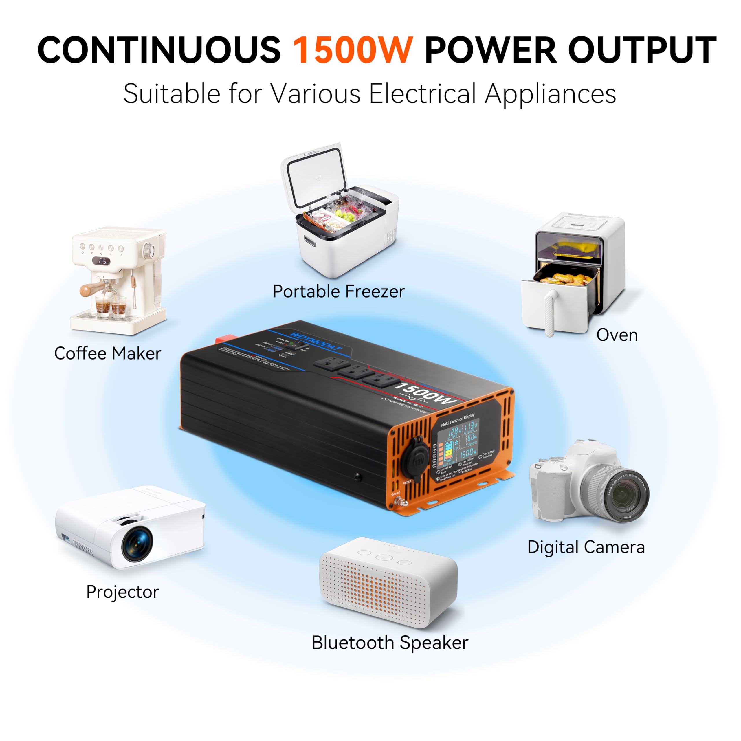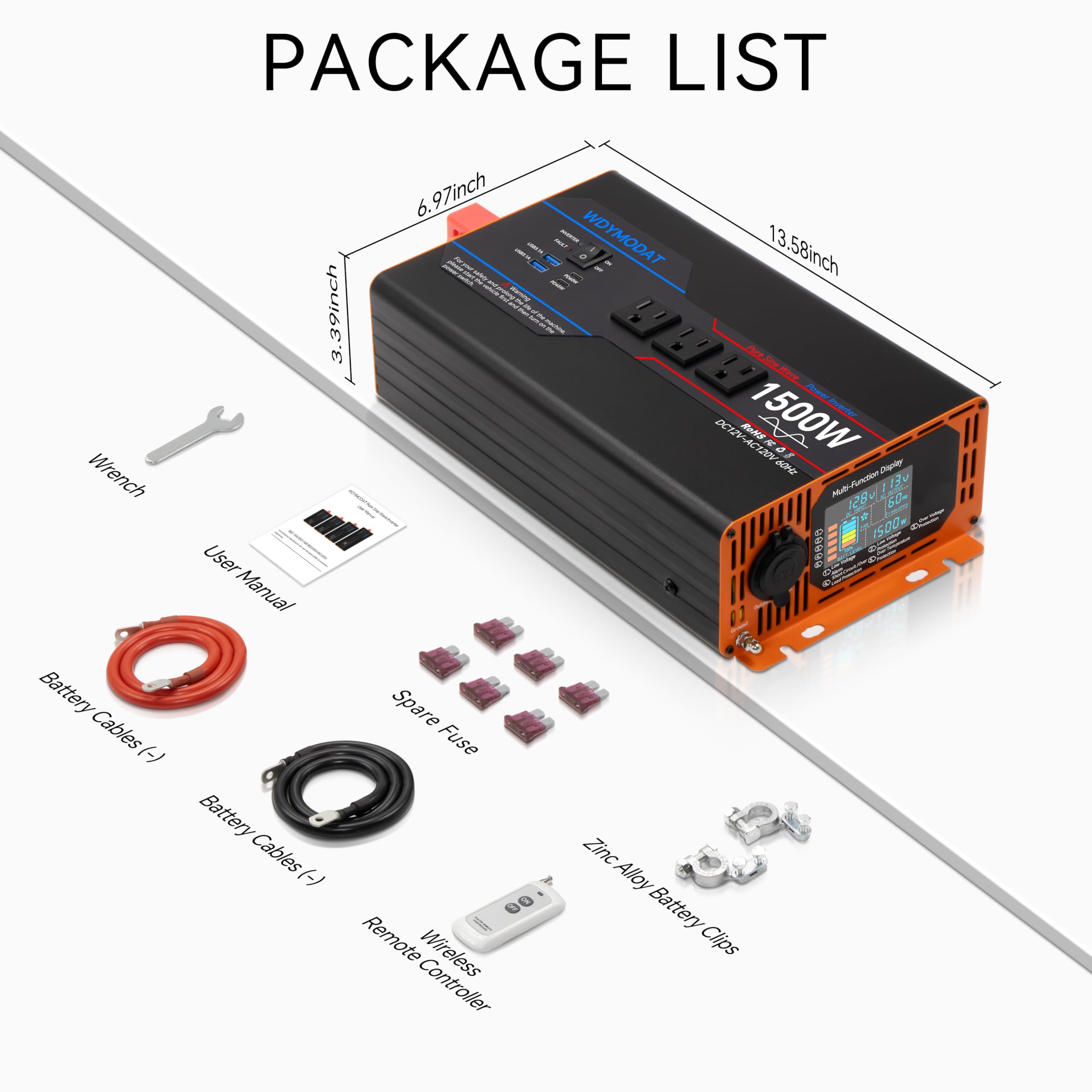 【WDYMODAT Pure Sine Wave Power Inverter】This inverter can efficiently convert 12V DC to 120V AC with 1500W continuous power and start instant output up to 3000W peak power output power. Adopting advanced pure sine wave technology, conversion efficiency ≥91%, with extremely high conversion efficiency and low energy consumption.