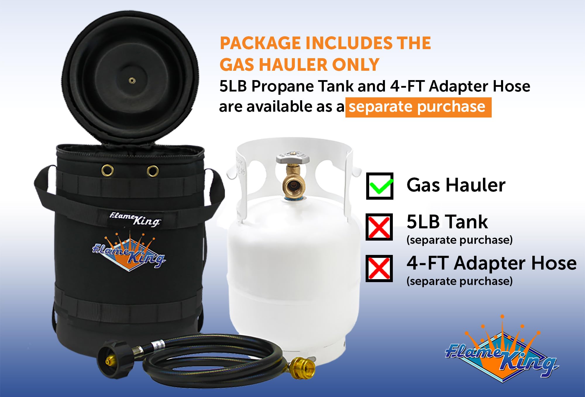 SIZE and COMPATIBILITY: Gas hauler measures 8.5X13.5 inches; lightweight at 1.15 pounds (when empty); perfectly fits the Flame King 5LB Steel tanks (NOT COMPATIBLE WITH THE FLAME KING 5LB ALUMINUM TANK)