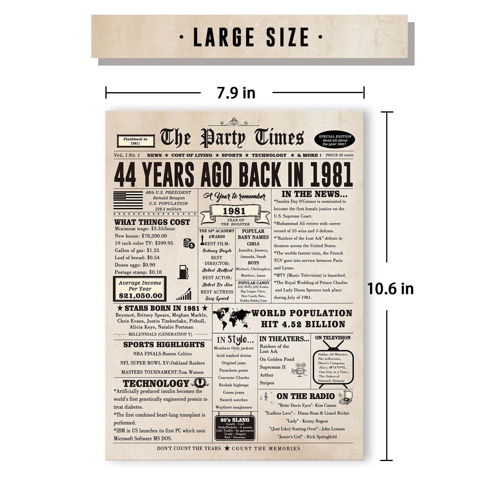 It's more than just a card; it's a cherished keepsake and a testament to the joy of celebrating life's milestones! When it comes to celebrating a remarkable 44 years of life, 44th birthday card is the ultimate tribute to a journey well-lived. Whether you're celebrating your best friend, parents, siblings, or spouse, this card is the perfect gift that encapsulates a lifetime of memories. Perfect option to recognize a milestone birthday. Size is large enough to easily read all the interesting fun facts. Plenty of room inside to personalize, well wishes/messages. Great option when you want a little more than a typical birthday card. Funny card with lots of good facts about the year you choose eg: median house prices, incomes, gasoline, historical events, movies, ect many of the events depicted on the card. The size was great to pass around for all to read, and made it handy to insert my own text.