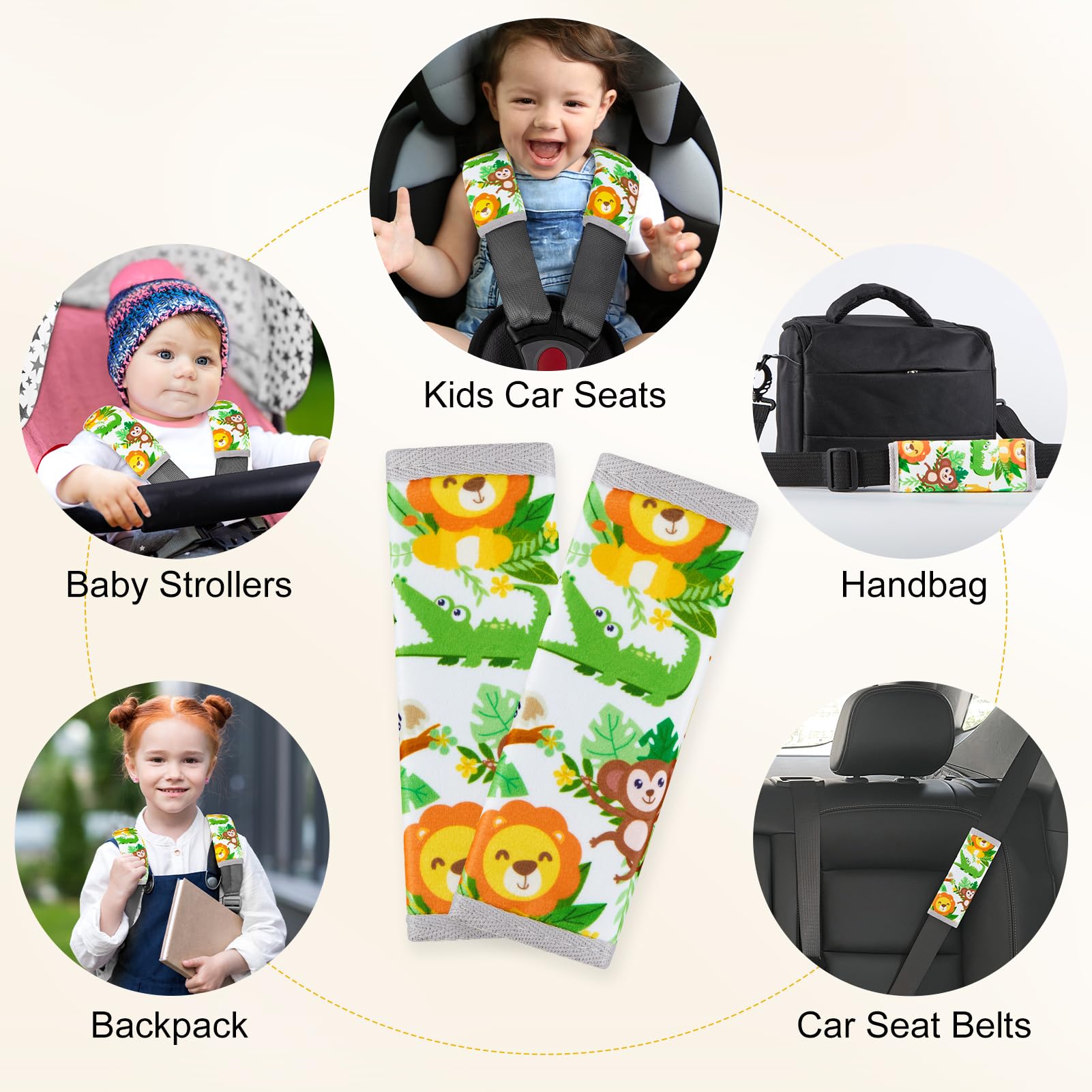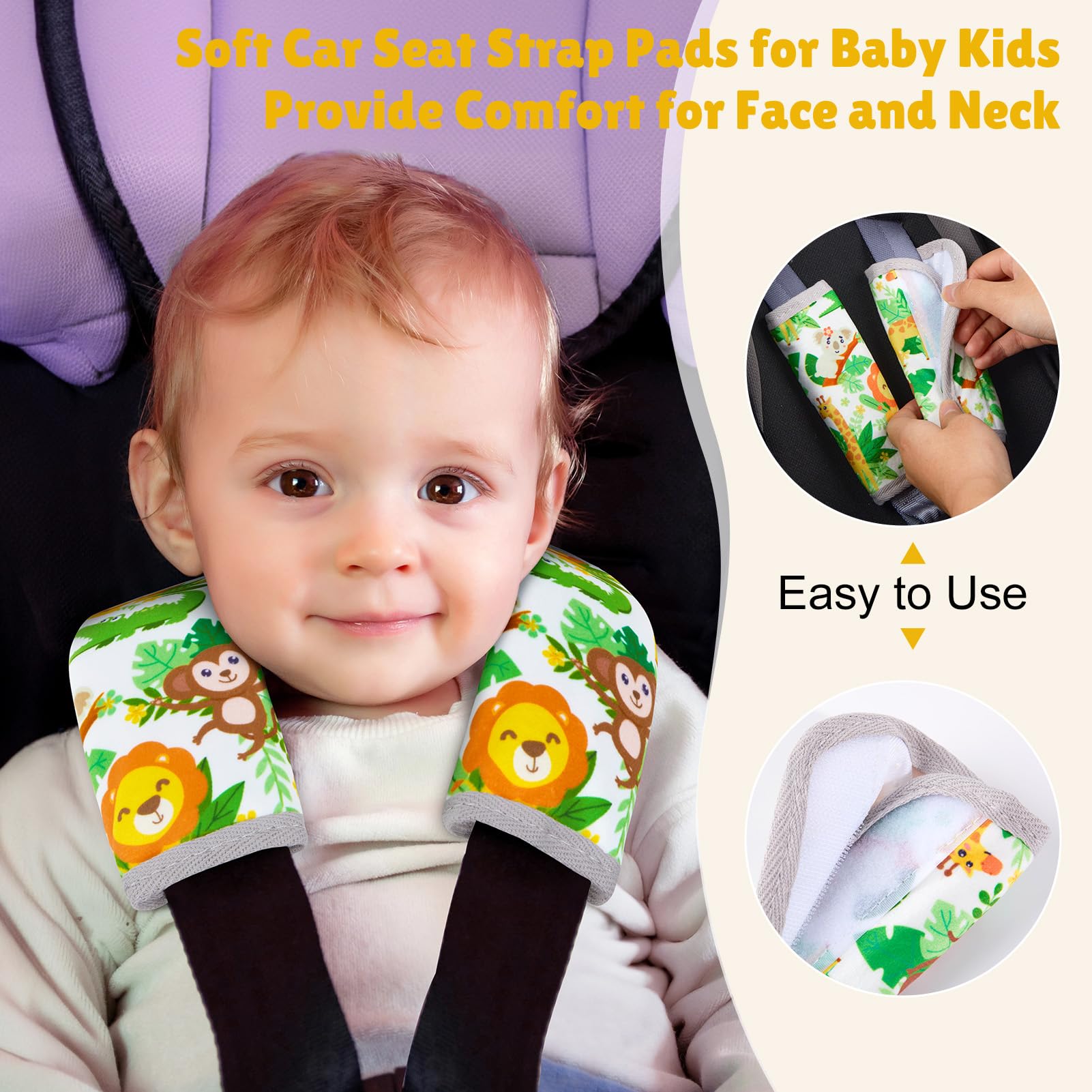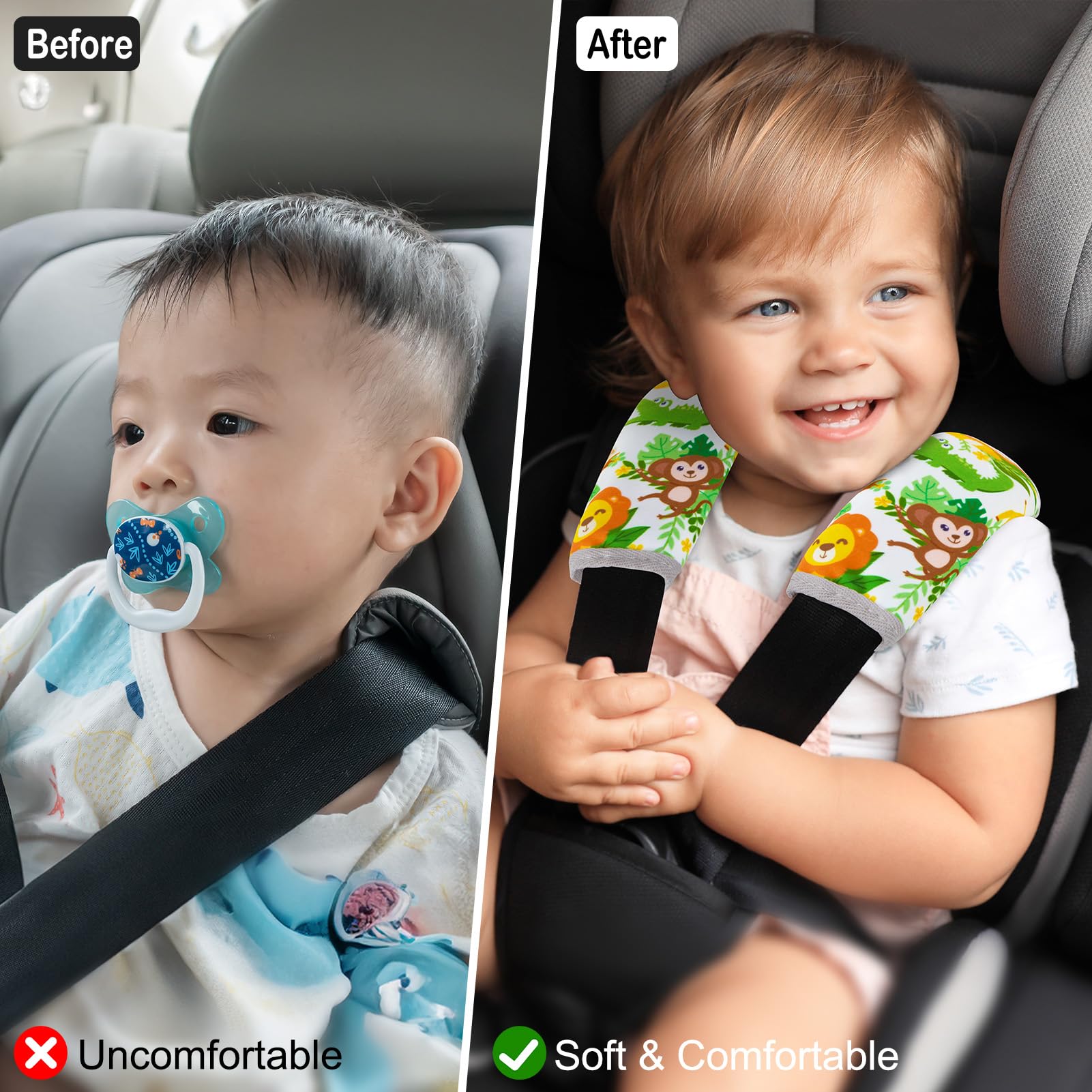 Soft & Comfortable Material: Our seat belt cover cushion for baby is made of soft and breathable fabric, it can protect baby's skin from being scratched by the seat belt; This seat belt cover with cute pattern and bright colors will make your kids happy