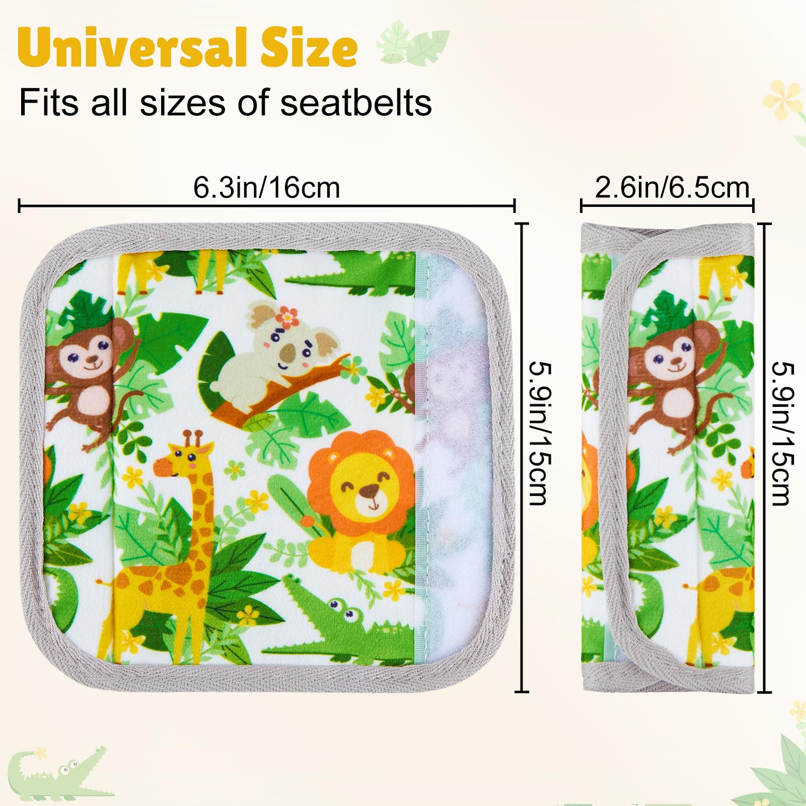 Universal Size & Anti-Slip: Our seatbelt covers for kids come in two sizes—small (5.9 × 2.6 inches) and large (9.4 × 6.3 inches)—specially designed for babies and kids, fit most car seats, strollers and pushchairs; The inside of the seat belt covers is an anti-slip design, keeping it in place with no sliding