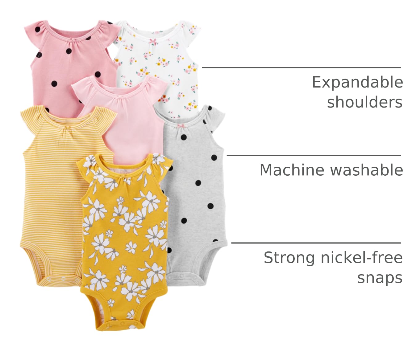 Description Simplify dressing your baby girl with this 6-pack of short-sleeve bodysuits from Simple Joys by Carter's. Each bodysuit features expandable shoulders that make it easy to slip over your baby’s head, while the strong, nickel-free snaps ensure quick and hassle-free diaper changes. Made from soft fabric, these bodysuits are gentle on your baby's skin and perfect for everyday wear. The tagless design eliminates irritation, keeping your baby comfortable all day long. With OEKO-TEX Standard 100 certification, you can trust that these bodysuits are safe and free from harmful substances. Available in a convenient 6-pack, these bodysuits provide exceptional value and are designed to mix and match easily with any outfit. Simple Joys by Carter's delivers high-quality, stylish clothing at affordable prices, making this 6-pack a smart choice for parents looking for both quality and value.