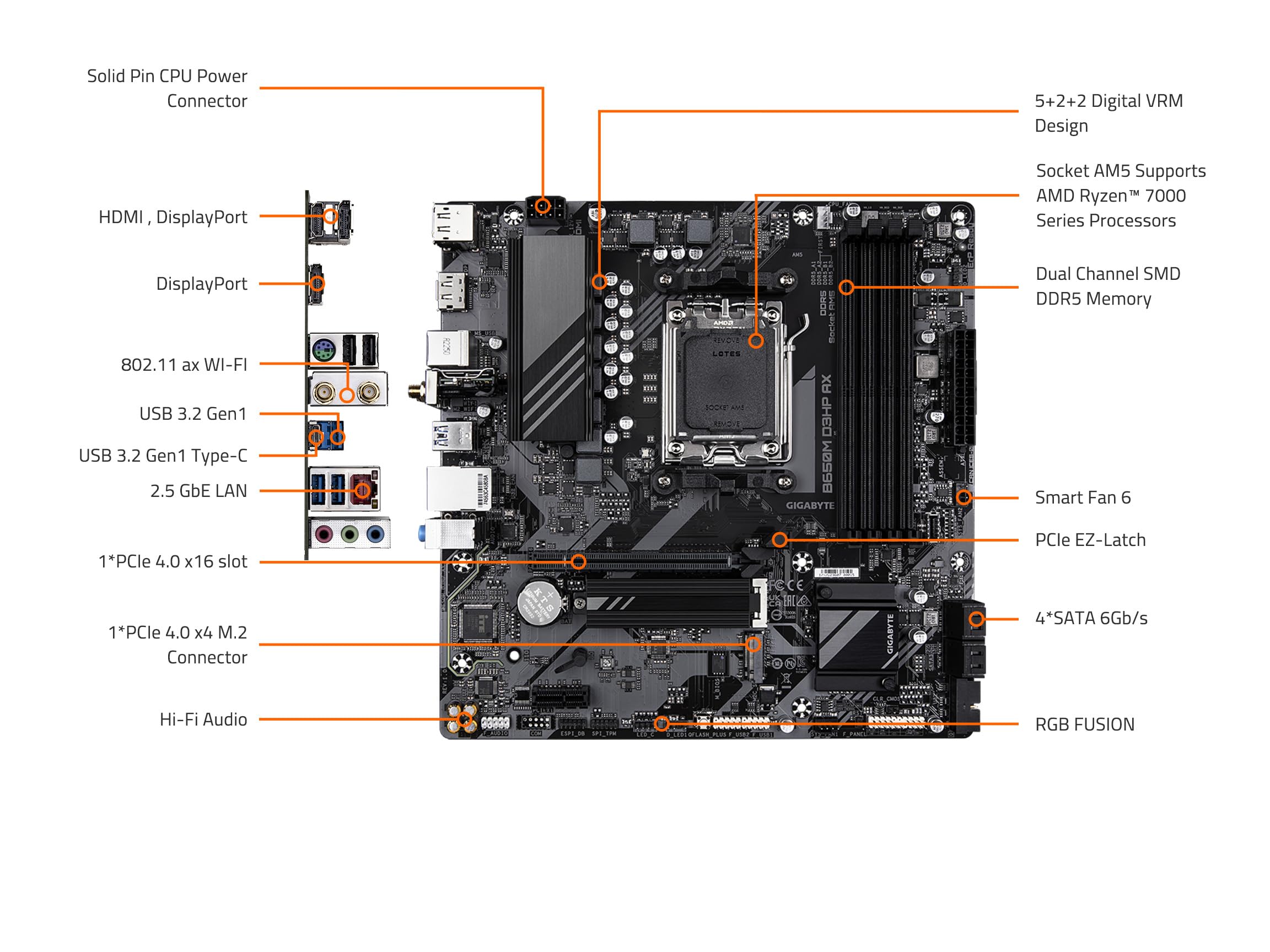 A new era is here. The B650M D3HP AX (rev. 1.0) supports AM5 Processors and features unparalleled performance. GIGABYTE B650 motherboards come with upgraded power design, high grade storage standards, and outstanding connectivity that enables you to optimize your performance.