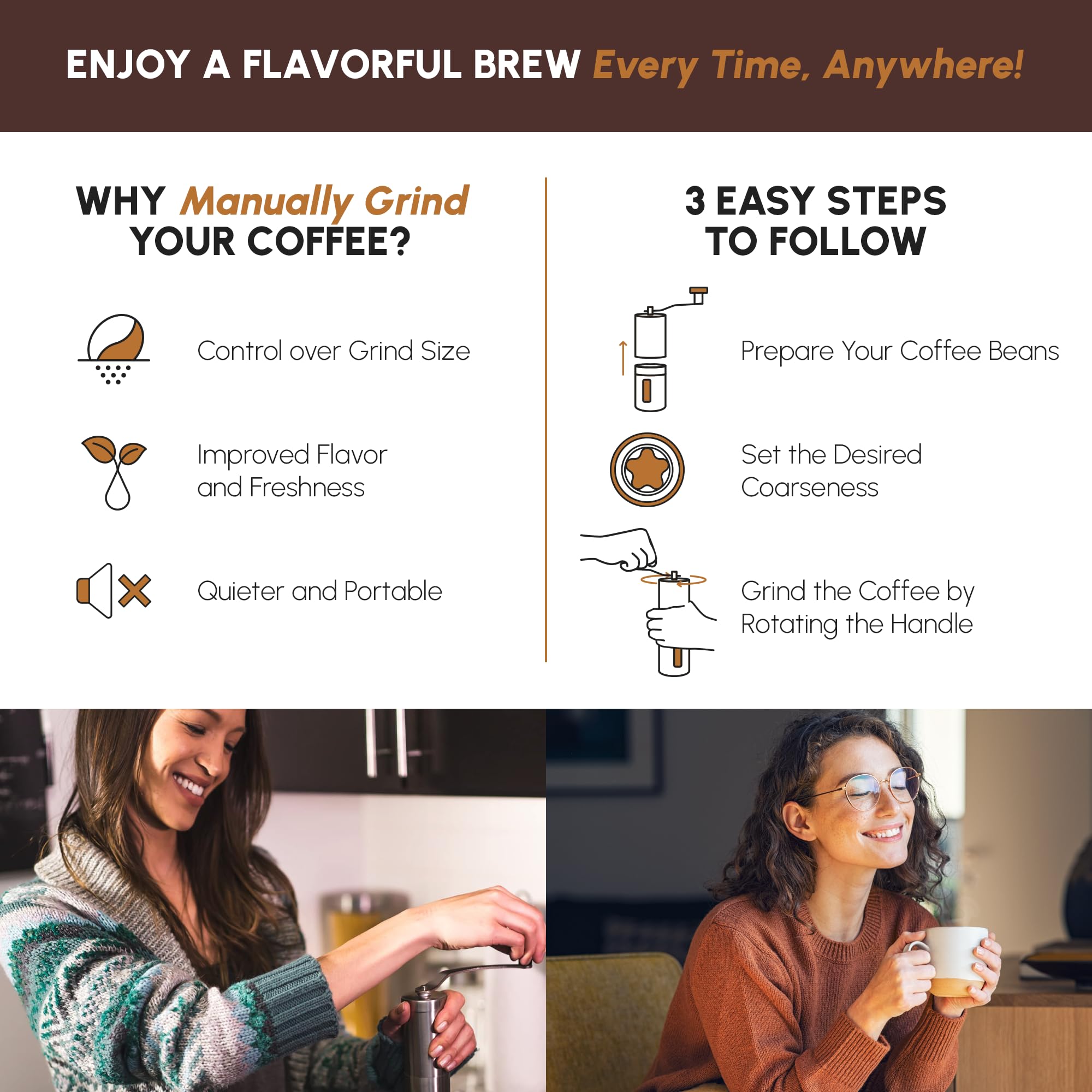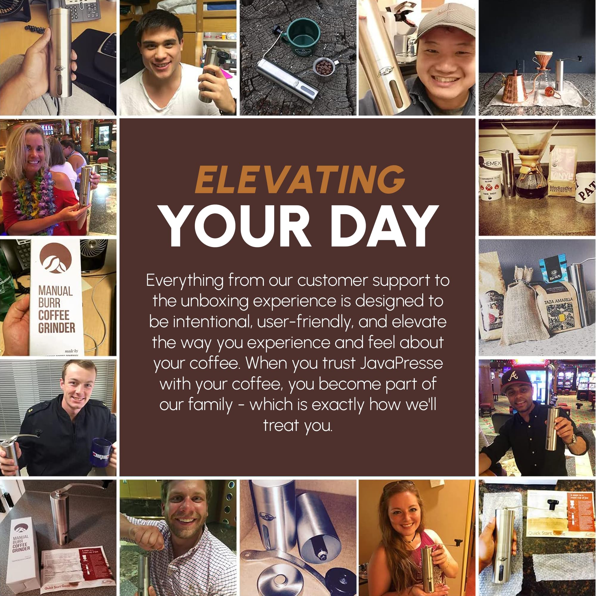 ENHANCE YOUR MORNING WHILE MAKING AN IMPACT AROUND THE WORLD ― Your deliciously crafted cup of coffee from our manual coffee grinder is helping empower coffee farmers to chase a brighter future. A portion of our profits go towards positively impacting our partner’s coffee supply chain and their local communities. Our mission hinges on one fundamental idea: when we care, happiness flows and everyone wins. Including you with this hand coffee bean grinder by JavaPresse.