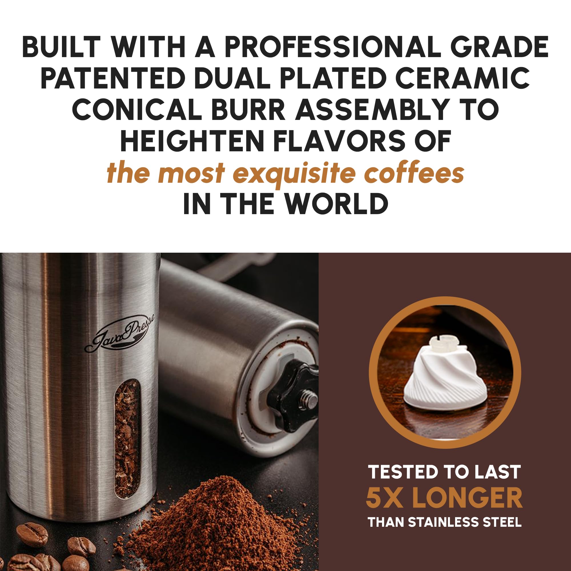 TREAT YOURSELF TO THE HIGHEST QUALITY MANUAL COFFEE GRINDER THAT IS BUILT TO LAST ― Crafted with the same essence as traditional Japanese cookware, our patented ceramic handheld coffee grinder burr is tested through three quality inspections to last 5 times longer than comparable stainless steel coffee burrs. Combined with an impeccable frame and convenient size, this is the pinnacle travel coffee grinder that is a great gift for Father's Day or travel enthusiasts.