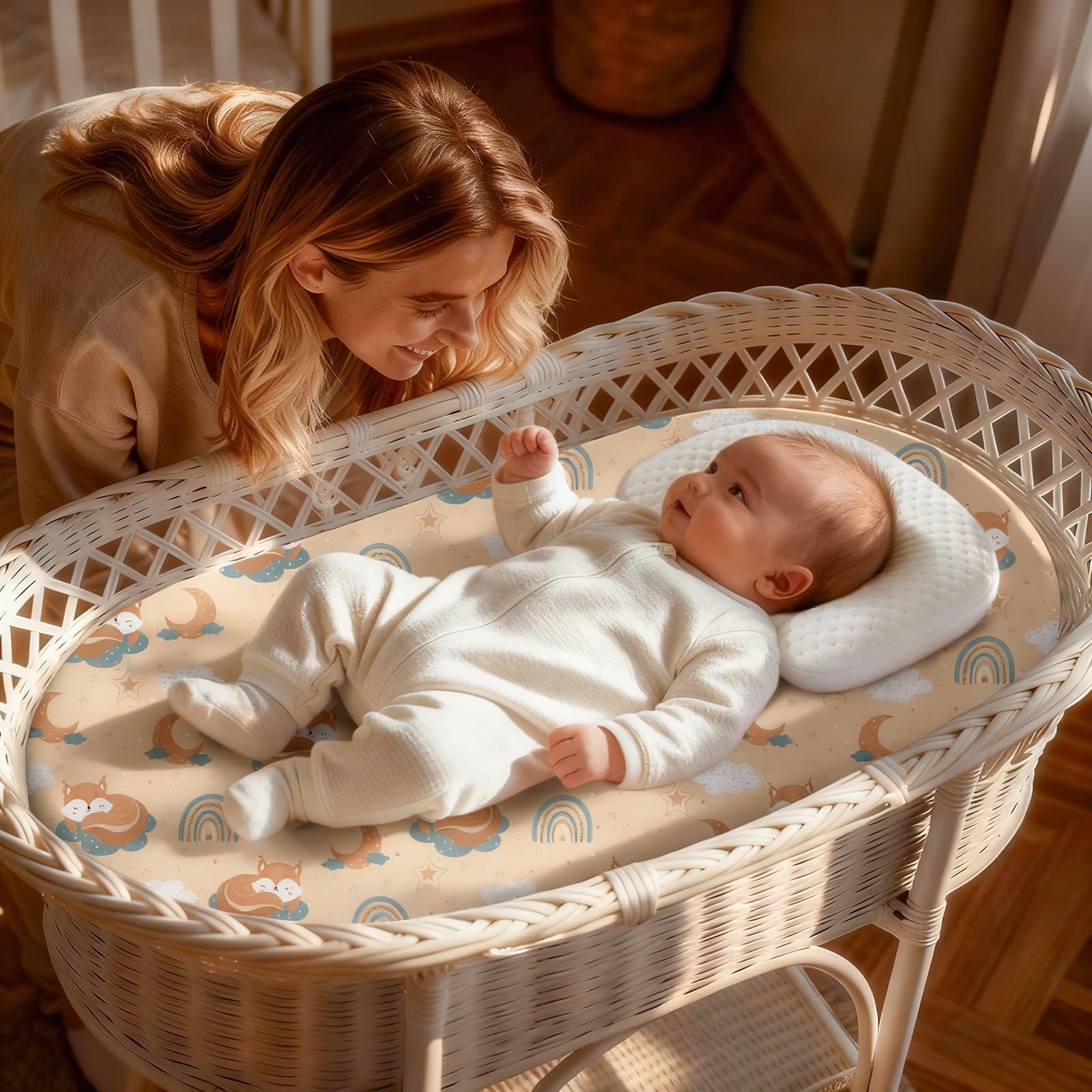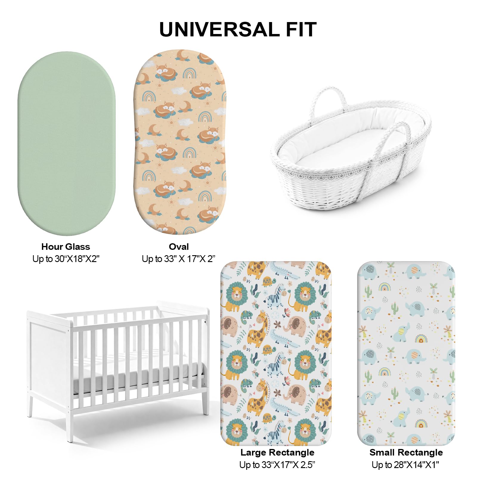 Perfect Fit: The soothing bassinet fitted sheet measures 32x16 inches and is up to 4 inches thick, making it compatible with a wide range of mattress brands. It's compatible with hourglass, oval, rectangular, and round bassinet shapes, providing comprehensive protection for your baby.
