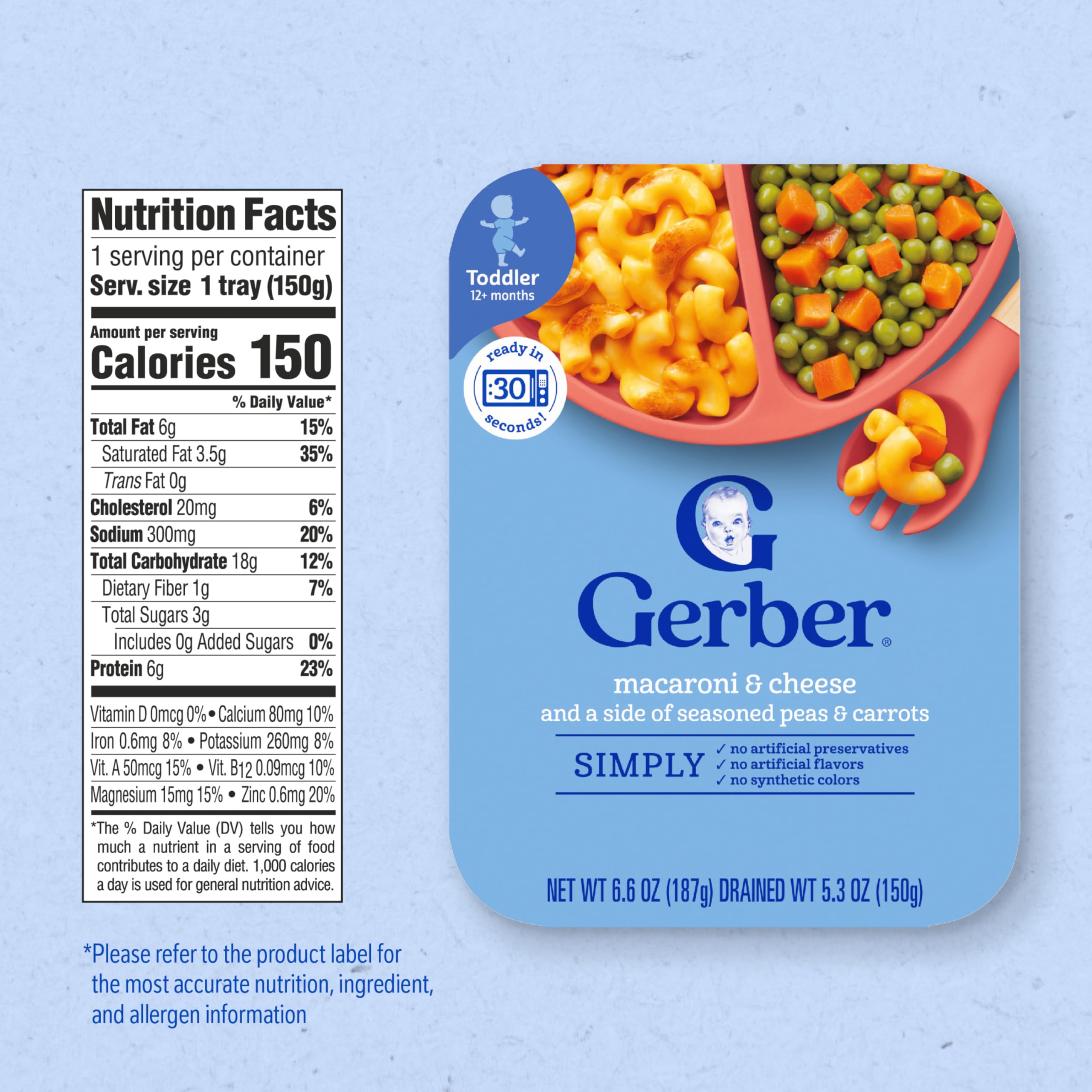 Gerber Macaroni and Cheese is perfect for baby led feeding. With wholesome ingredients designed for tiny hands, this toddler pasta makes mealtime for toddler easier. To prepare, puncture seal on both compartments and microwave for 30 seconds. Then remove seal and test temperature before serving. Gerber’s dedication to quality has been and always will be our highest priority. We're committed to being your partner in parenthood with quality ingredients & expert guidance.