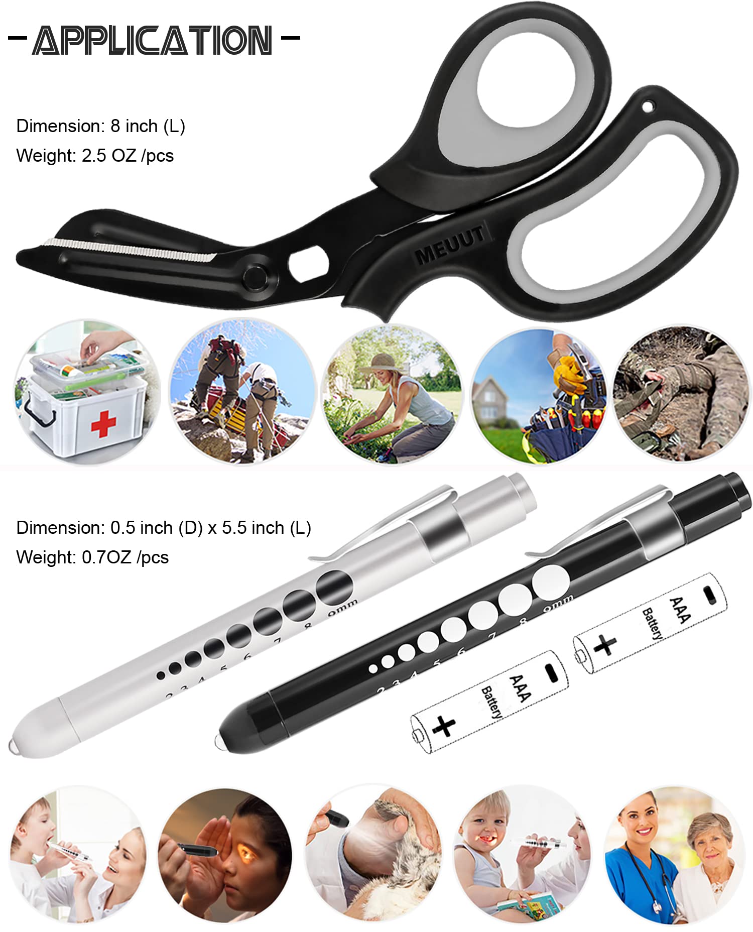 【EASY TO USE】: The compacted trauma shear designed with connected hole to take. Penlights designed with push-button on/off switches and pocket clip. Keep them within reach at all times with you!