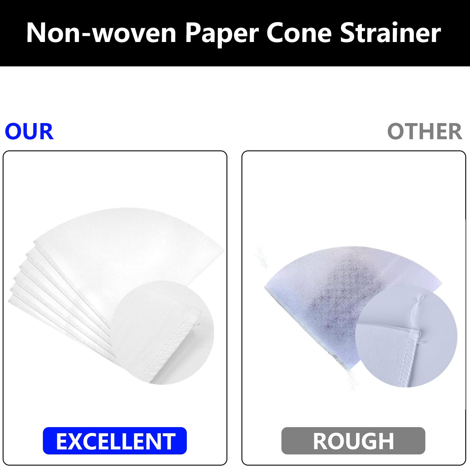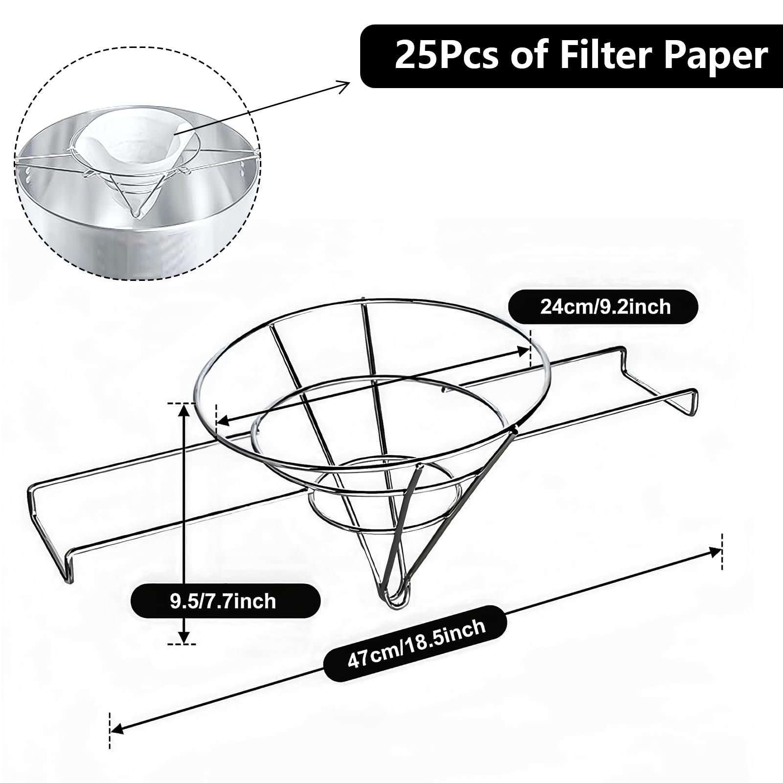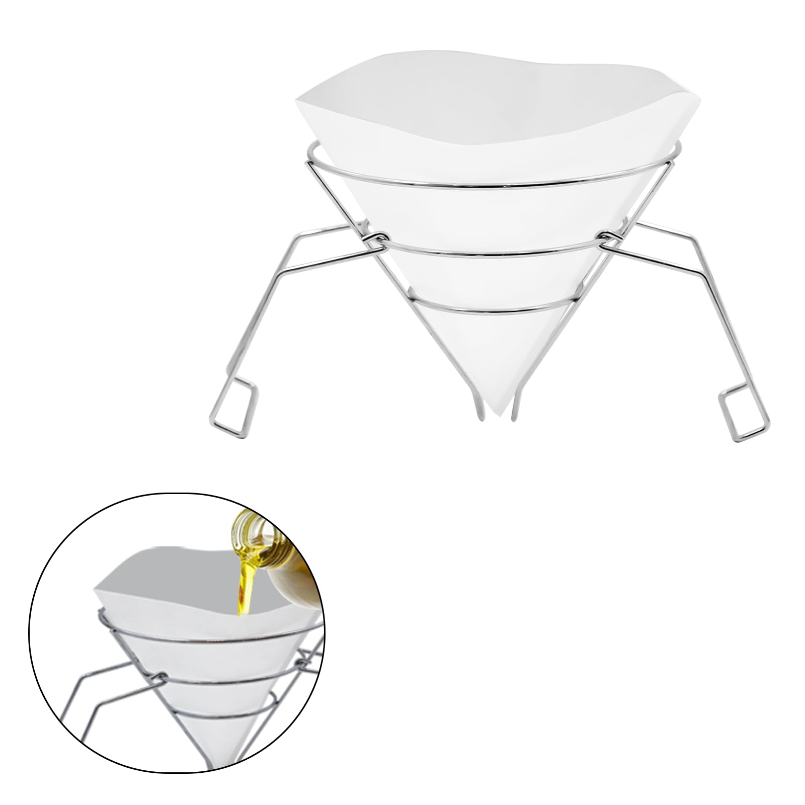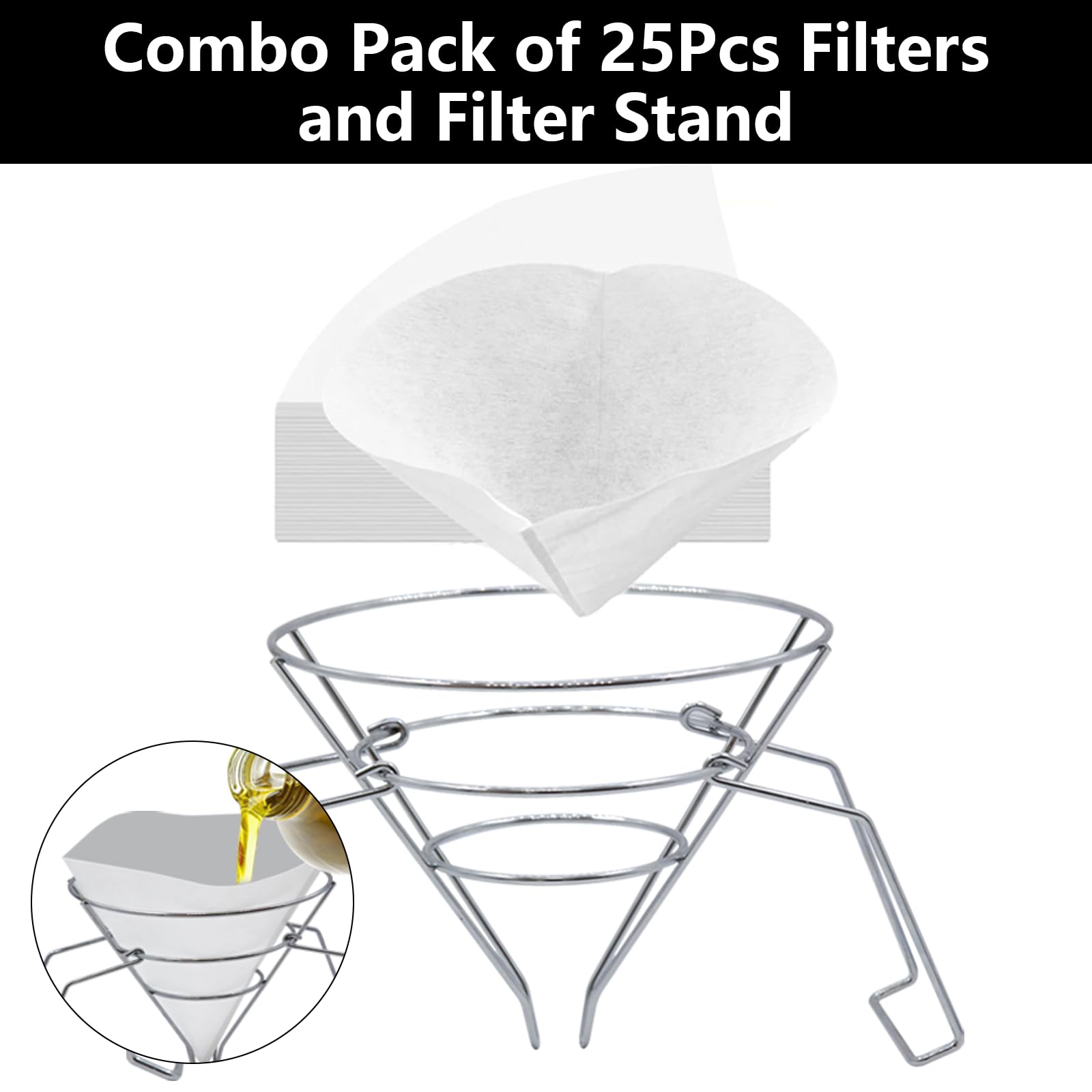 【Enhanced Kitchen Efficiency】: This Oil Cone Filter Holder comes with 1 holder, 2 detachable handles, and 25 precision filter papers. The Commercial Cone Filter adapts securely to pots or containers, making oil and syrup filtration more efficient and helping streamline your kitchen's productivity.