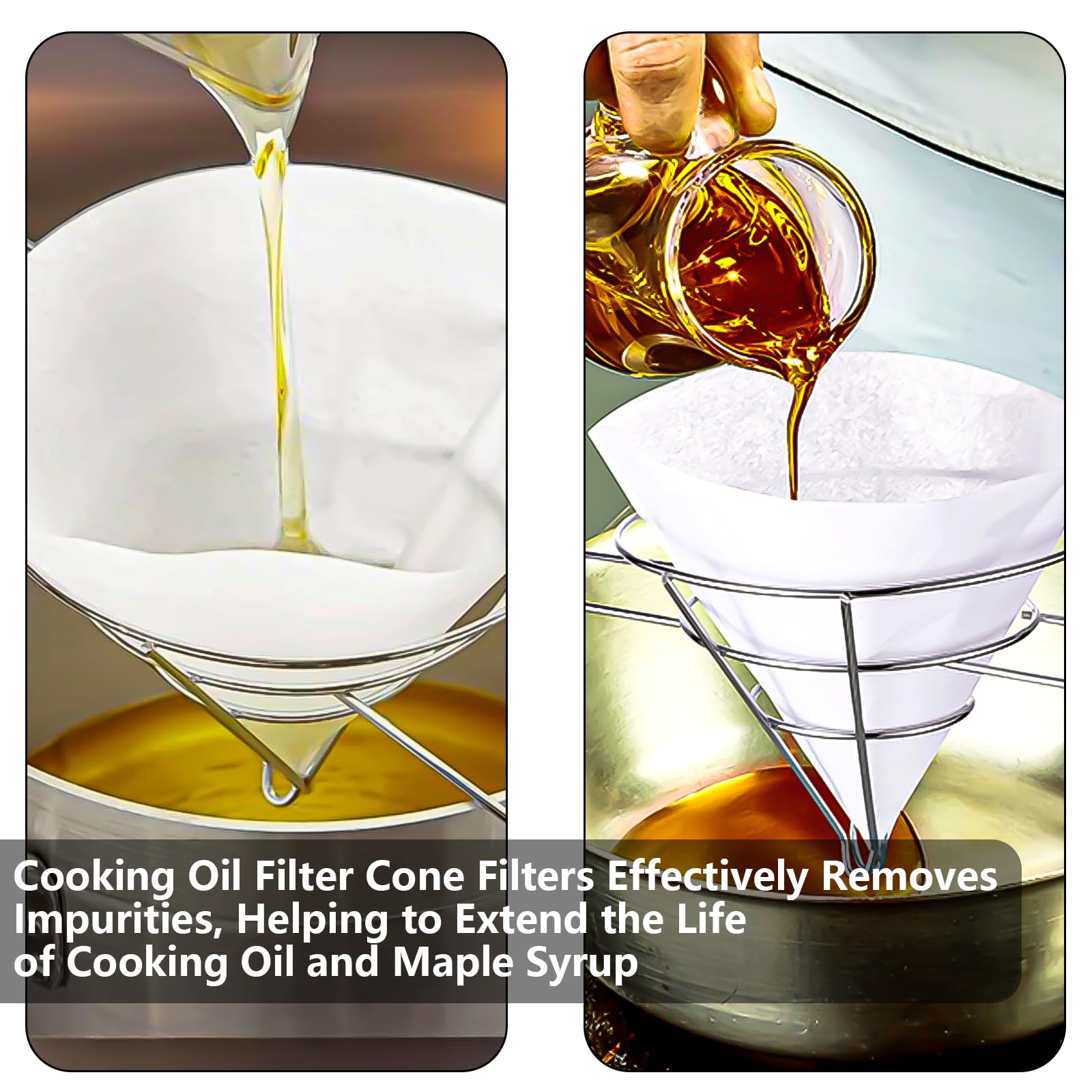【Versatile Filtering for Oils & Syrups】: Perfect for filtering a wide variety of oils, including frying oils, coconut oil, and bacon grease, as well as for Maple Syrup Filters Set. The Filter Cone Holders provide a versatile solution to maintain the purity and quality of your ingredients in both commercial and home kitchens.