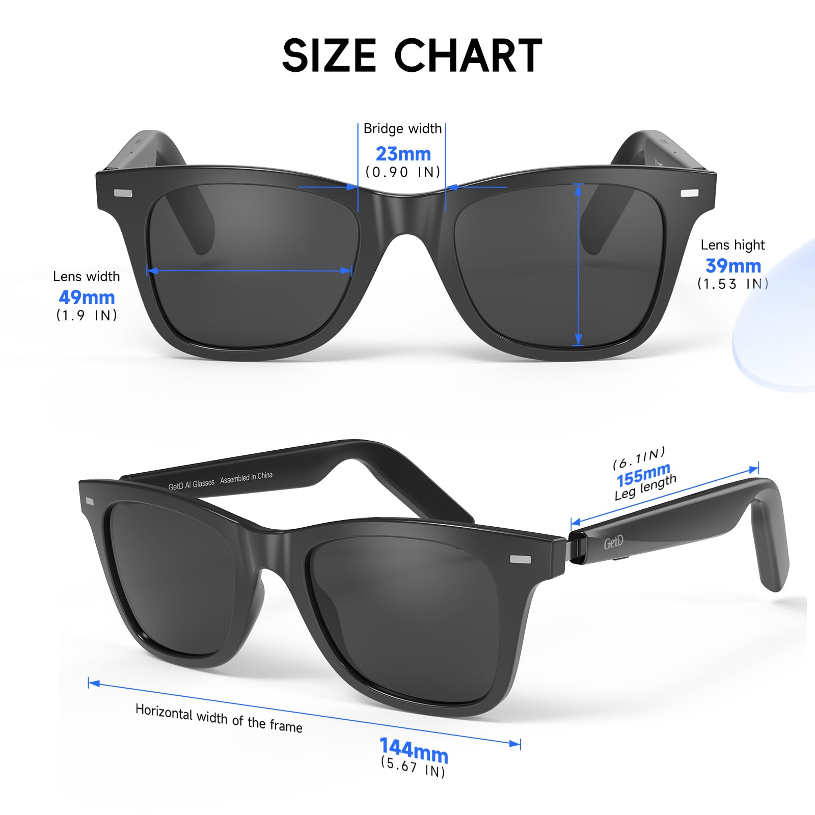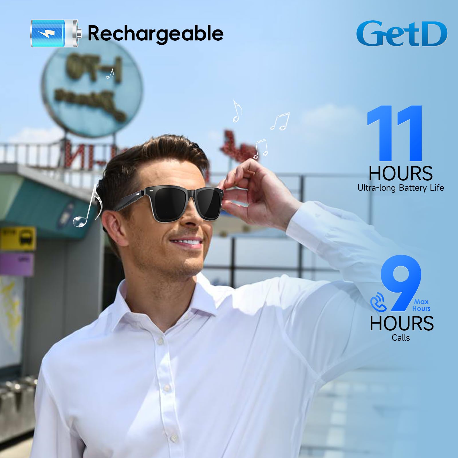 【Music & Call Glasses】: The GetD AI glasses are equipped with two 115mAh batteries. A full charge offers 15 days of standby and 11 hours listen music, 9 hours calling (at 50% volume). Charging 10 mins, 1 hour use; over-voltage and overload protection, magnetic charging and integrated design ensure IP54 water resistant