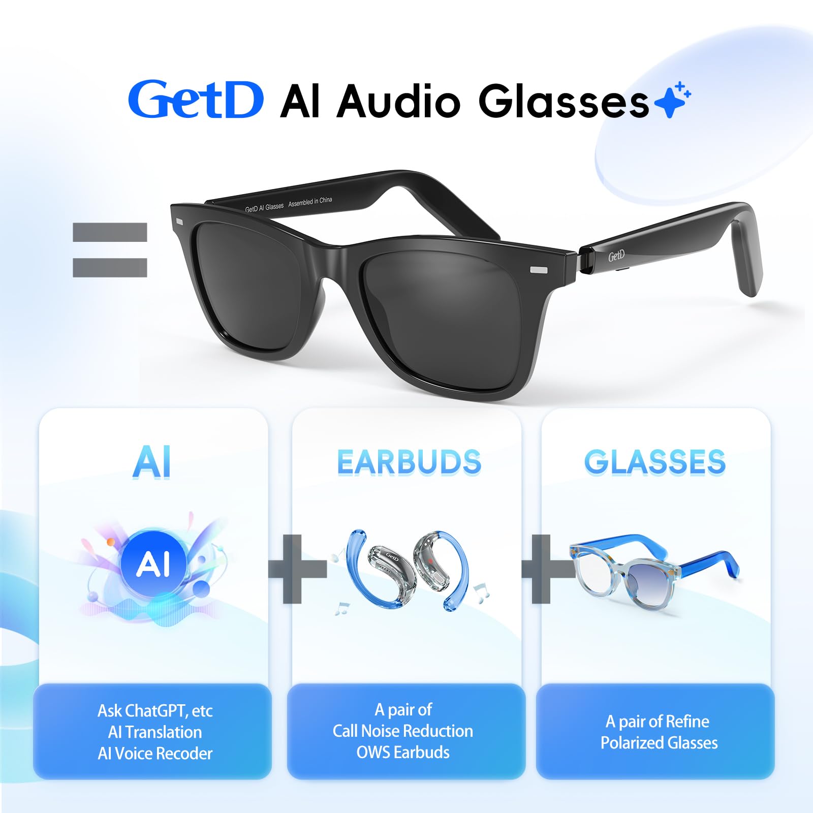 【3-IN-1 AI GLASSES】: ①Your AI Assistant powered by ChatGPT, Real-time Translation and Voice Recorder; ②A Pair of Good OWS Noise Reduction Earbuds; ③A Pair of Good Polarized Sunglasses for Men & Women