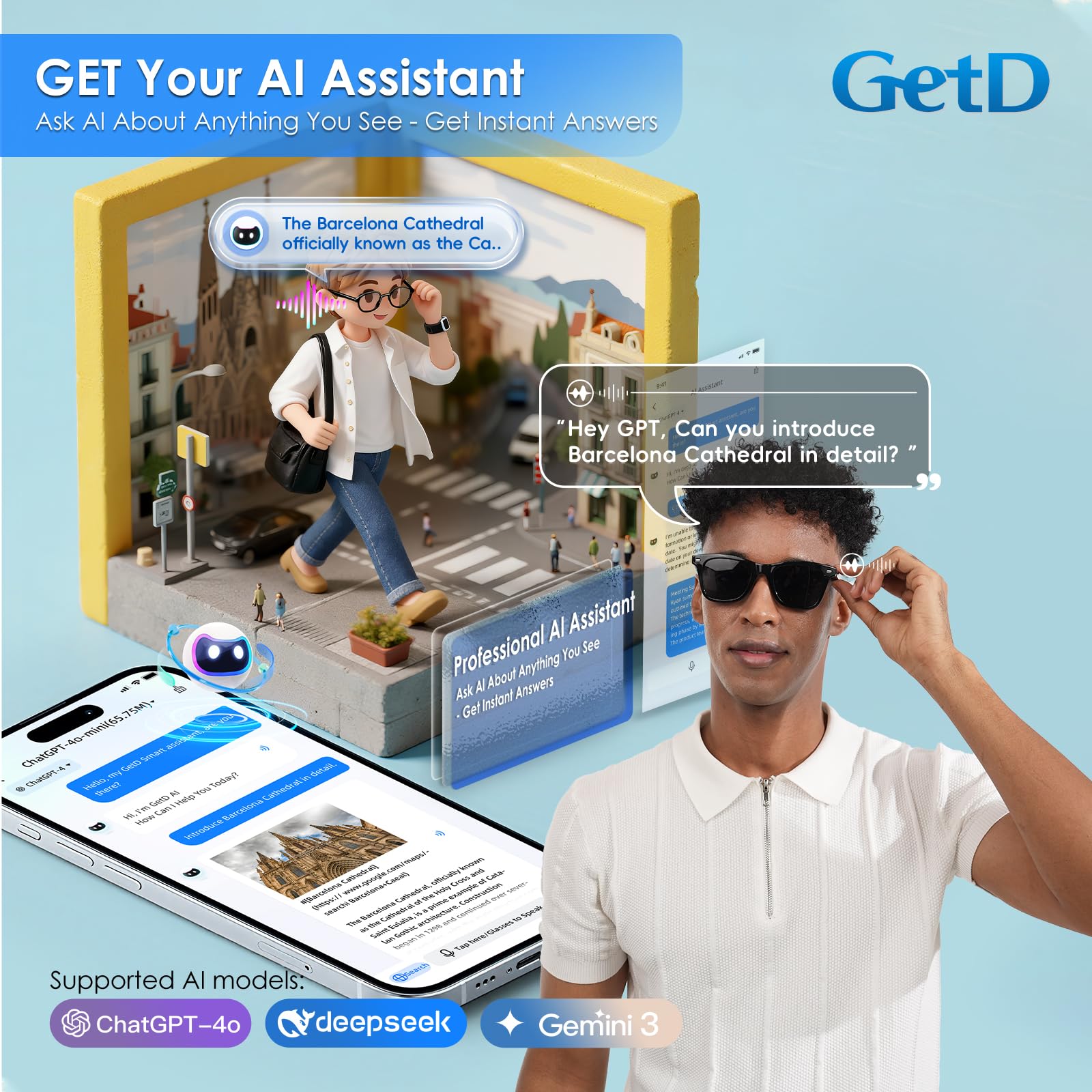 【AI ASSISTANT GLASSES】: Integrated into the GetD app, come with an AI assistant powered by ChatGPT, DeepSeek etc. offering intelligent, accurate, and efficient conversations; It supports High-Precision 145 languages Bi-directional Simultaneous Translation in over 170 countries, Moreover, Voice Recorder quickly converts speech to text with high accuracy meeting notes. It’s also great for quick memos and recordings