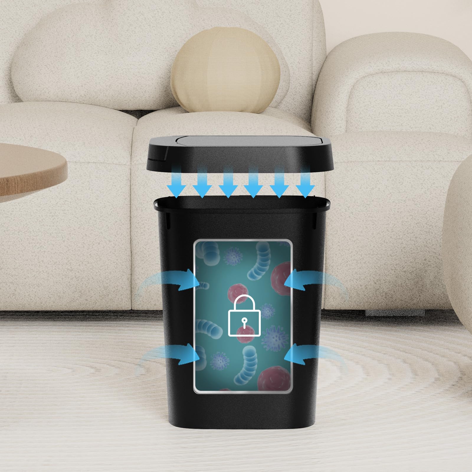 EASY TO CLEAN- rafted from premium-grade ABS material, this small trash can with lid boasts high durability and resistance to wear and tear. The stylish matte finish not only adds a touch of elegance but also makes cleaning a hassle-free task.