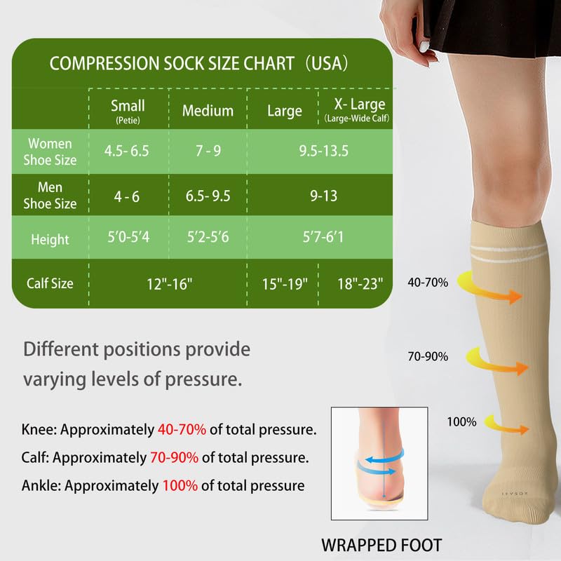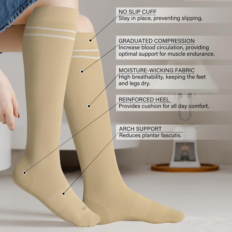 Medical Compression Socks: Compression socks for women 20-30 mmhg knee high offer significant medical benefits, such as reducing swelling and edema, managing varicose veins, etc. These compression stockings are especially helpful for individuals who stand for long shift work, medical professionals, pregnant women, and long flights.