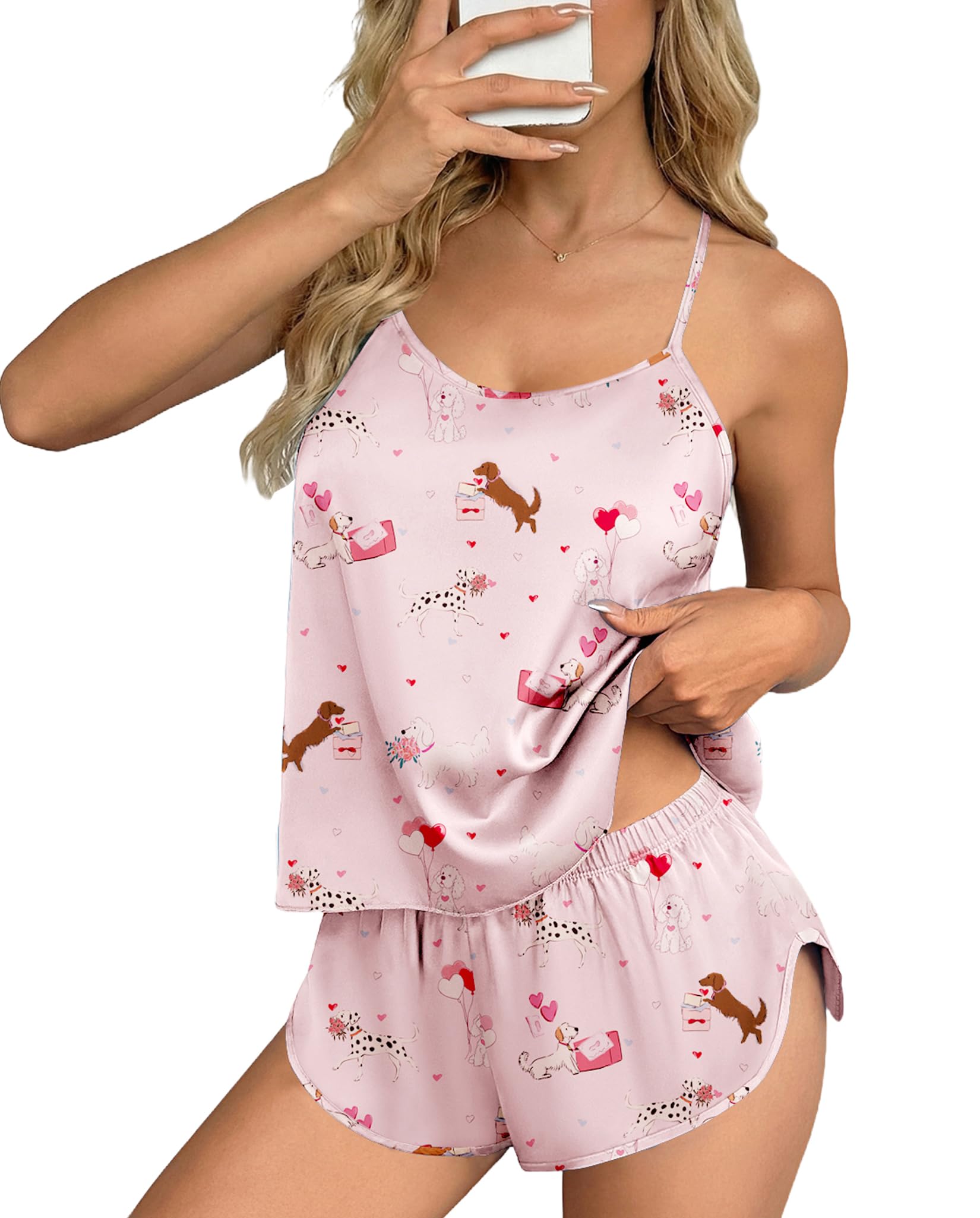 SATIN CAMI PAJAMA SET FOR WOMEN: Playful Print Silk pajamas for women - 95% polyester/5% spandex satin cami set with silky texture. Breathable, soft-stretch, wrinkle-resistant & easy-care for year-round sleep & comfy loungewear