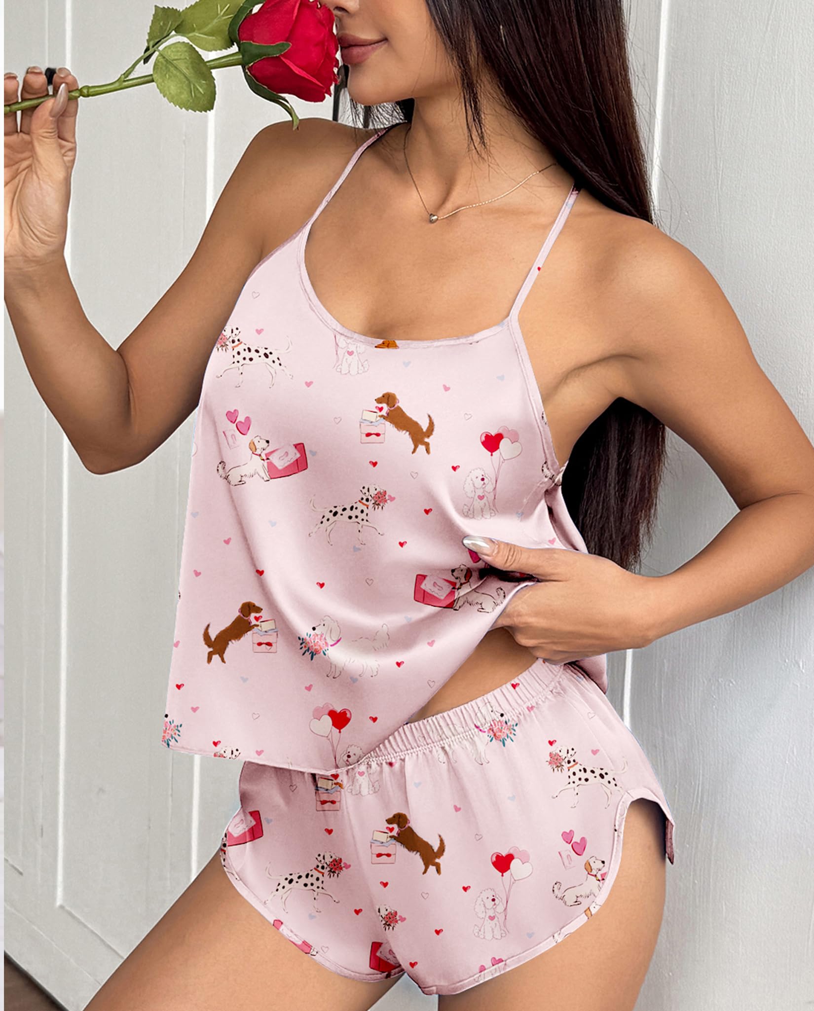 2-PIECE CAMI & SHORTS: Cute, flirty sexy satin pajamas for women—playful gothic/cute prints & solid hues; adjustable cross-back cami & side-slit shorts. Ideal for gothic gatherings/sleepovers/Halloween/bachelorette parties