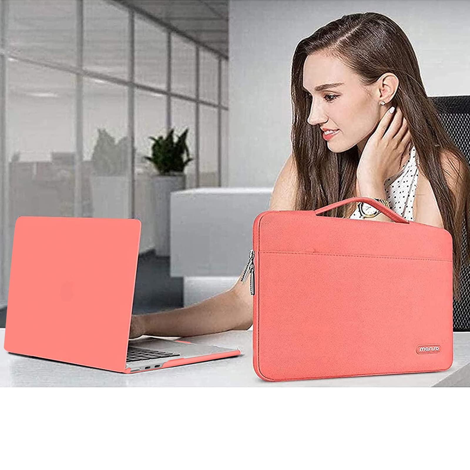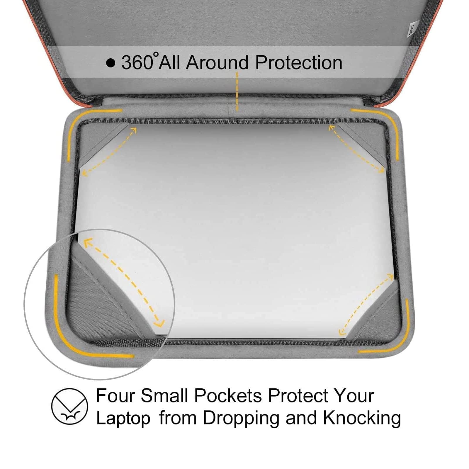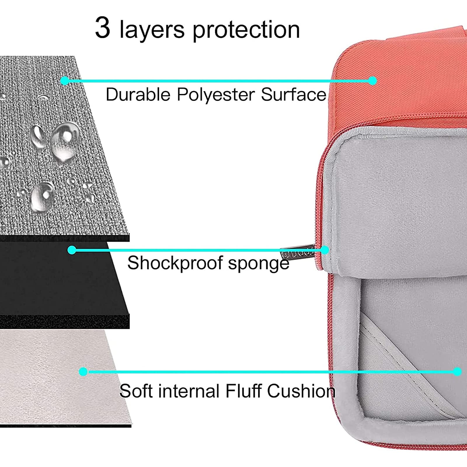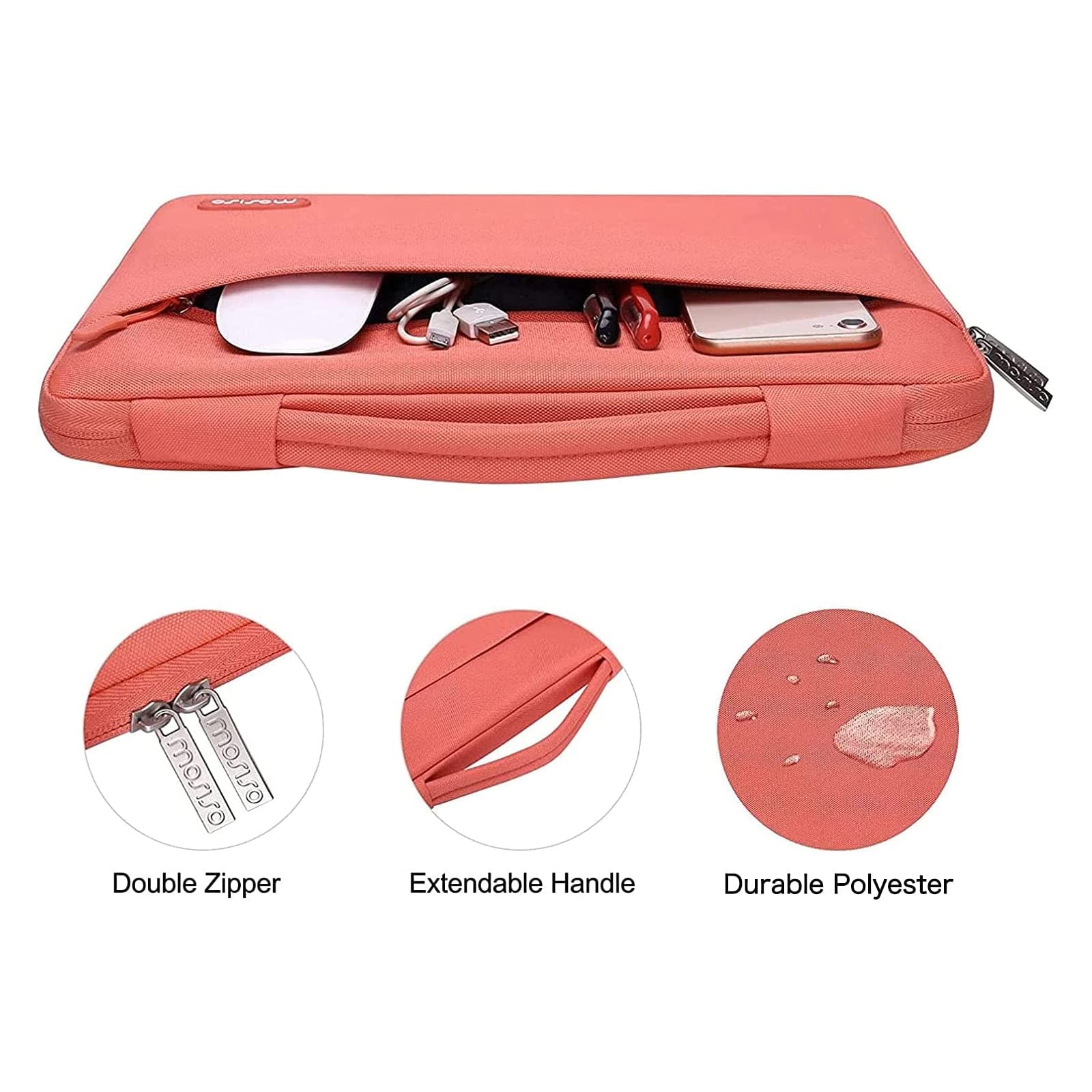 The 360 degree protective shockproof laptop sleeve with handle carrying bag internal dimension: 13.39 x 9.25 x 0.79 inches (L x W x H); external dimension: 13.98 x 9.84 x 0.79 inches (L x W x H). The front side pocket dimension: 11.61 x 9.25 inches (L x W). Made of polyester material, protect your laptop against accidental spills. Slim and lightweight, does not bulk your device up and can easily slide into your briefcase, backpack or other bag. Ideal for business, daily and travel.