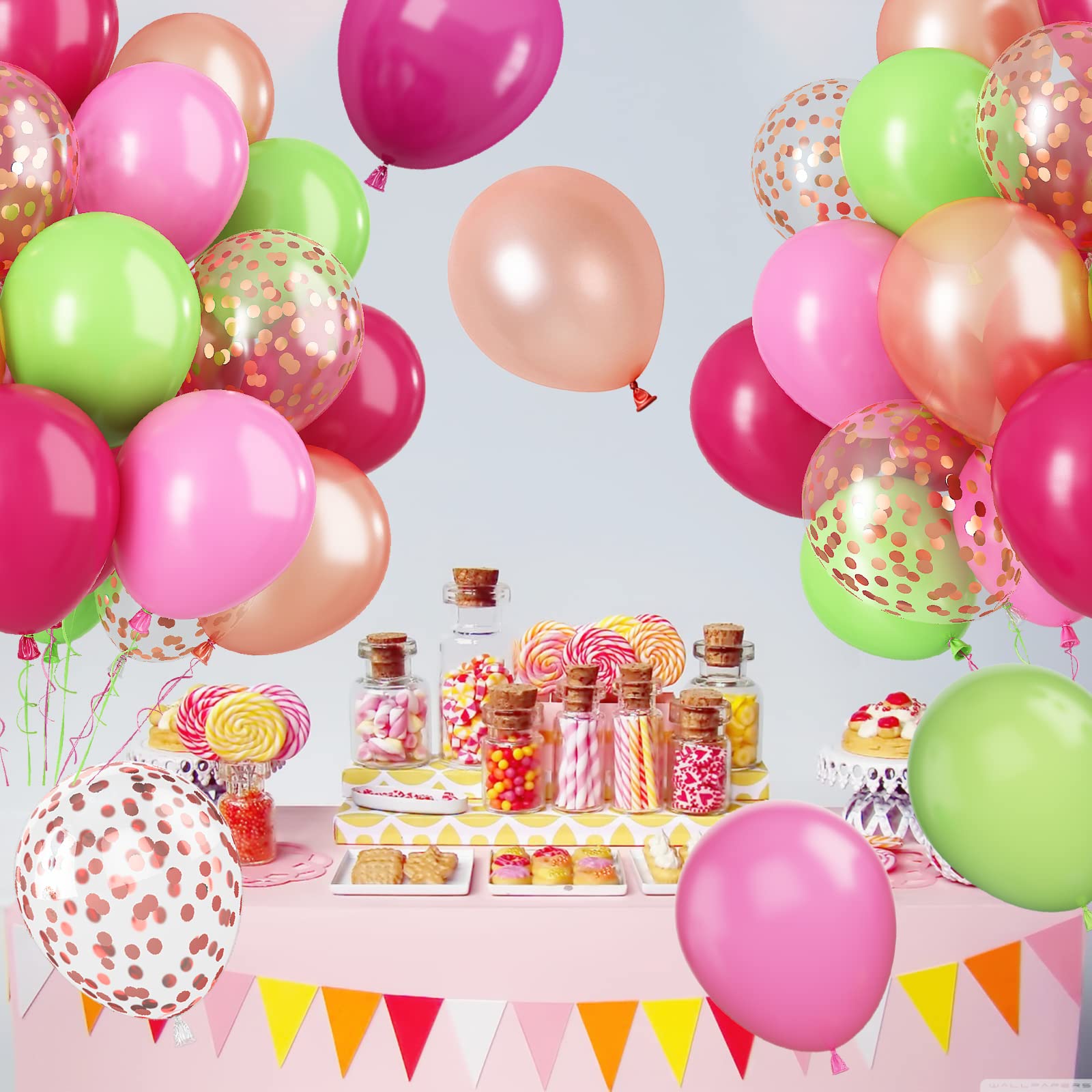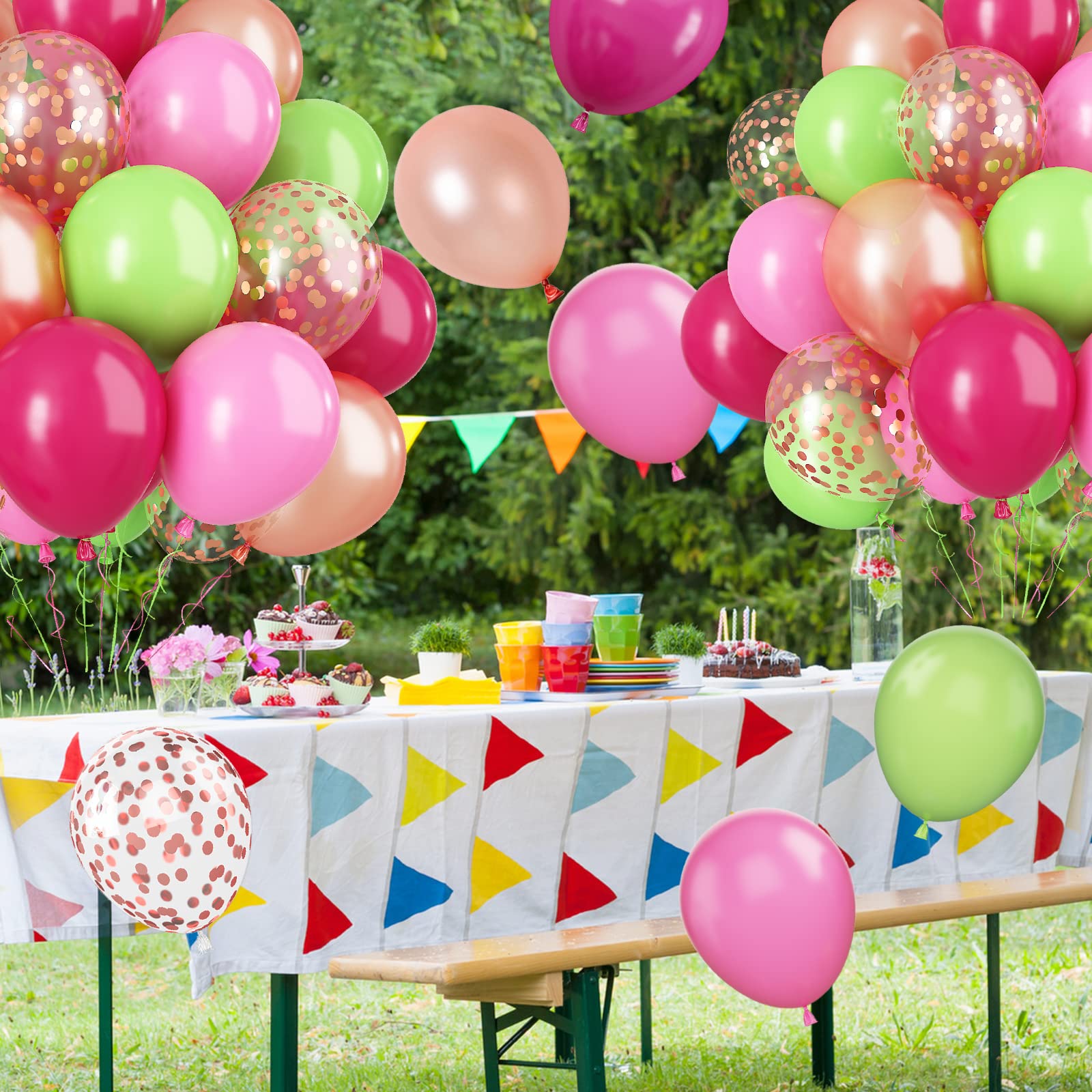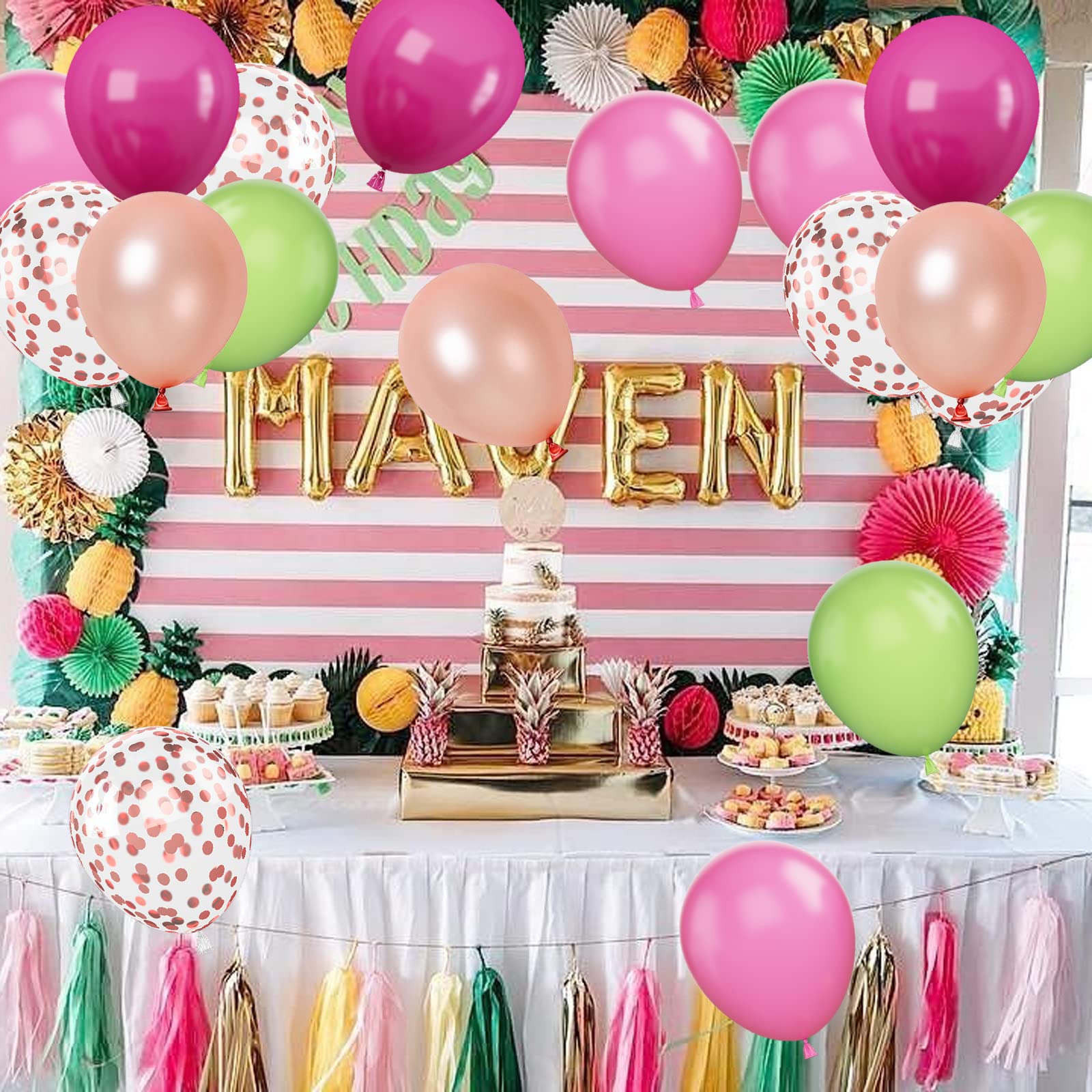 Mixed Balloons Set: The 12 inch green hot pink rose gold balloons set includes 15pcs light green balloons, 15pcs pink balloons, 10pcs hot pink balloons, 10pcs pearl rose gold balloons, 10pcs rose gold confetti balloons, 2 roll of ribbon. 62pcs in total. A variety of tropical party latex balloons set is suitable for your beautiful art theme decoration.