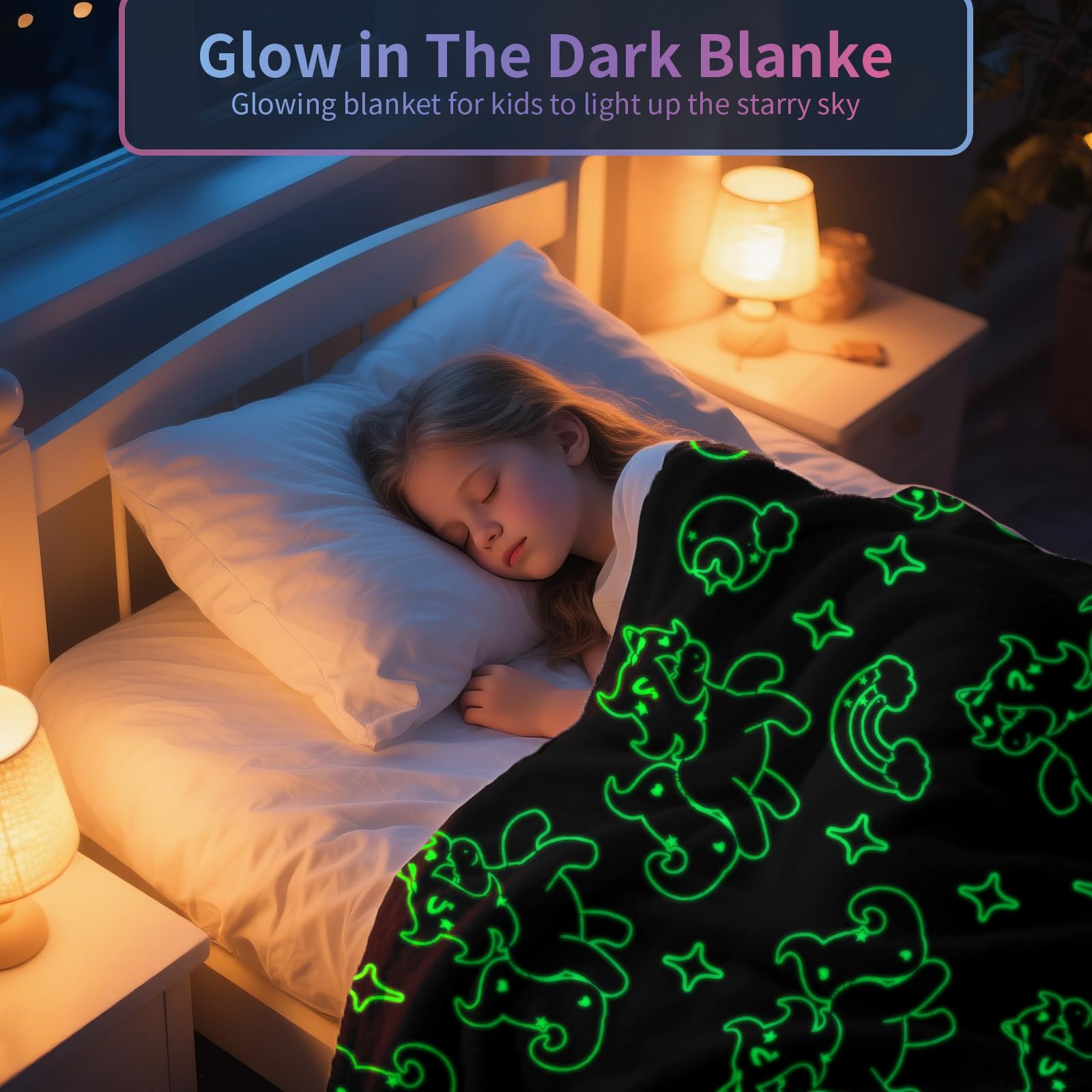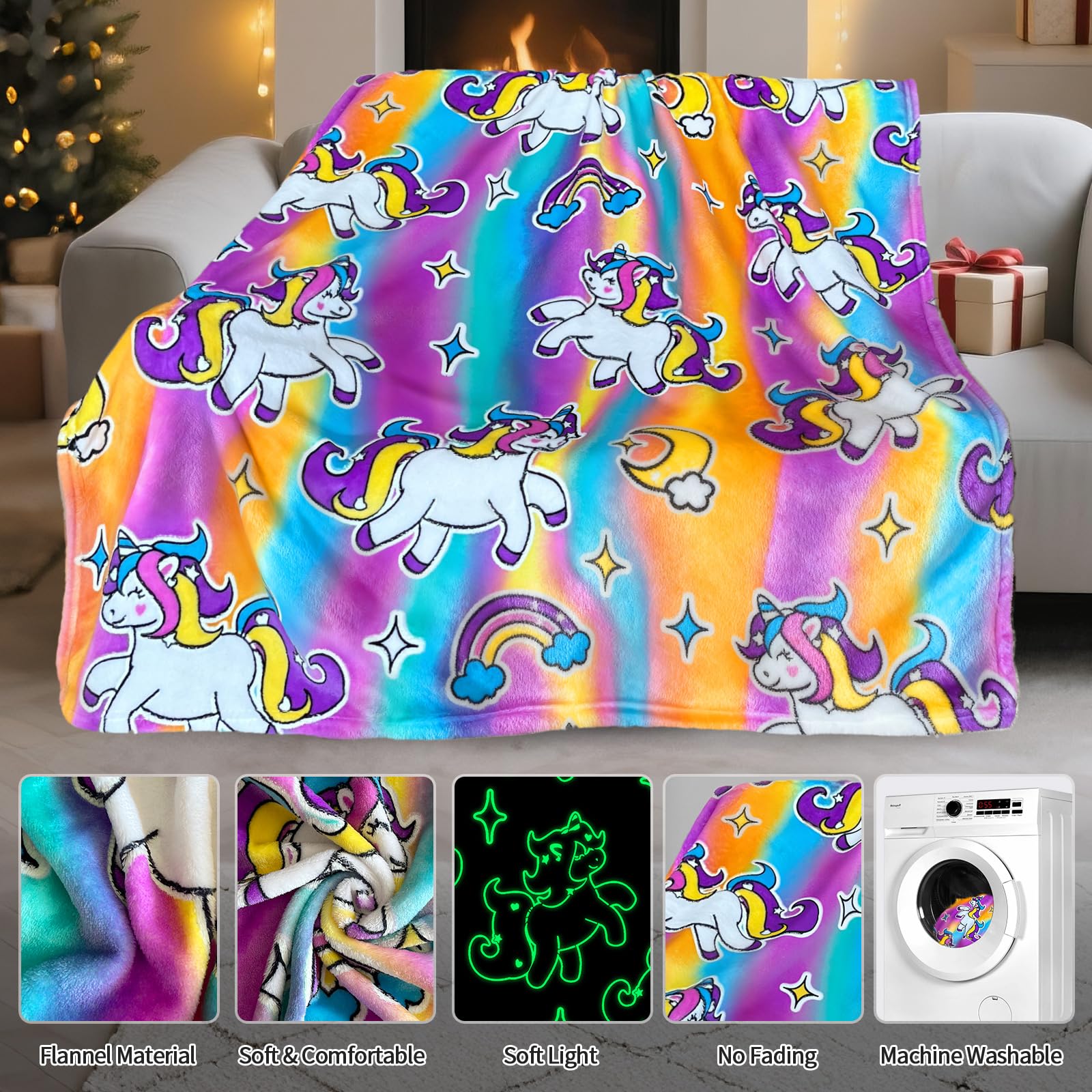 Unicorns Gifts for Girls: When you're struggling for a holiday or birthday gift, glow in the dark blanket will surprise children, this unicorn blanket is the perfect choice.