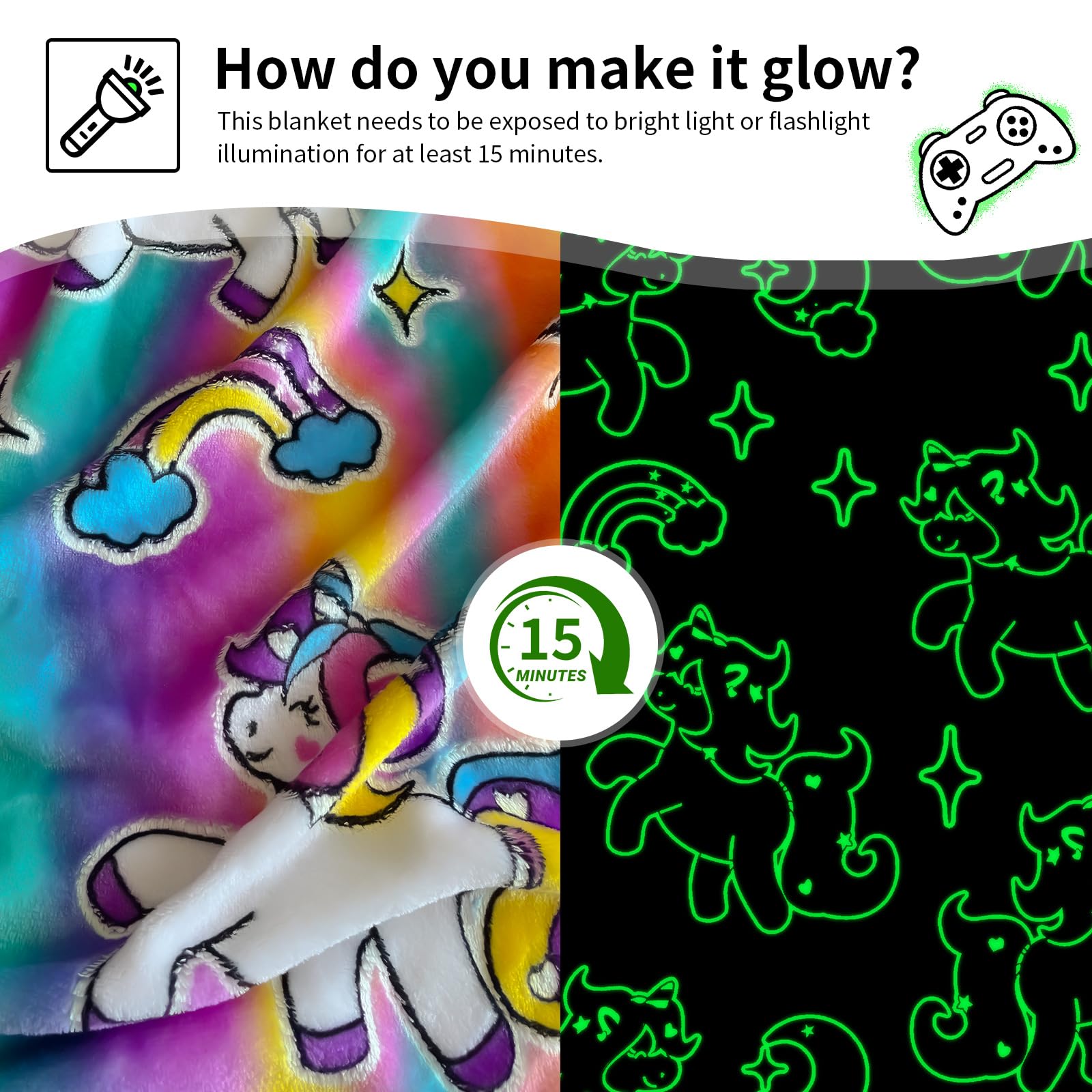 How do you make it glow? Simply expose the unicorn blanket to bright light for 15 minutes, then turn off the light and magical things will happen! Expose the blanket to sunlight or a strong light source. The longer it absorbs light and the stronger the light, the brighter it will be. Unicorns Gifts for Girls Kids love unicorn stars and rainbows. Glow in the dark blanket is a cool gift that will surprise kids. It provides comfort and warmth in any season, day or night. The glowing unicorn blanket for kids lights up the dark night. Soft Flannel Blanket Super soft flannel fabric. Unicorn throw blanket made of high quality 100% plush polyester. Glow in the Dark Blanket Glowing unicorn blanket for kids to light up the starry sky, kids are going to love it. Easy to Clean Unicorn blanket machine washable and dryable for worry-free care.