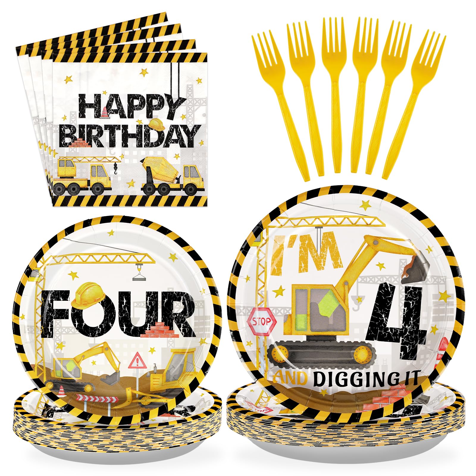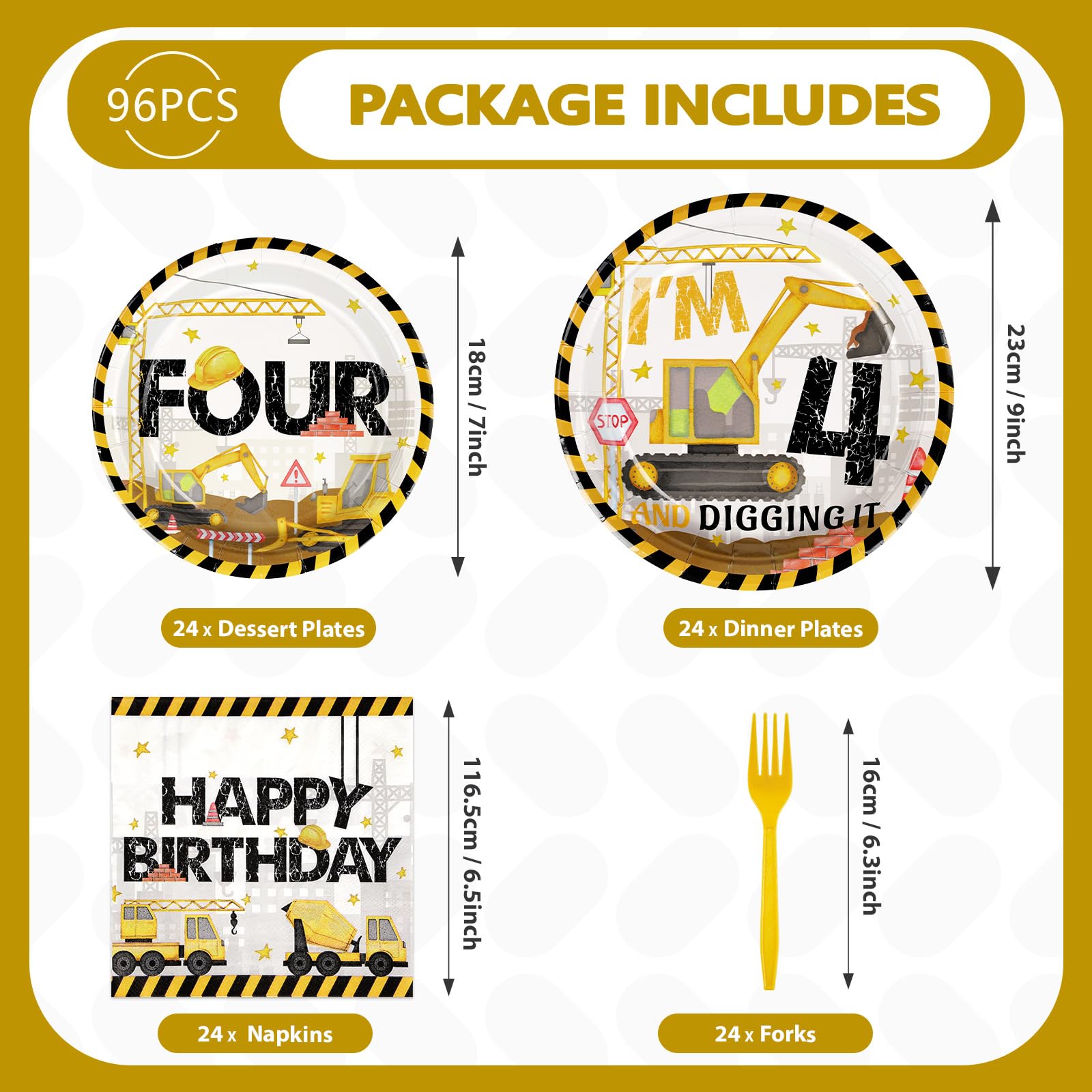 Construction 4th Birthday Party Decorations: Our construction 4th birthday disposable tableware includes 24 * 9'' construction 4th birthday party plates, 24 * 7'' construction plates, 24 * 6.5'' paper napkins, and 24 plastic forks. This construction party decorations kit is specially designed for four years old children.It will definitely be a hit for your special event