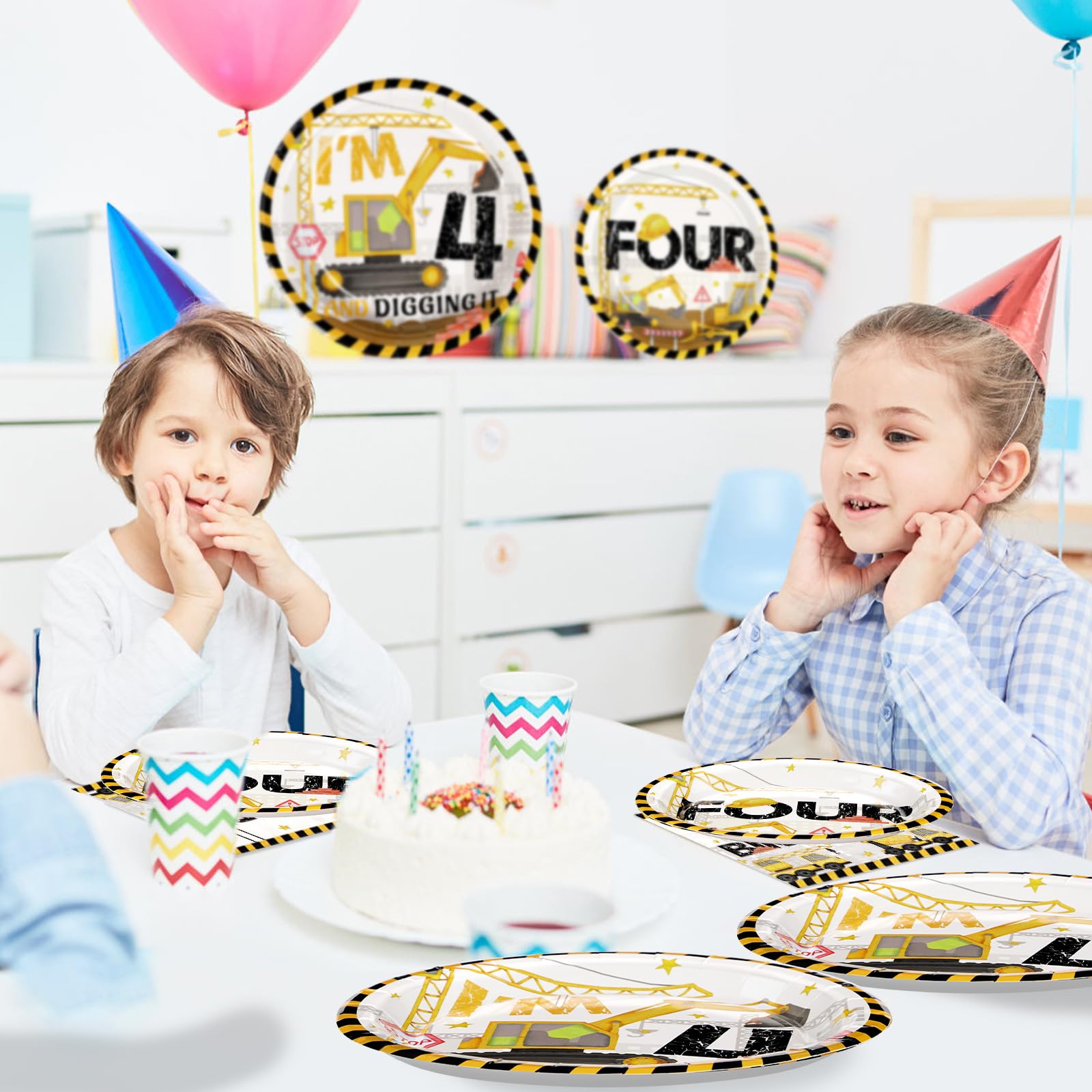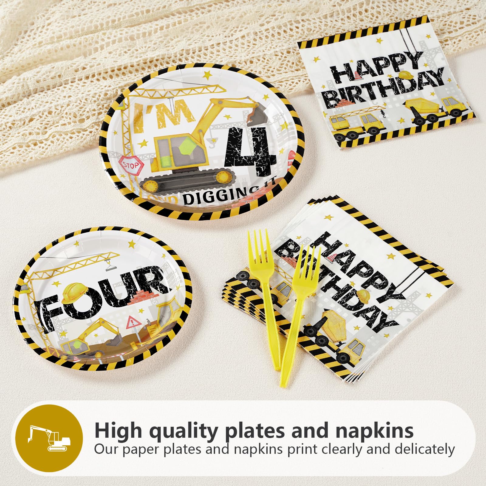 Construction Design: Our groovy plates and napkins features construction themed design, with dump truck, excavating machinery, large crane, and "I'm 4", "Four". The yellow and white colors add a touch of constructiong feature, setting a welcoming tone for your 4th birthday party