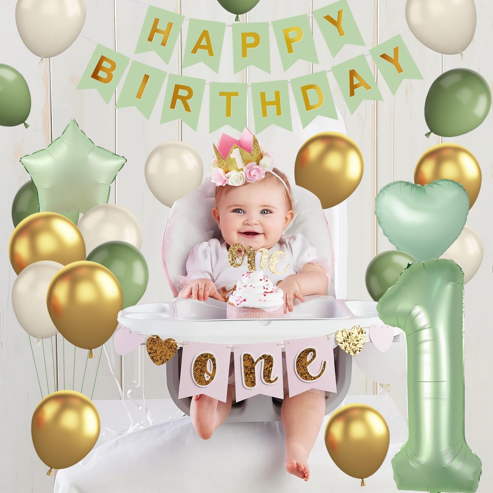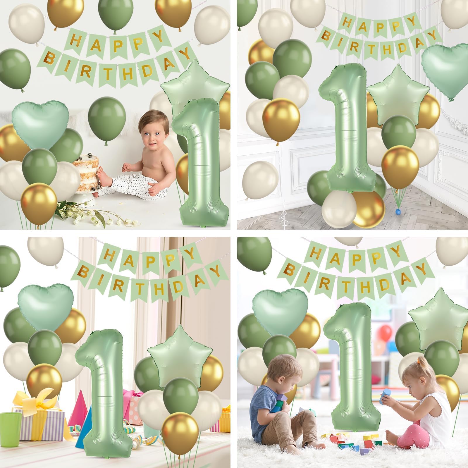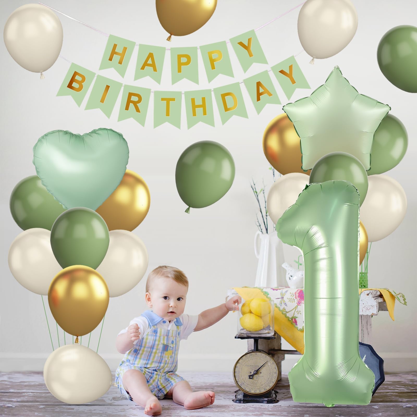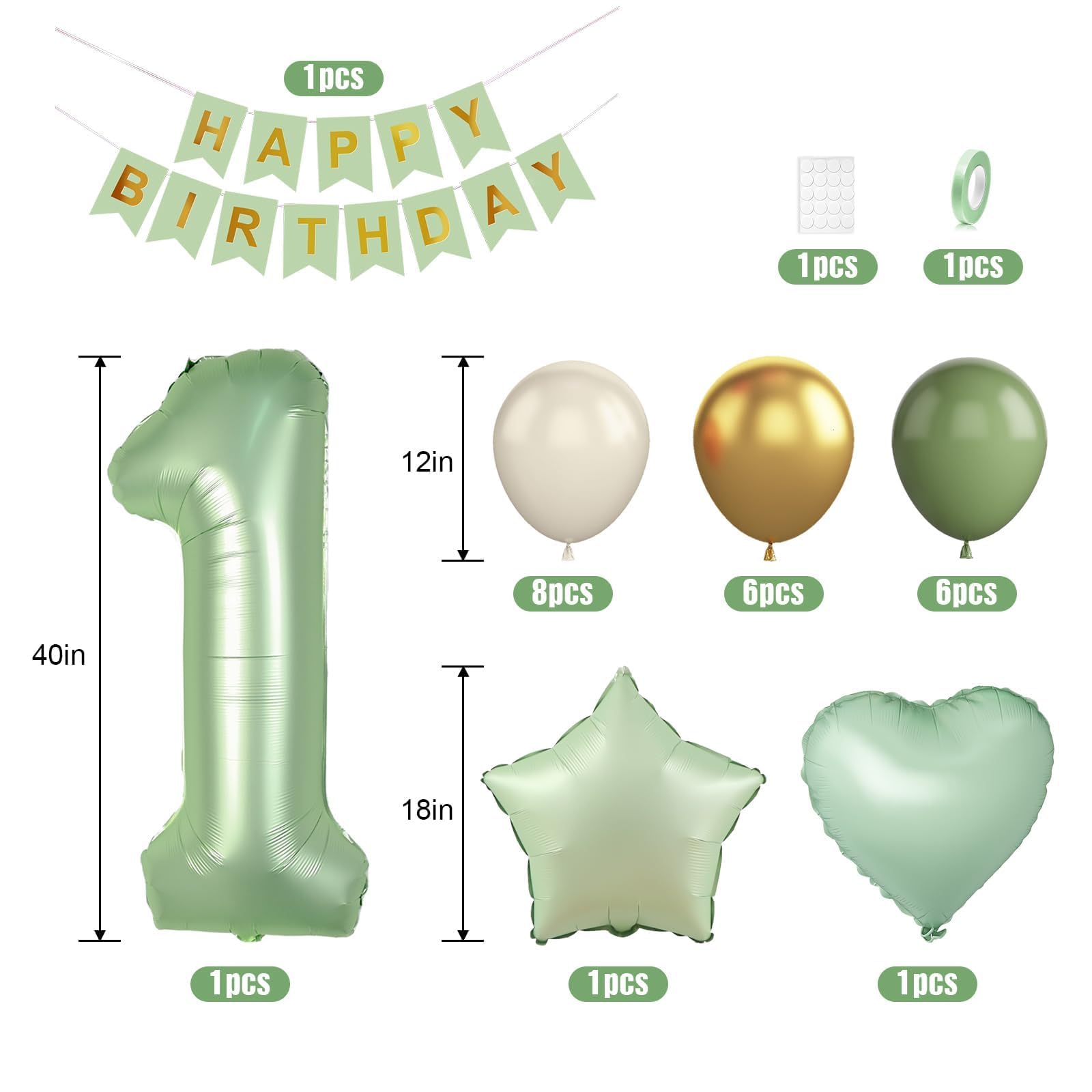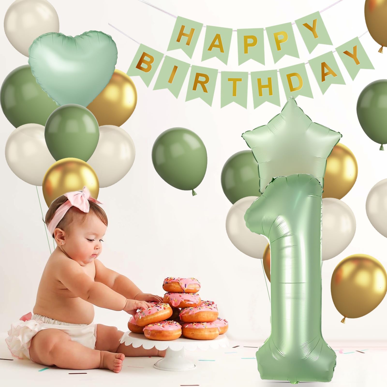 Sage Green 1st Birthday Decorations - You will get 1pc Sand White HAPPY BIRTHDAY banner, 1pcs 40 inch number 1 foil balloon, 1pcs Sage Green star foil balloon, 1pcs Sage Green heart foil balloon, 8pcs 12 inch Sand White balloons, 6pcs 12 inch Sage Green party balloons, 6pcs 12 inch Metallic gold balloons, 1pc Sage Green ribbon.