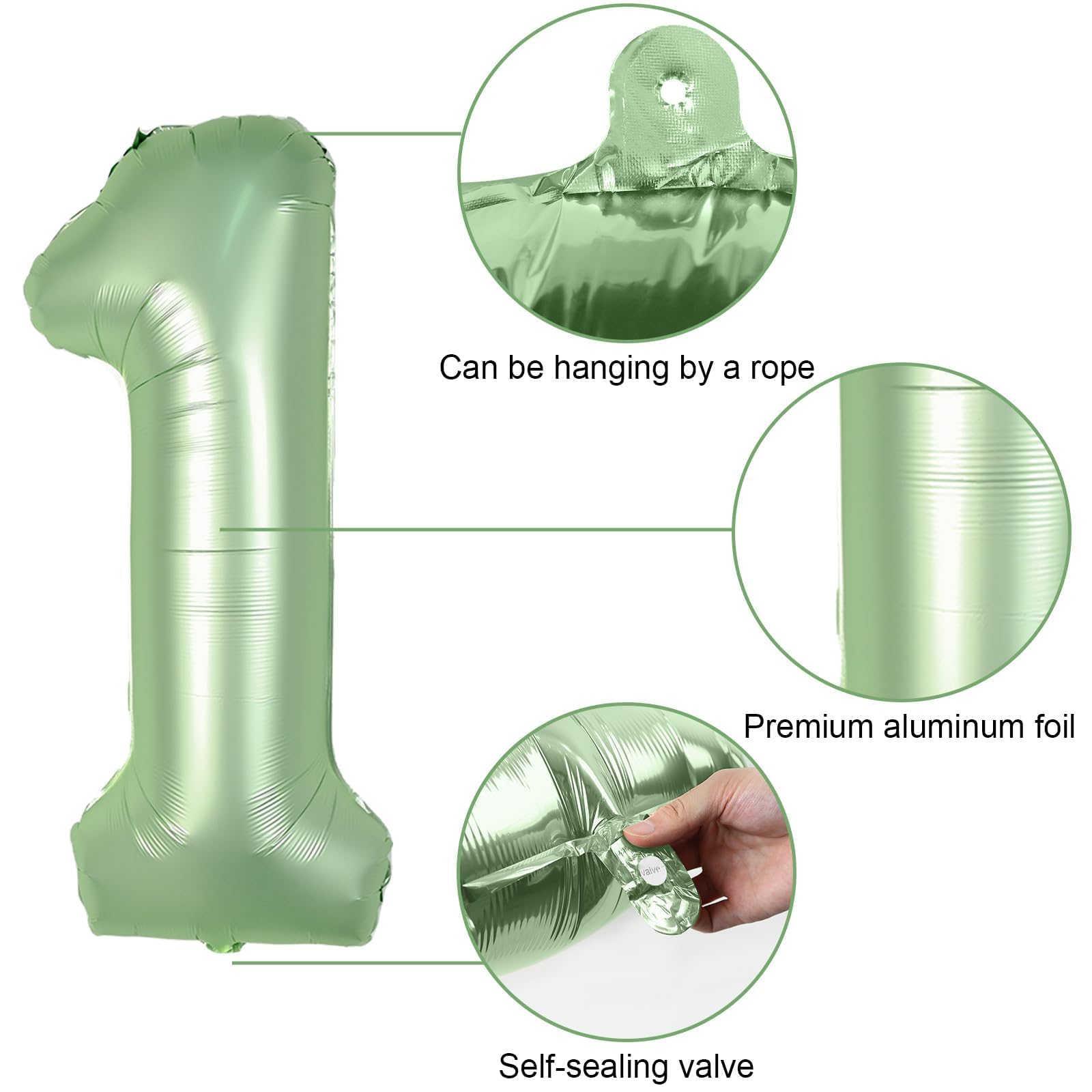 Easy to Use - Sage green one year old birthday balloons can be blown up with air or helium! The party balloons are extremely easy to inflate and string up. The number 1 foil balloons have self-sealing valve does not need to be knotted, Balloons filled with air will last a long time, very easy to assemble. Use an air pump to help you fix the shape of the balloon, saving time and having fun! You can use a straw to slowly deflate the white number balloons and fold them neatly for next time use.