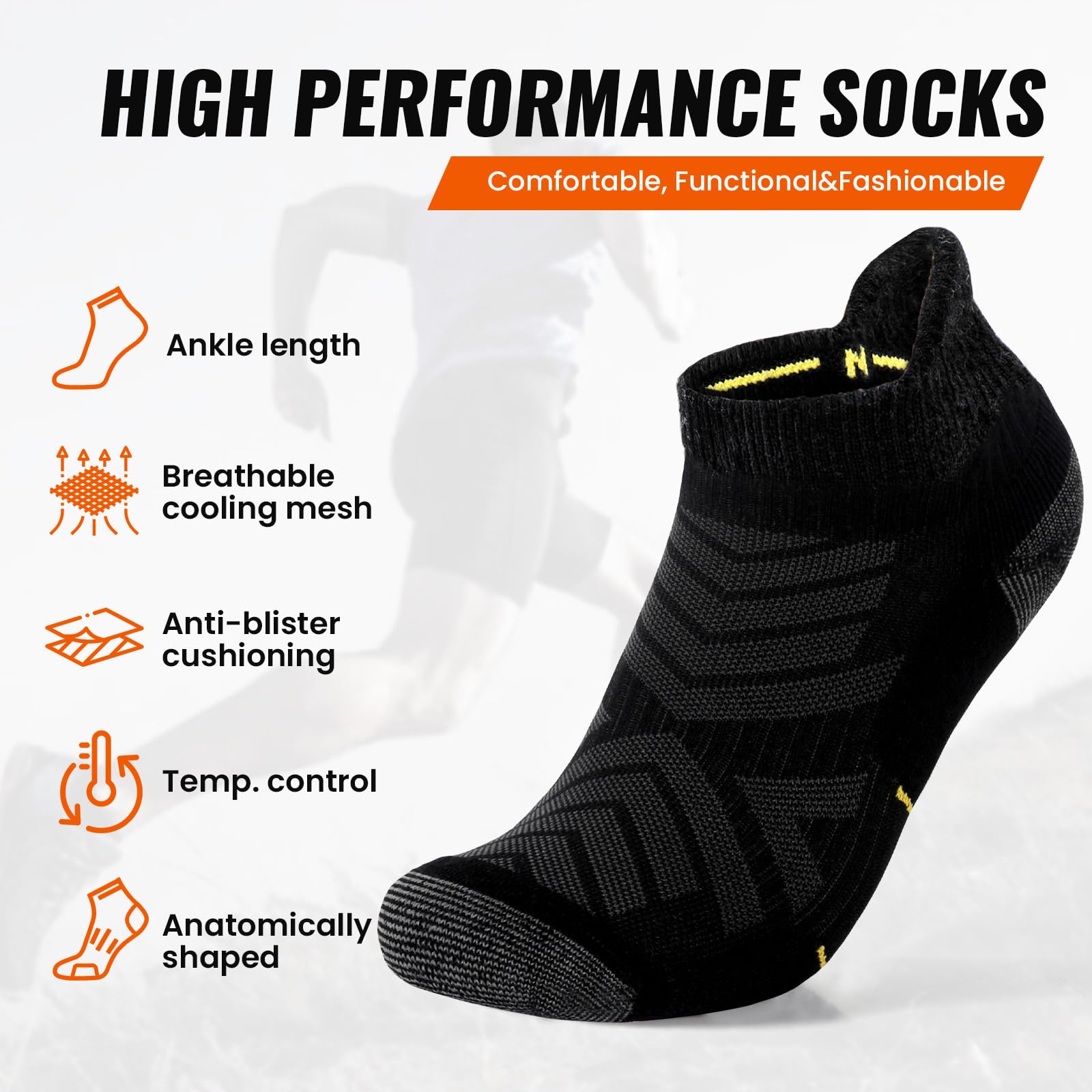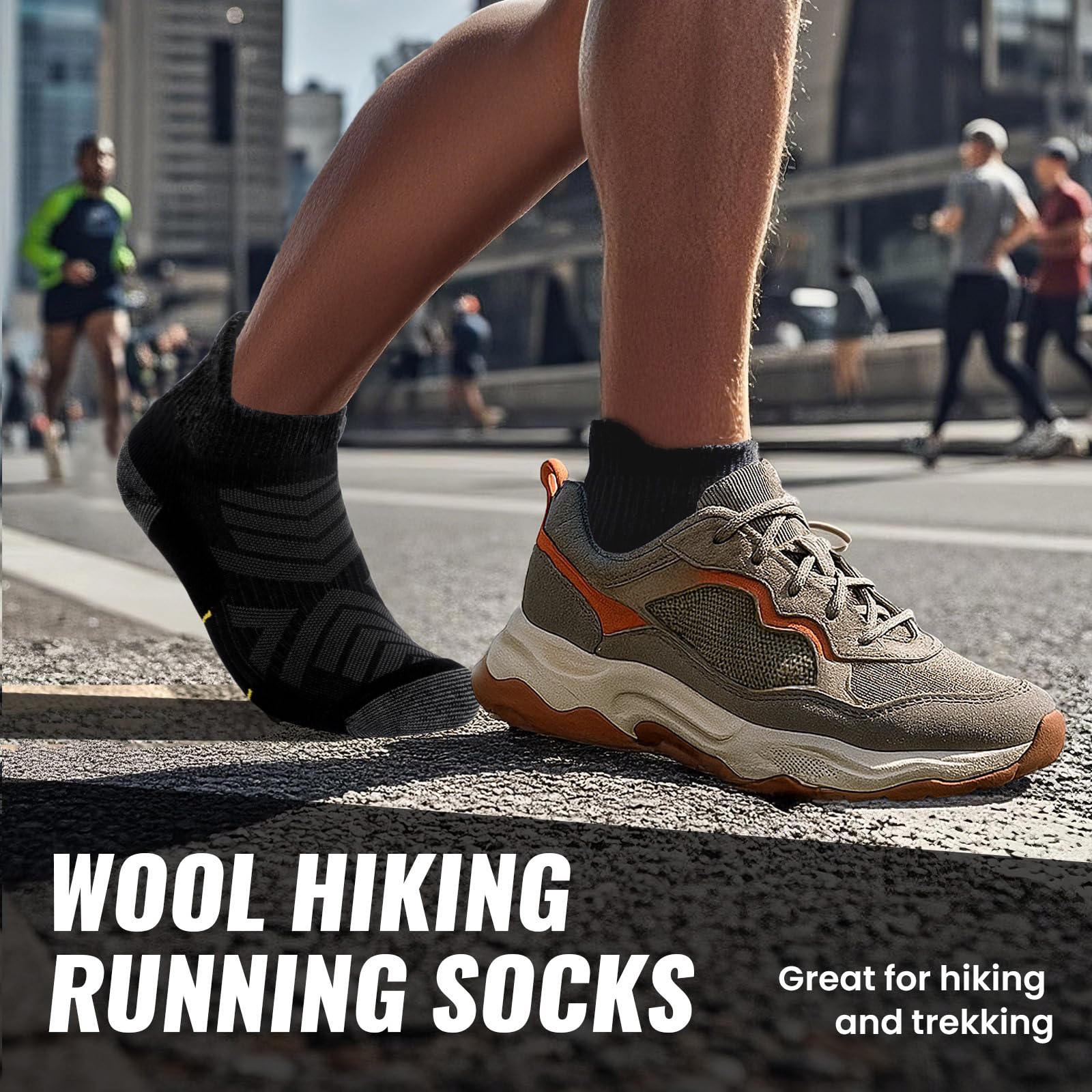 PROTECTION FOR FEET - These mens wool running ankle socks have stretchy cuff and arch support, which can have great compression support to reduce fatigue, protect the Achilles tendon, promote comfort during prolonged wear, and keep socks fit snugly. Cushioned sole absorbs shock and helps minimize blister risks during 10km+ hikes. Pull tab resist abrasion and prevent slipping. All of these provide more protection for your feet.