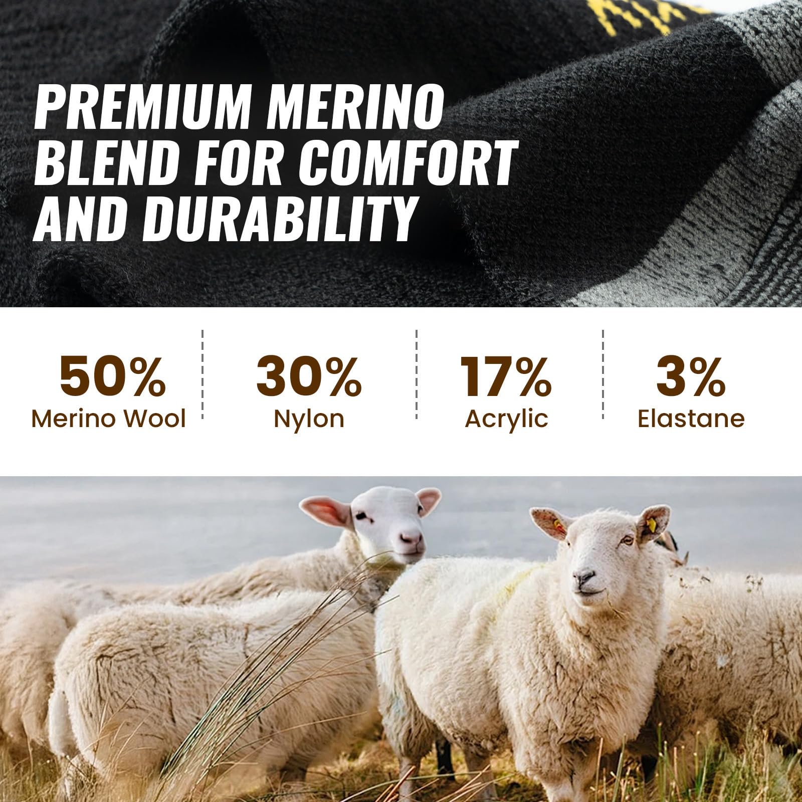 COMPOSITION - KACIIXAA hiking socks are made of 50% Superfine Merino Wool, 30% Nylon, 17% Acrylic, 3% Elastane, which are wearable and durable. Merino wool's natural thermoregulation adapts to and keep you warm, so you can wear them in different season.