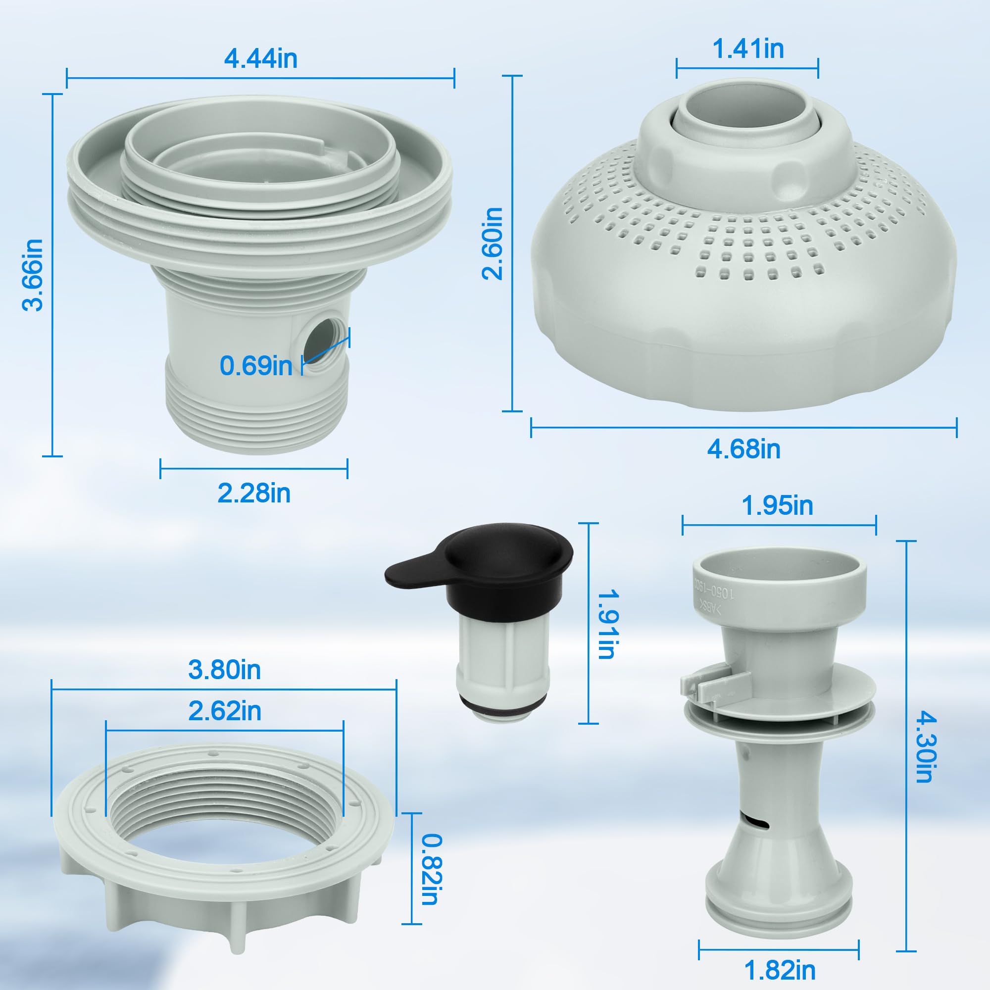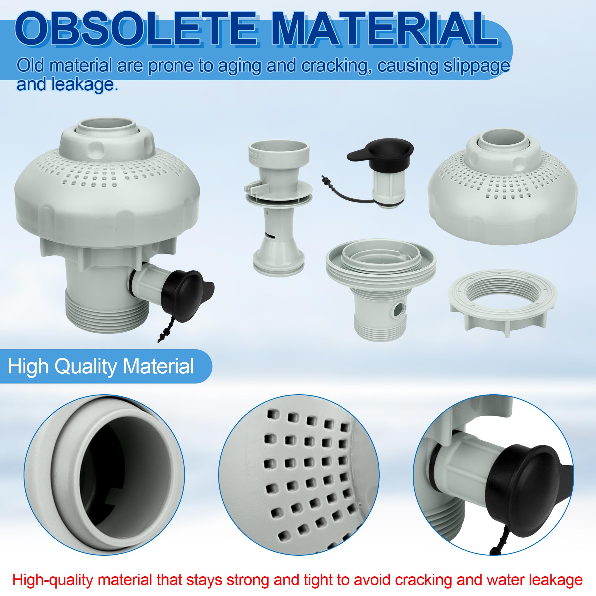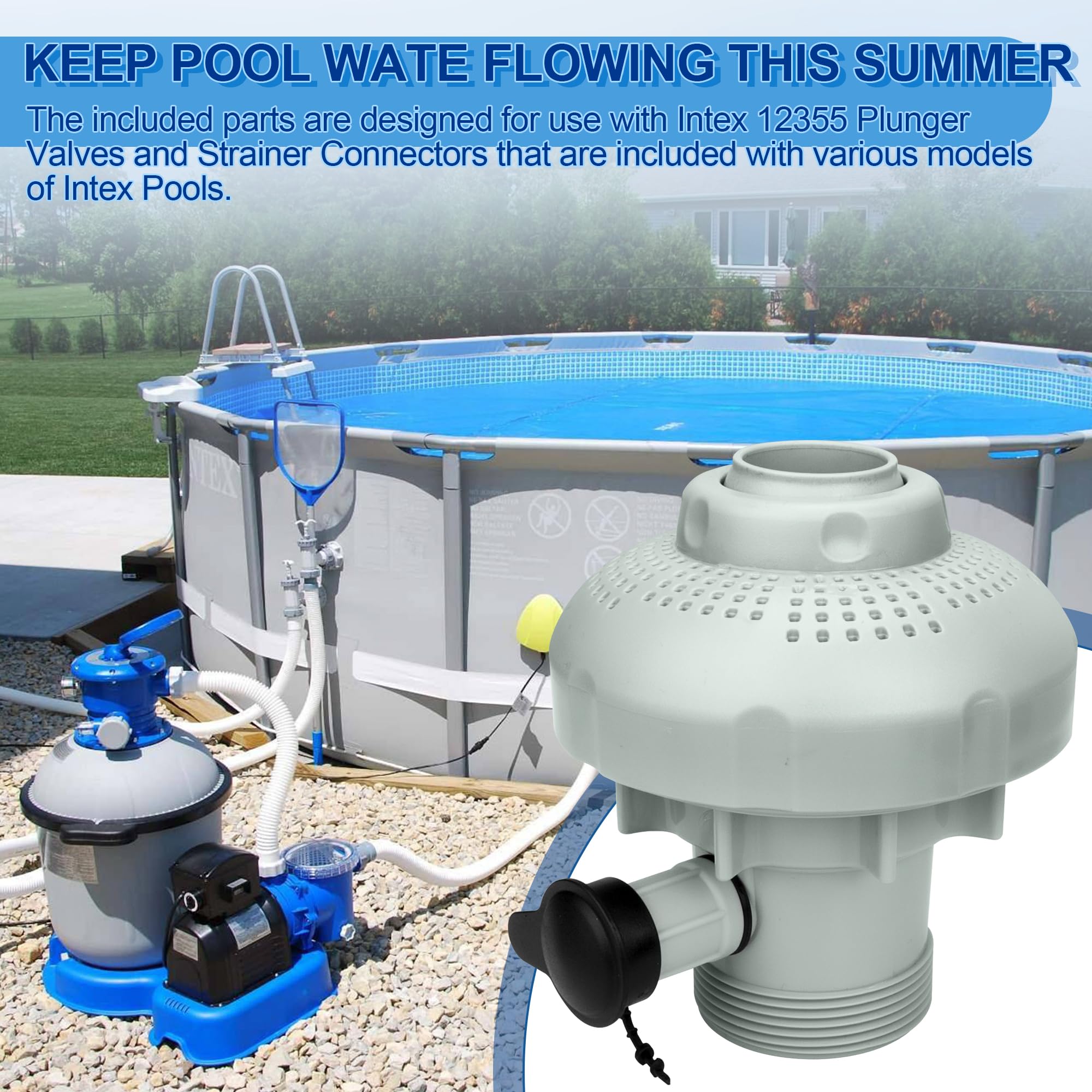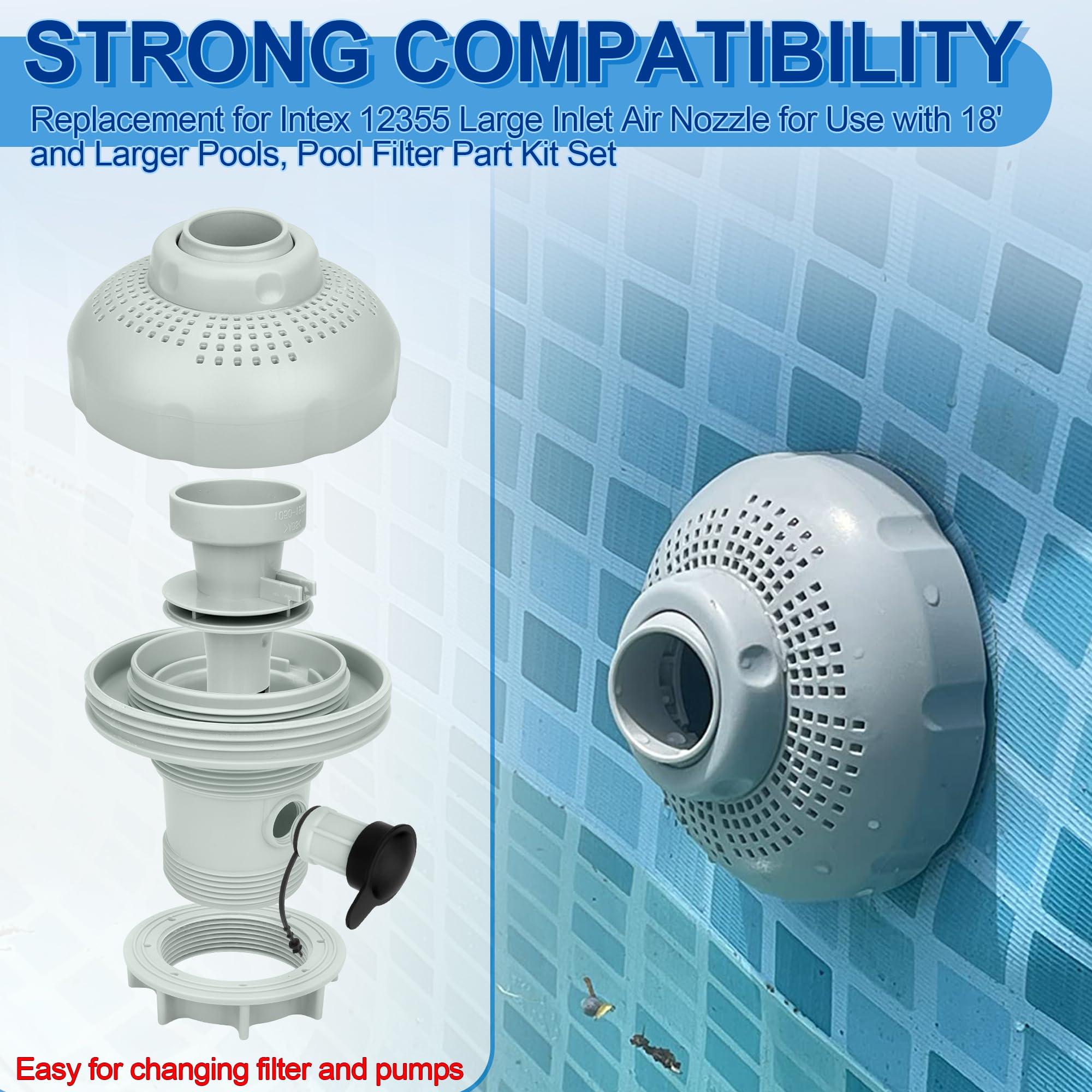 𝐏𝐞𝐫𝐟𝐞𝐜𝐭 𝐂𝐨𝐦𝐩𝐚𝐭𝐢𝐛𝐢𝐥𝐢𝐭𝐲: 12355 Large Inlet Air Nozzle Compatible with Intex 1900-2450gph pumps, Pool Filter Part Kit Set for Intex 18' and Larger Pools. Above-ground swimming pool inlet air-water jet part kit designed specifically for Intex above-ground pools. Suitable for friends who are looking for new pool inlet jet nozzles for Intex air jet valve to replace their broken split type hose plunger valve nozzles.