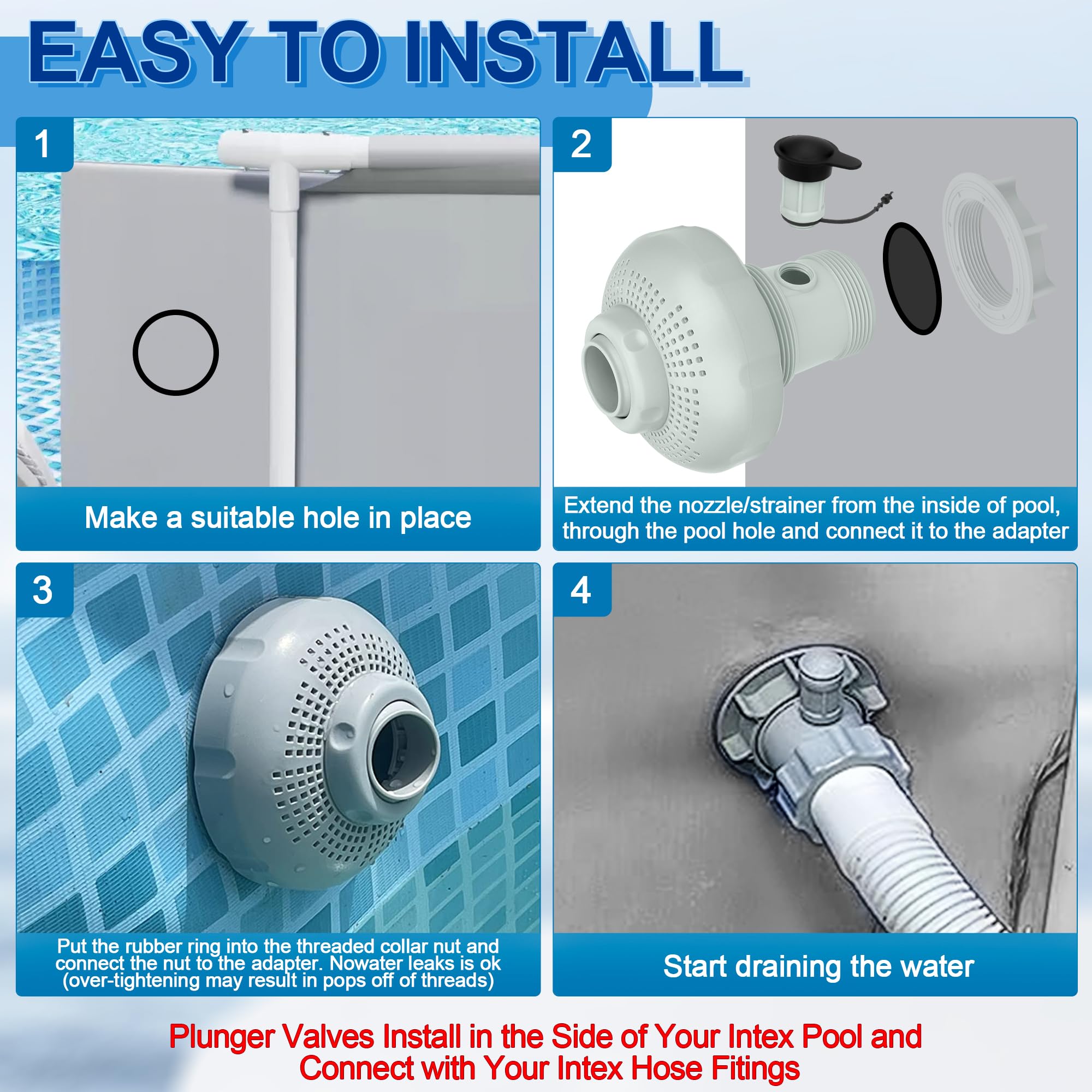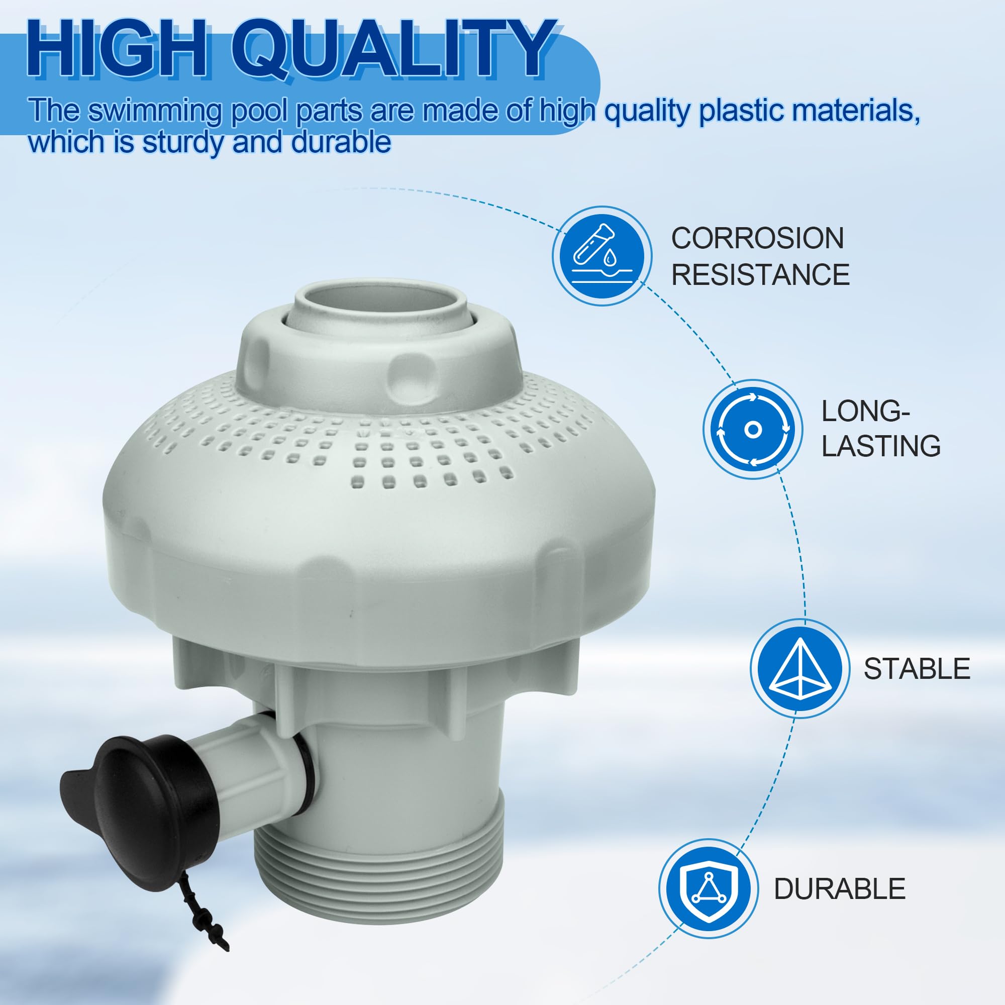 𝐄𝐚𝐬𝐲 𝐈𝐧𝐬𝐭𝐚𝐥𝐥𝐚𝐭𝐢𝐨𝐧: Above ground swimming pool inlet air-water jet replacement part is easy to install, The pool inlet air nozzle set can be installed with a plunger valve on the side of the Intex swimming pool and connected to the Intex Plunger Valve Connector use.