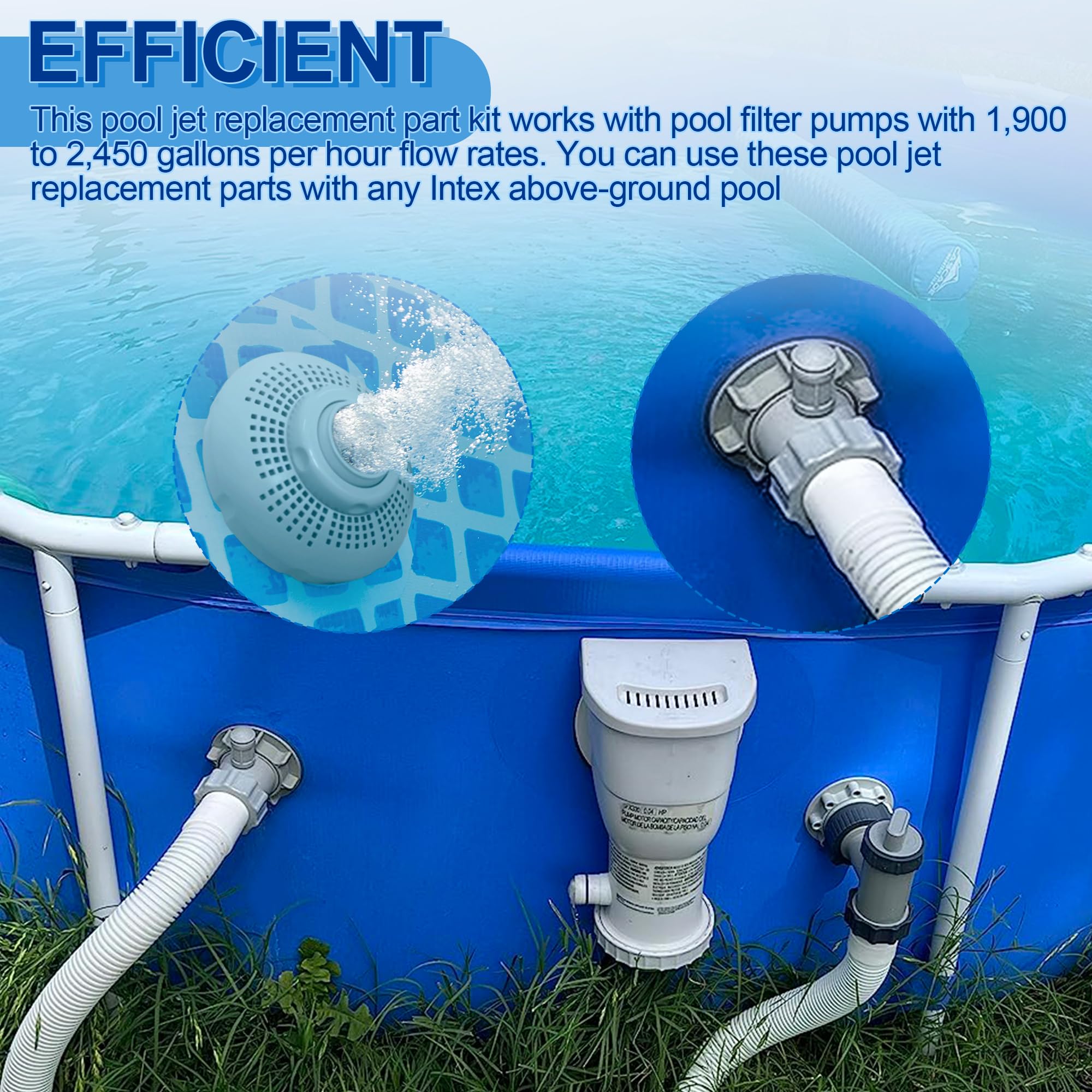 𝐇𝐢𝐠𝐡-𝐄𝐟𝐟𝐢𝐜𝐢𝐞𝐧𝐜𝐲 𝐉𝐞𝐭 𝐍𝐨𝐳𝐳𝐥𝐞: The pool jet replacement part kit is the perfect addition pool maintenance part, Used flexibly in the pool inlet and outlet. The swimming pool parts work with pool filter pumps with 1,900 to 2,450 gallons per hour flow rates. You can use these pool jet replacement parts with any Intex above-ground pool.