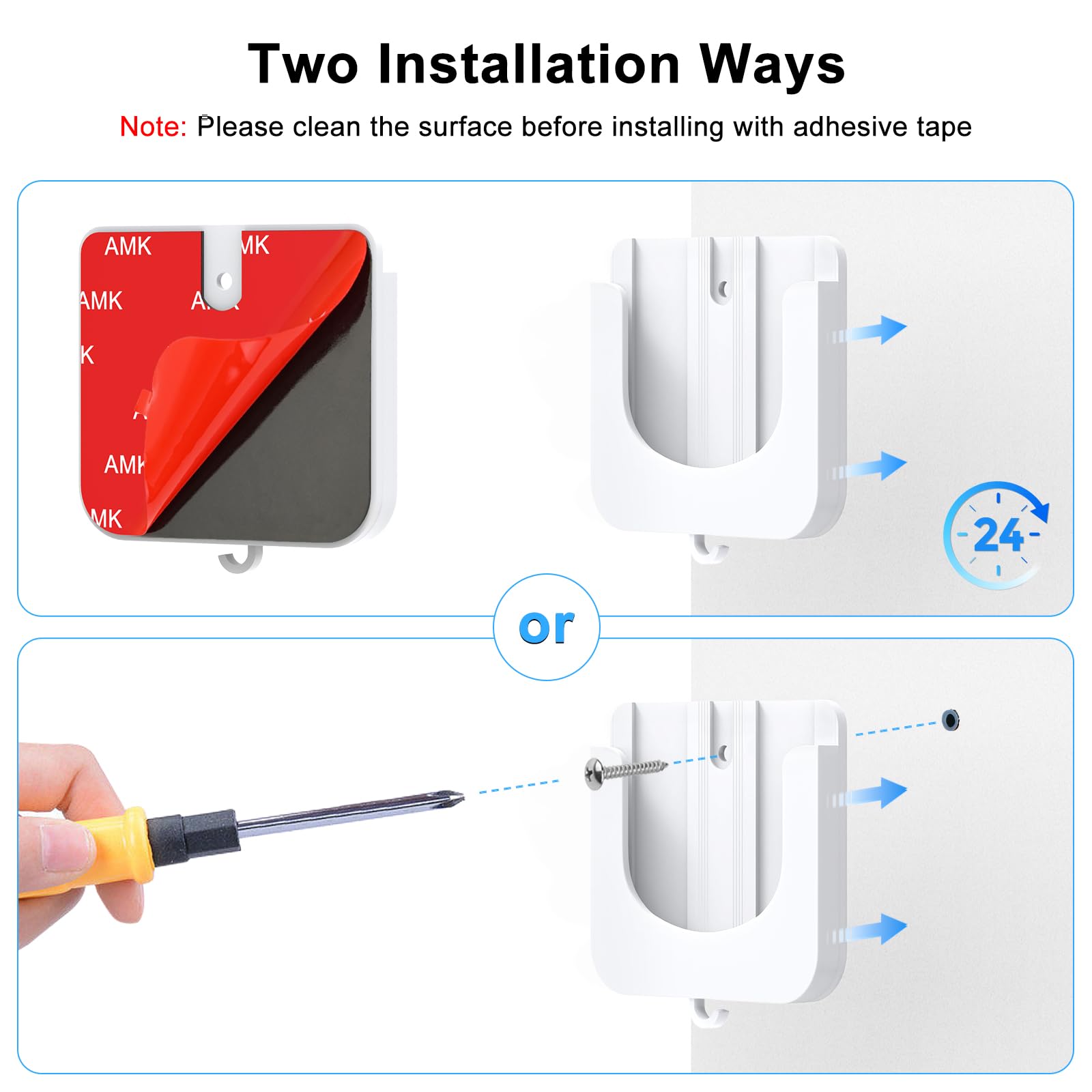 No Drilling, No Screws Wall Mount - Simply stick the tape to the backside of the mount and then remove the other side of the tape, place it in your desired position and let it stand for about 24 hours. Then slide the camera straight into the bay to the bottom.(Note: adhesive tape only for smooth surface like tile, metal, glass or laminates, please use screws for other surfaces.)