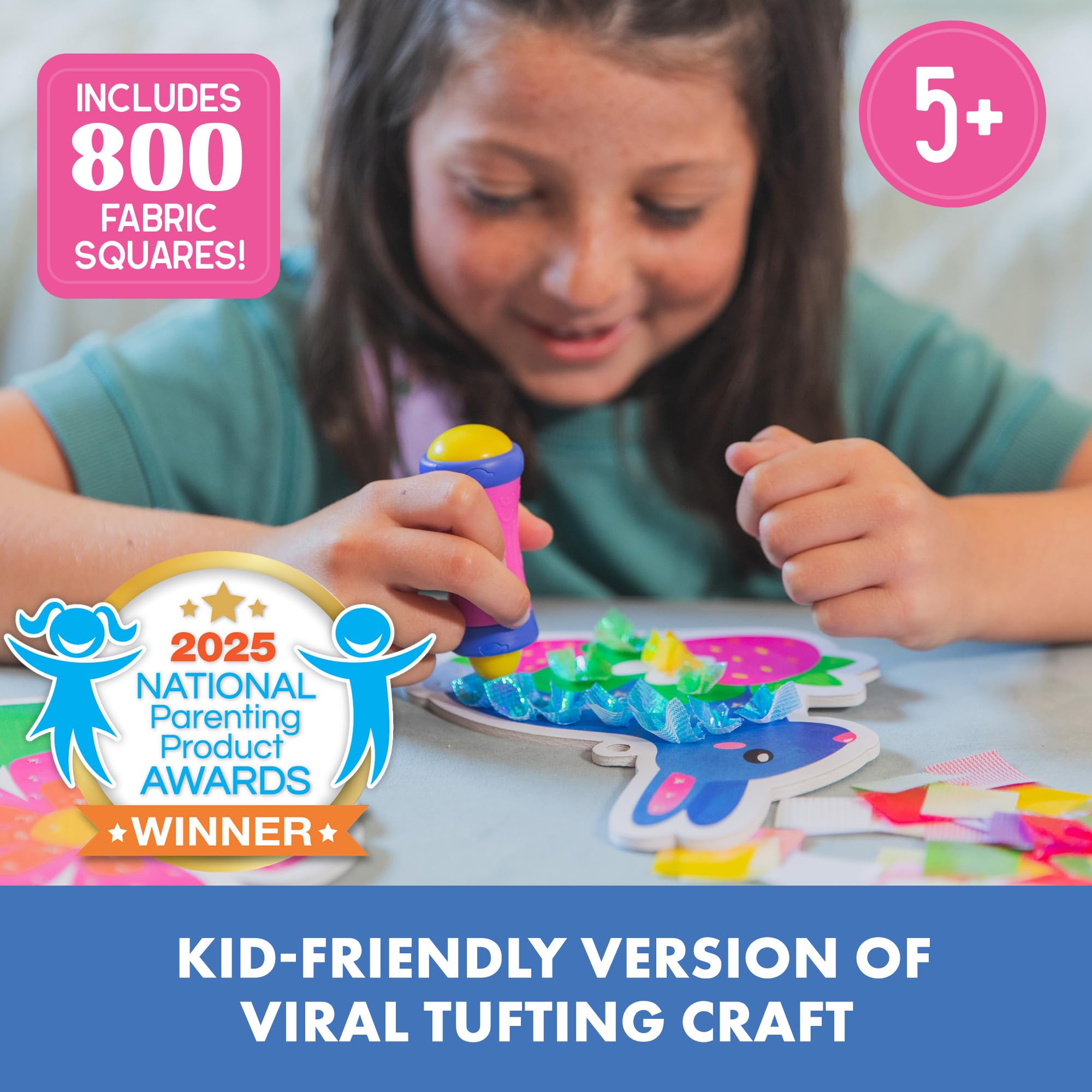 KID-FRIENDLY TUFTING TOOL: Use the tool to push fabric squares into the holes in each design card to create textured art (and develop fine motor skills!) with this art kit for kids