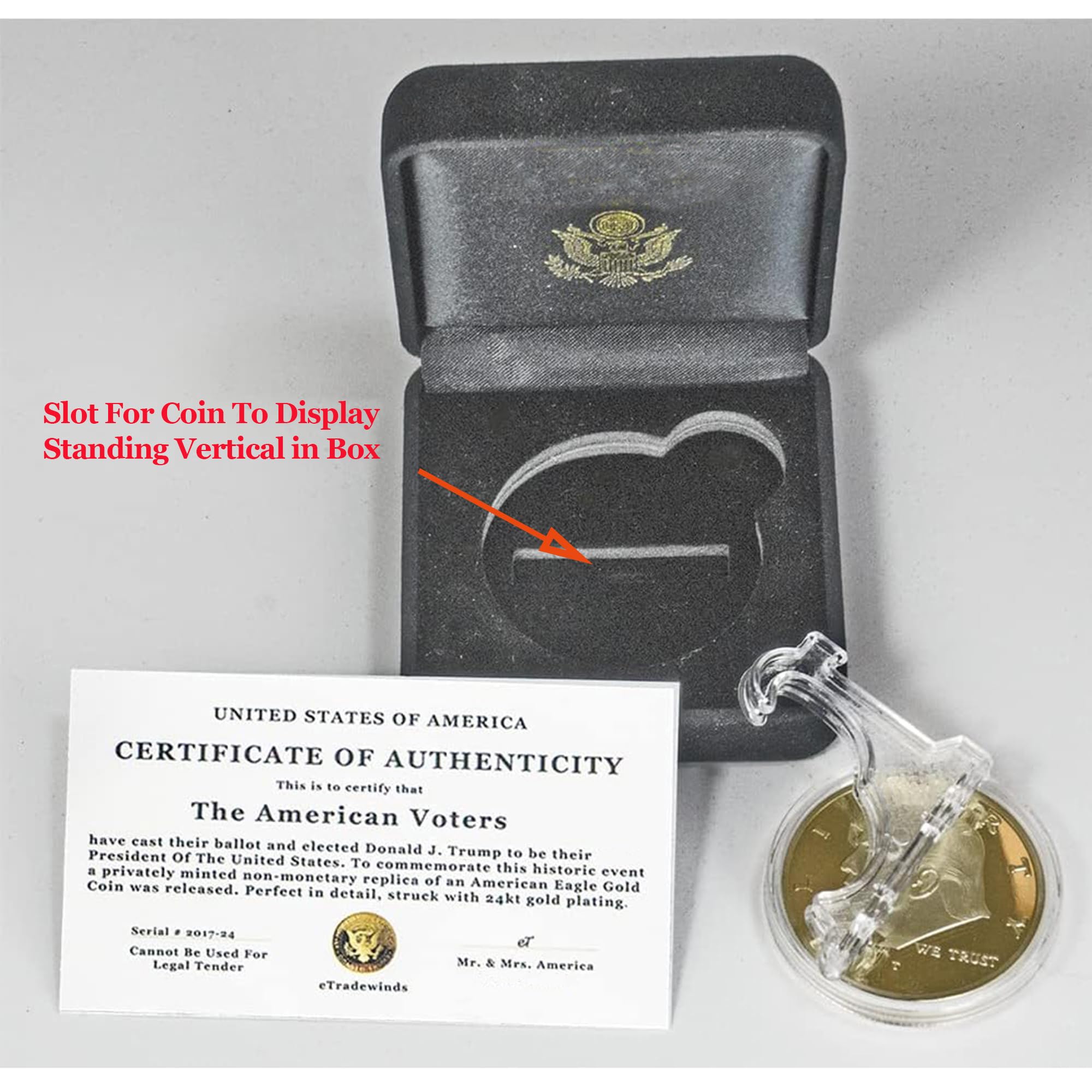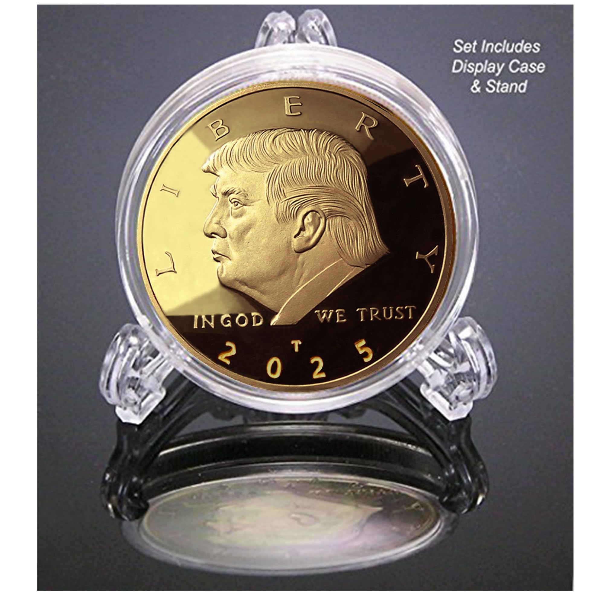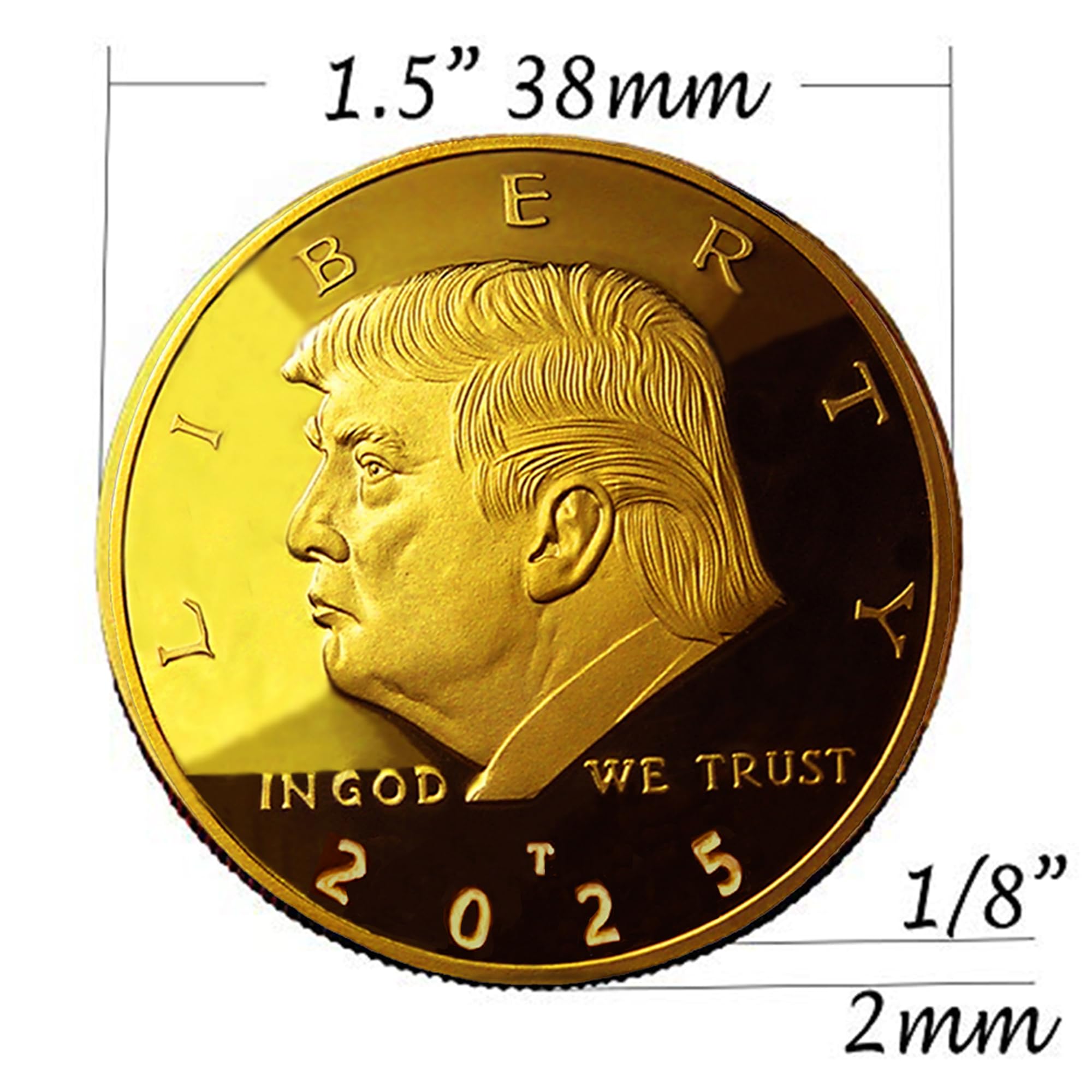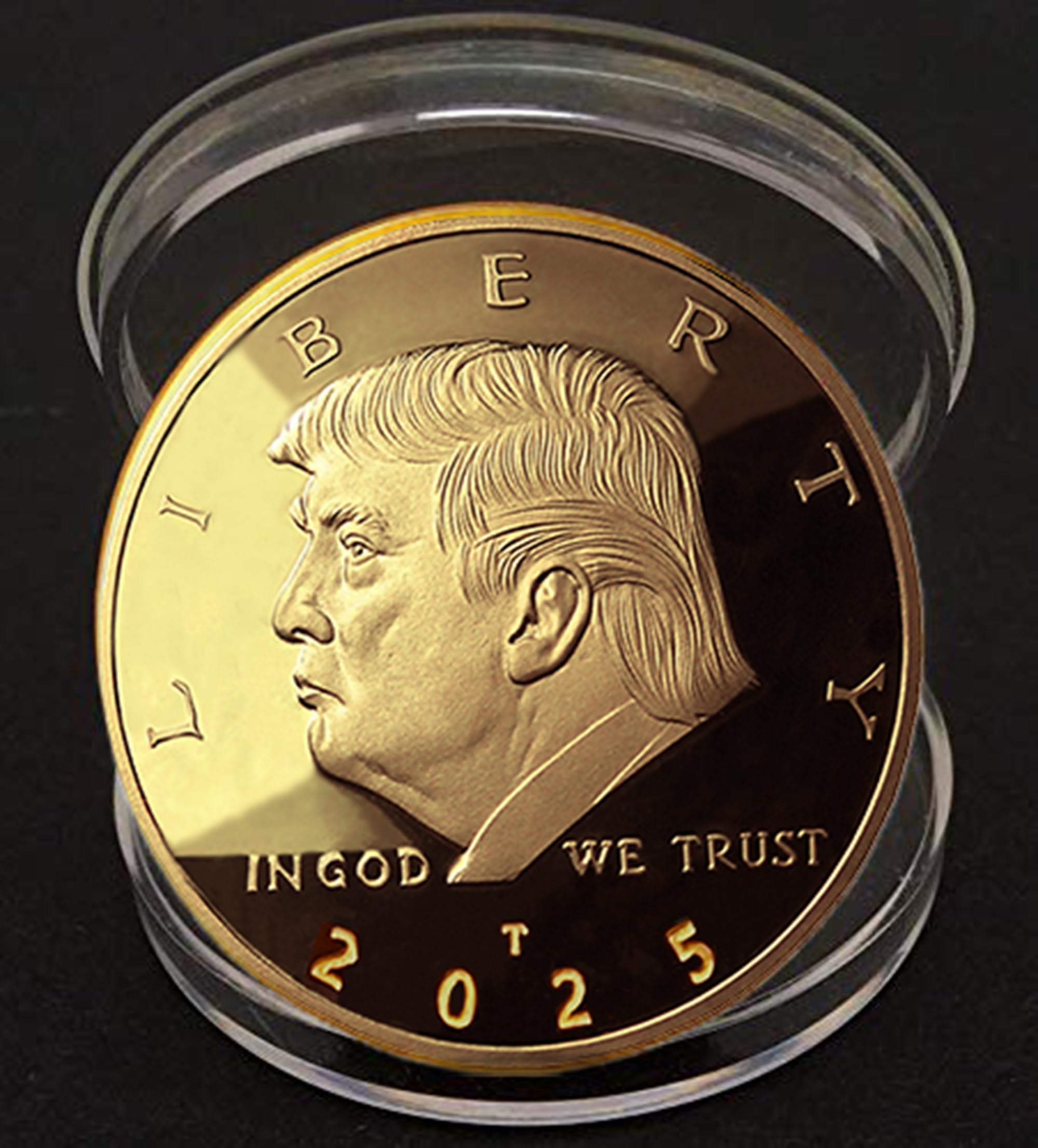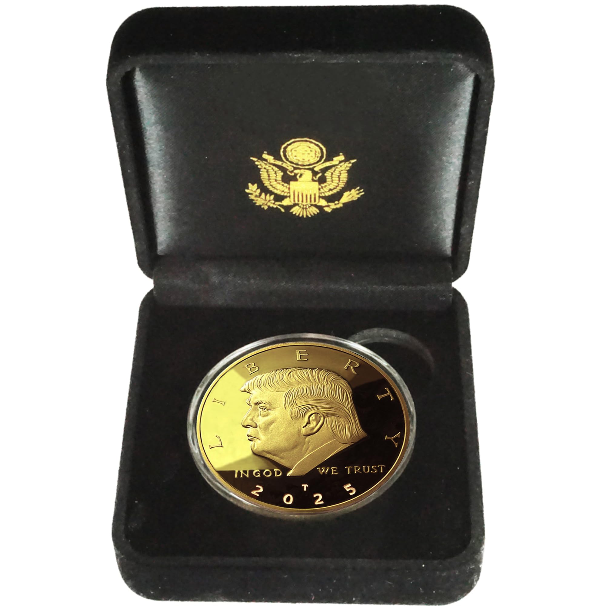 We are pleased to unveil the Original Donald J. Trump Gold Collectible: "2025 Liberty American Eagle" coin. This remarkable piece offers you an exclusive chance to own the groundbreaking 47th Liberty Eagle Gold Piece, presented in luxurious velver display case which adds a touch of elegance. This Limited Edition, privately minted gold round features a dazzling, proof-like finish that accentuates its intricate detail, portraying the artistry involved in its creation. Measuring 38mm in diameter and weighing a full ounce, this coin is not only a brilliant display piece but also comes with a protective coin capsule creating an airtight display case, ensuring that it remains in pristine condition for years to come. The 2025 Limited Edition Donald J. Trump Liberty American Eagle is a striking 1-ounce gold piece plated with luxurious 24k gold. This stunning coin is a genuine, high-quality replica of the celebrated American Eagle design, crafted as a non-monetary commemorative item. It includes a reversible certificate of authenticity, guaranteeing its provenance, along with a stylish display stand for showcasing this impressive piece. This exceptional coin is a perfect gift for avid collectors and presents a unique opportunity to enhance your collection with something truly special. Show your unwavering support for Donald J. Trump's exceptional leadership with this beautiful 24k gold-plated, non-circulated collector’s edition. This is more than just a coin; it’s a symbol of your commitment and pride. Don’t miss out on the chance to own a piece of history!