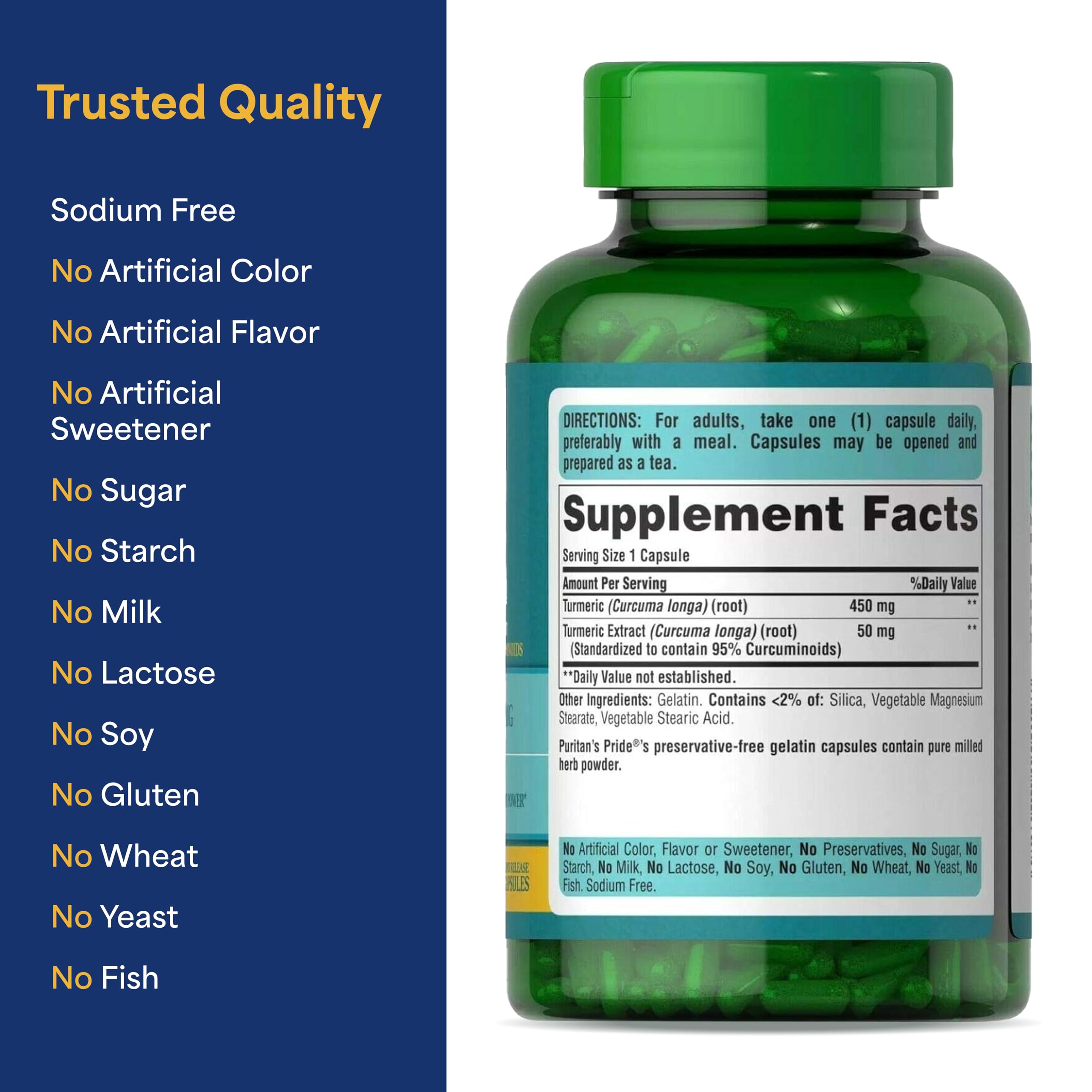 STANDARDIZED FOR POTENCY: Each capsule delivers 500 mg of Turmeric, with 50 mg of Turmeric Extract standardized to 95% curcuminoids