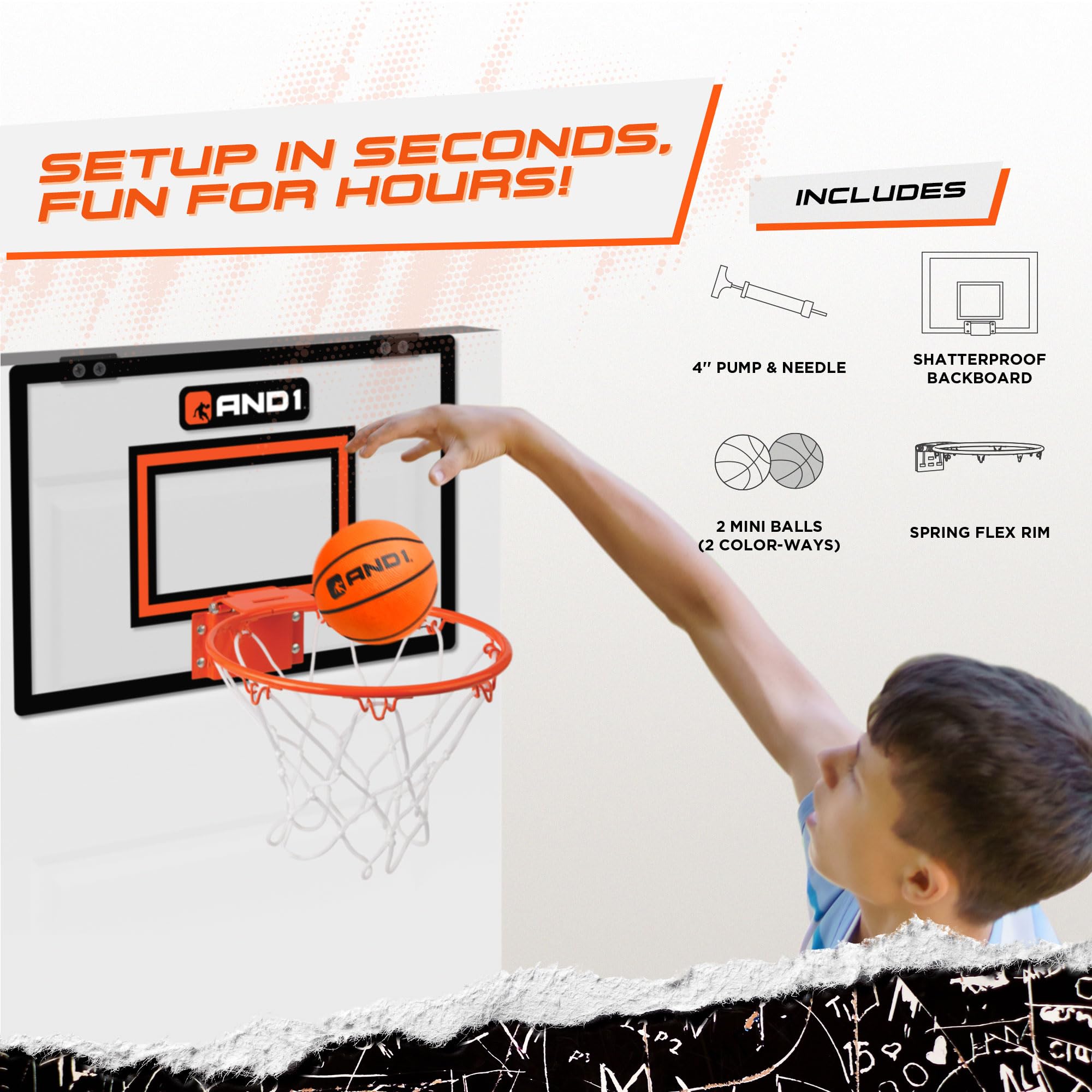 MAXIMUM DURABILITY AND DOOR PROTECTION: Safeguard your door while indulging in mini basketball games with the AND1 Mini Hoop. The professional-grade shatterproof backboard ensures durability, and the foam-padded backing protects your door, making it a top choice for an indoor basketball hoop.