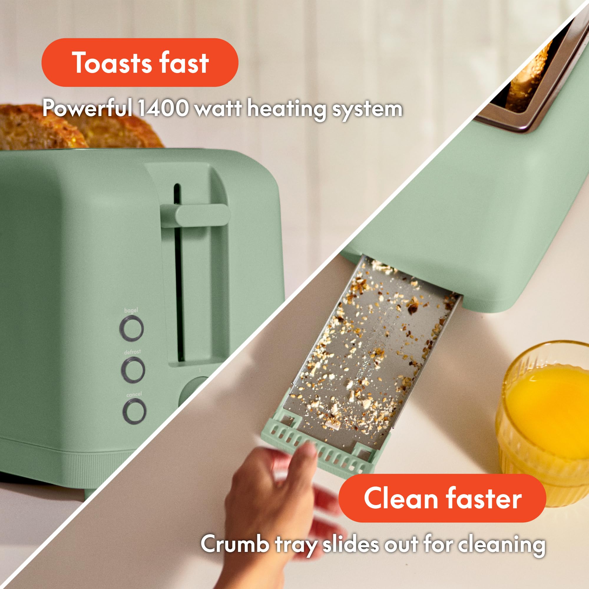 Introducing the bella 4-Slice Slim Toaster, where innovative design meets ultimate functionality. With a unique 10-inch long slot, this bagel toaster effortlessly accommodates two slices of square bread side by side or a variety of artisanal breads, sourdough, bagels, baguettes, and thick Texas-style toast. The wide toasting space and slim 6.14" profile make it a perfect fit for any kitchen, combining versatility with space-saving efficiency. Control your toast exactly the way you like it with the 6-setting shade selector, plus Reheat and Cancel functions for precise browning. The high lift lever ensures easy access to smaller items like English muffins, while the auto-centering guides keep everything perfectly aligned for even toasting every time. Cleaning this toastie maker is a breeze with the removable slide-out crumb tray, and the anti-jam and auto shut off features provide added safety and peace of mind. Powered by a 900-watt toasting system, this toaster delivers quick and consistent results. Available in five stylish bella colors—Oatmilk, Surf, Plum, Seaglass, and Blossom—the long slot toaster is a modern, practical addition to any kitchen, offering both functionality and aesthetic appeal.