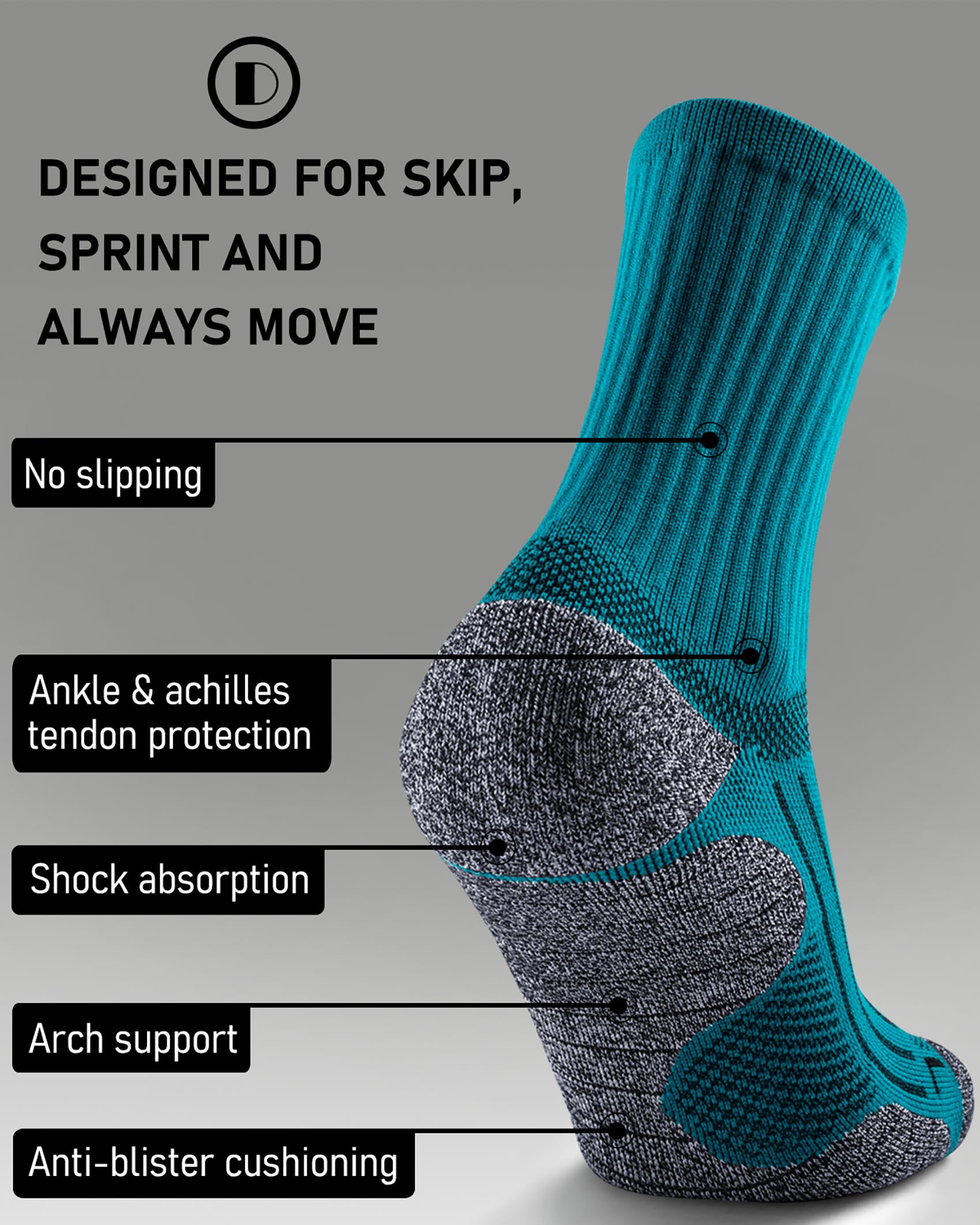 Targeted cushioning and compression, shock absorption, anti blister, arch support, ankle and achilles tendon protection