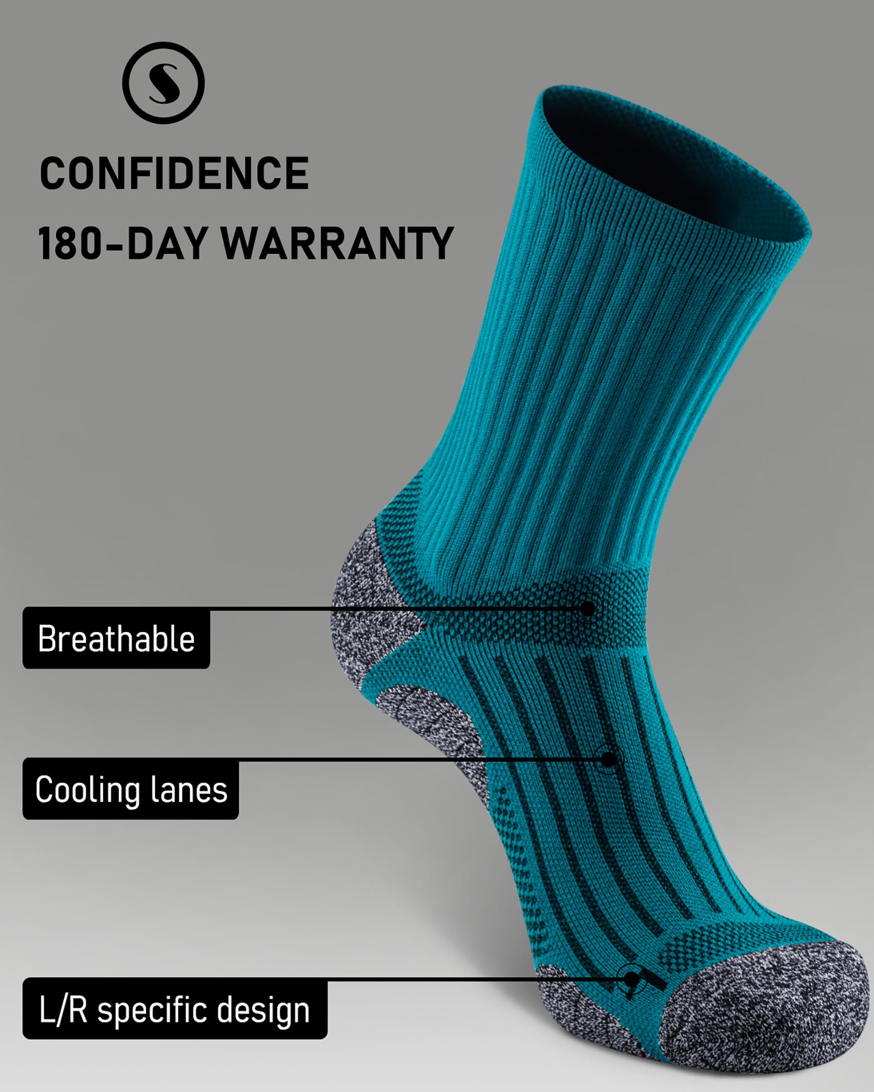 Ergonomic left and right foot design for a better fit; reinforced smooth toe seam structure to avoid hurting skin; breathable mesh to keep dry all day