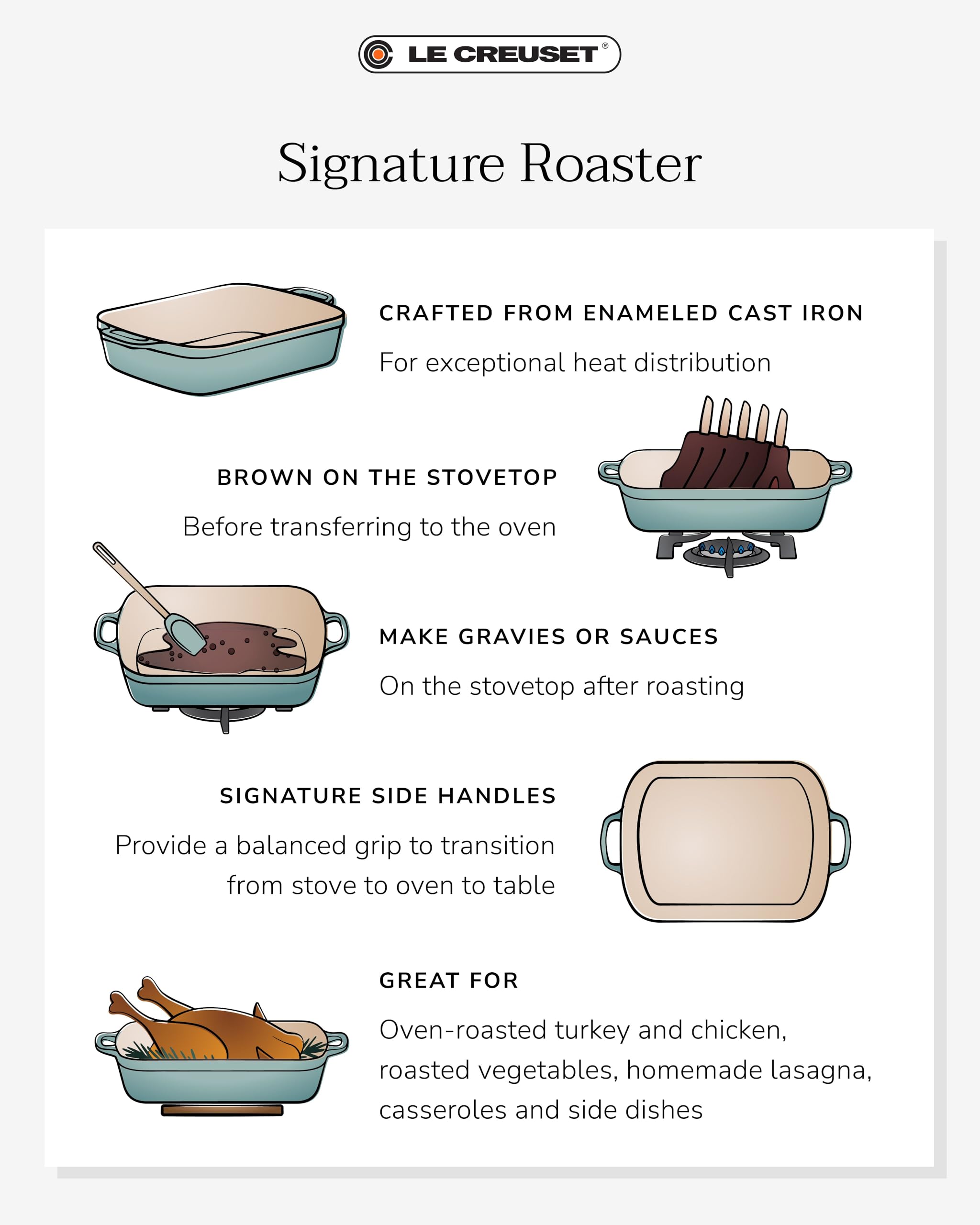The even heat distribution of this versatile enameled cast iron roaster makes it ideal for oven-roasted chicken breasts, homemade lasagna, casseroles and side dishes. Taking a Cue from our iconic French ovens, we've added our signature loop handles for easier lifting when wearing oven mitts.