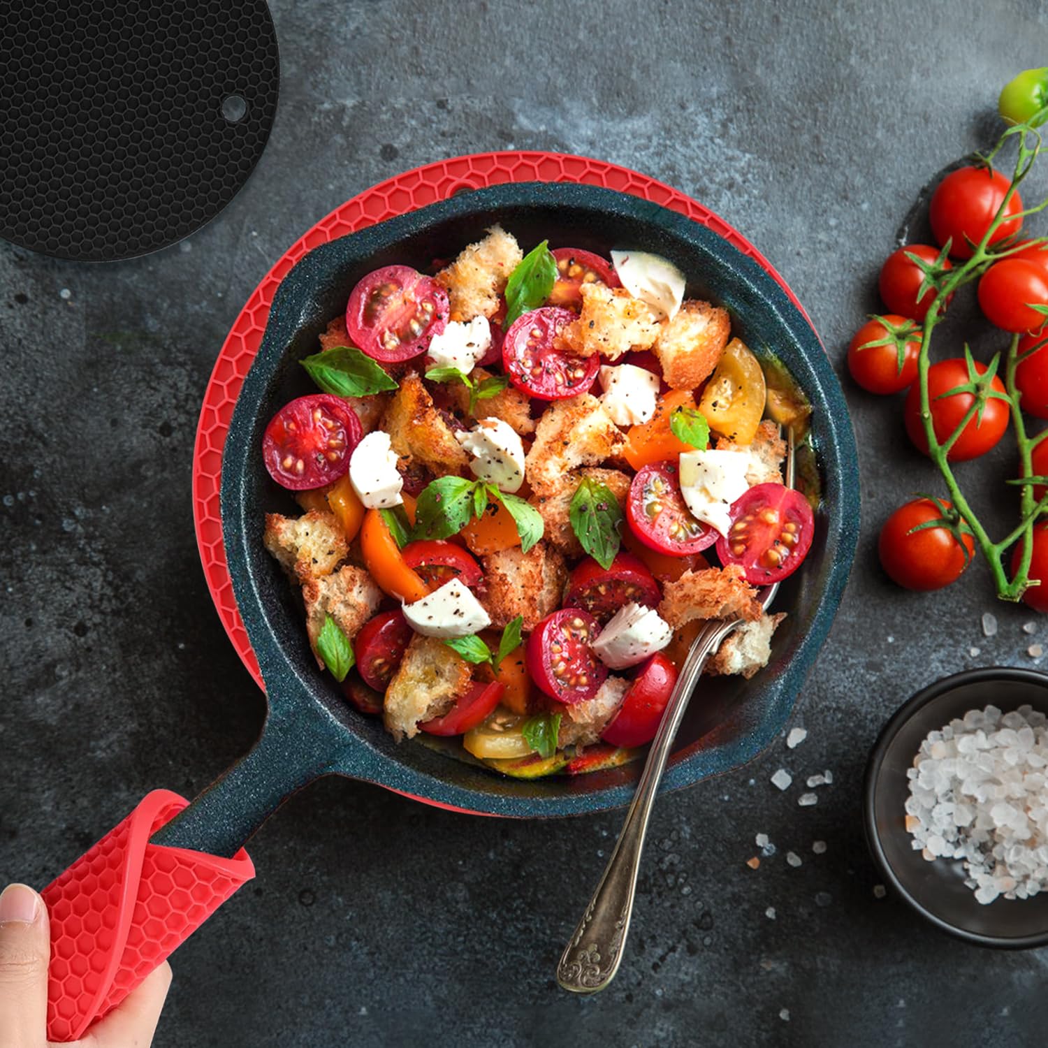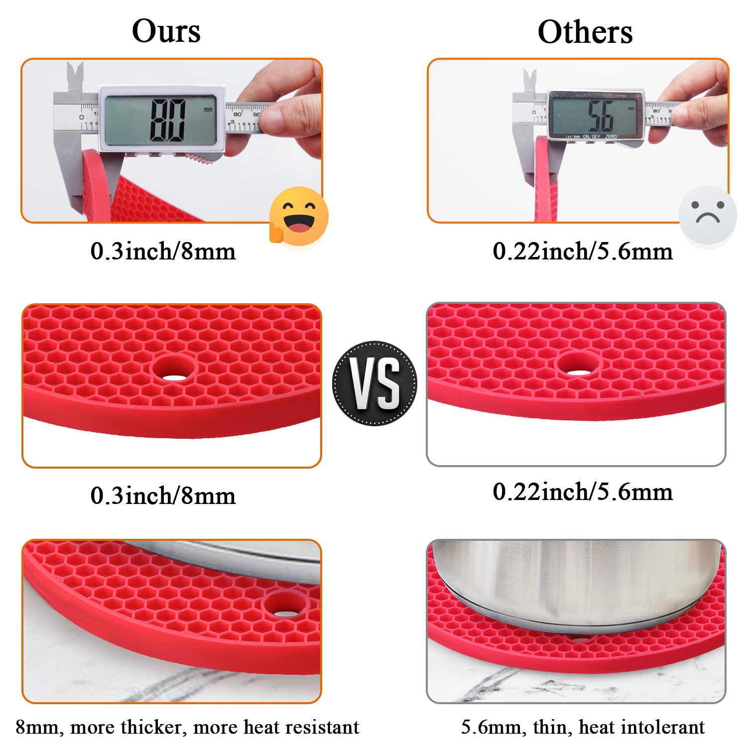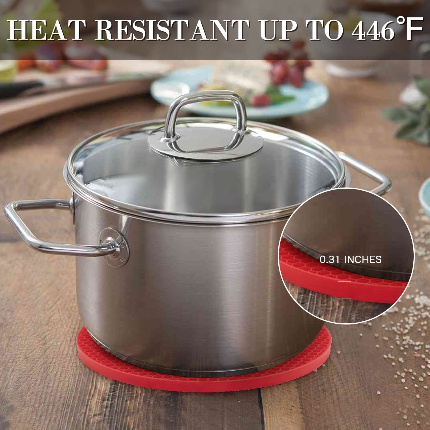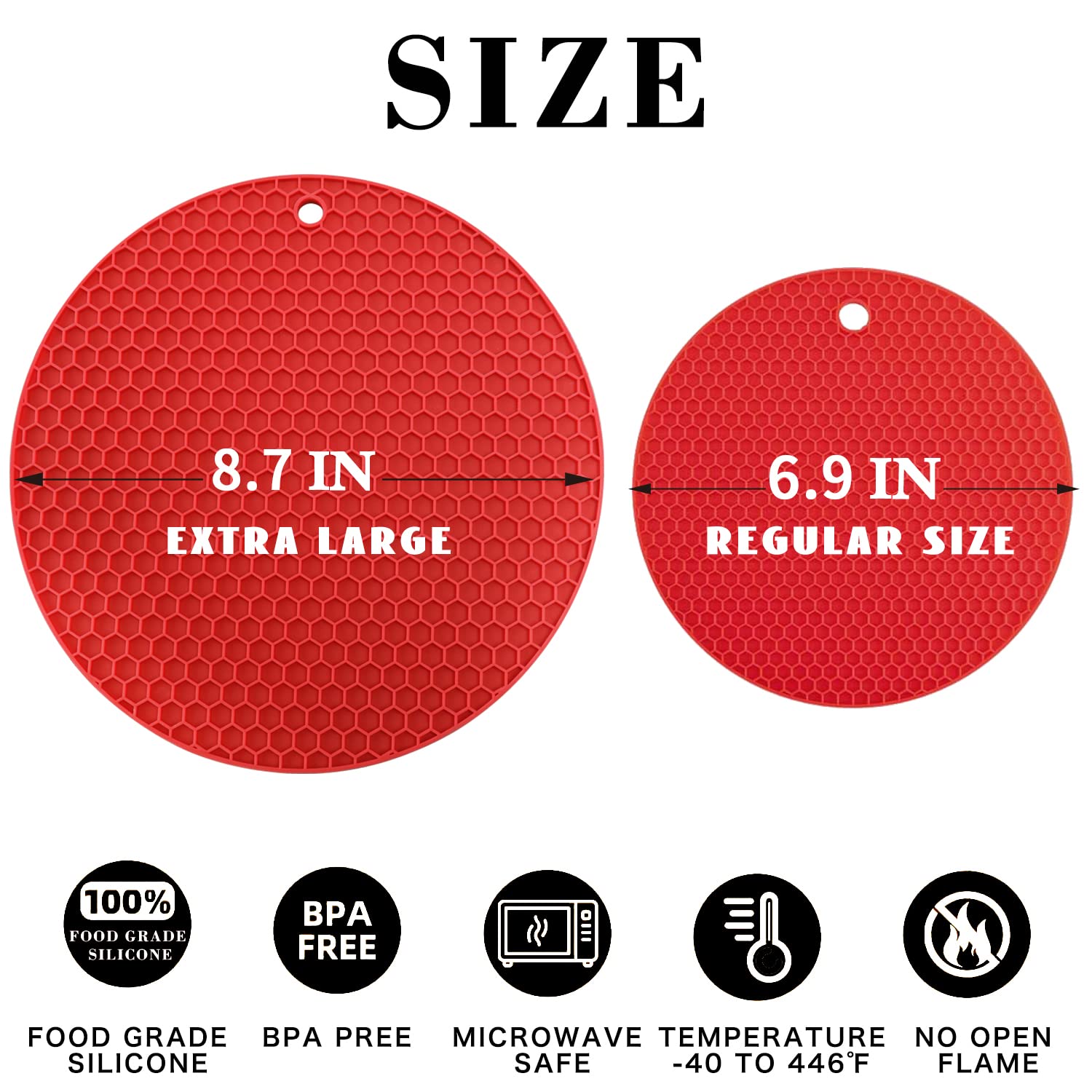 đăPERFECT DESIGN &COMBINATIONă:Honeycomb graphic design gives the kitchen nature symbol, means no more spills for liquids, and offers a nonslip surface; the red hot pads for table can distribute heat to protect our hands and provide insulation protects the countertop. Include 2pcs 6.9'' regular and 2pcs 8.7'' large red silicone trivets for hot pots and pans, suitable for small plates or large casseroles.
