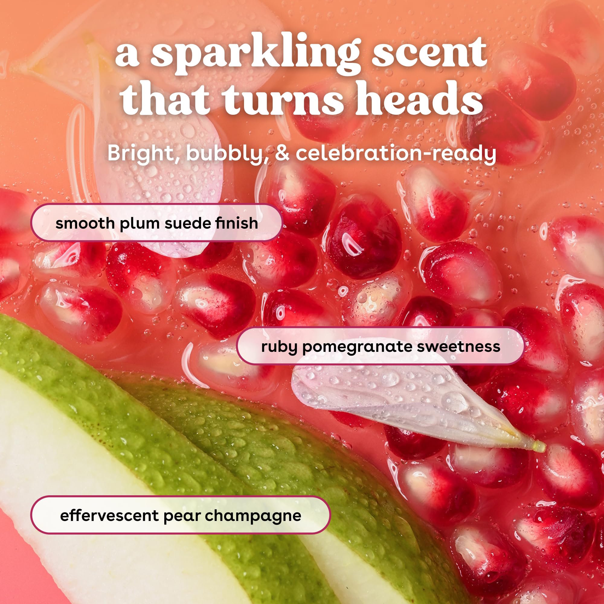 PINK CHAMPAGNE: Features notes of pear champagne, ruby pomegranate & plum suede
